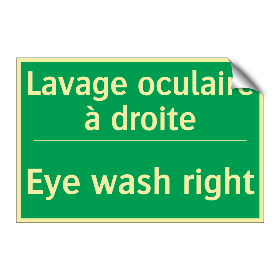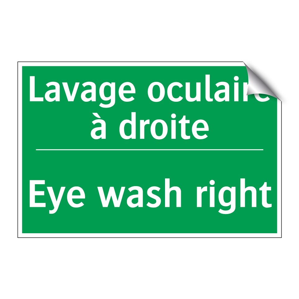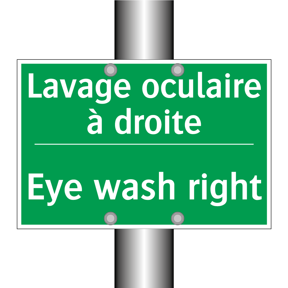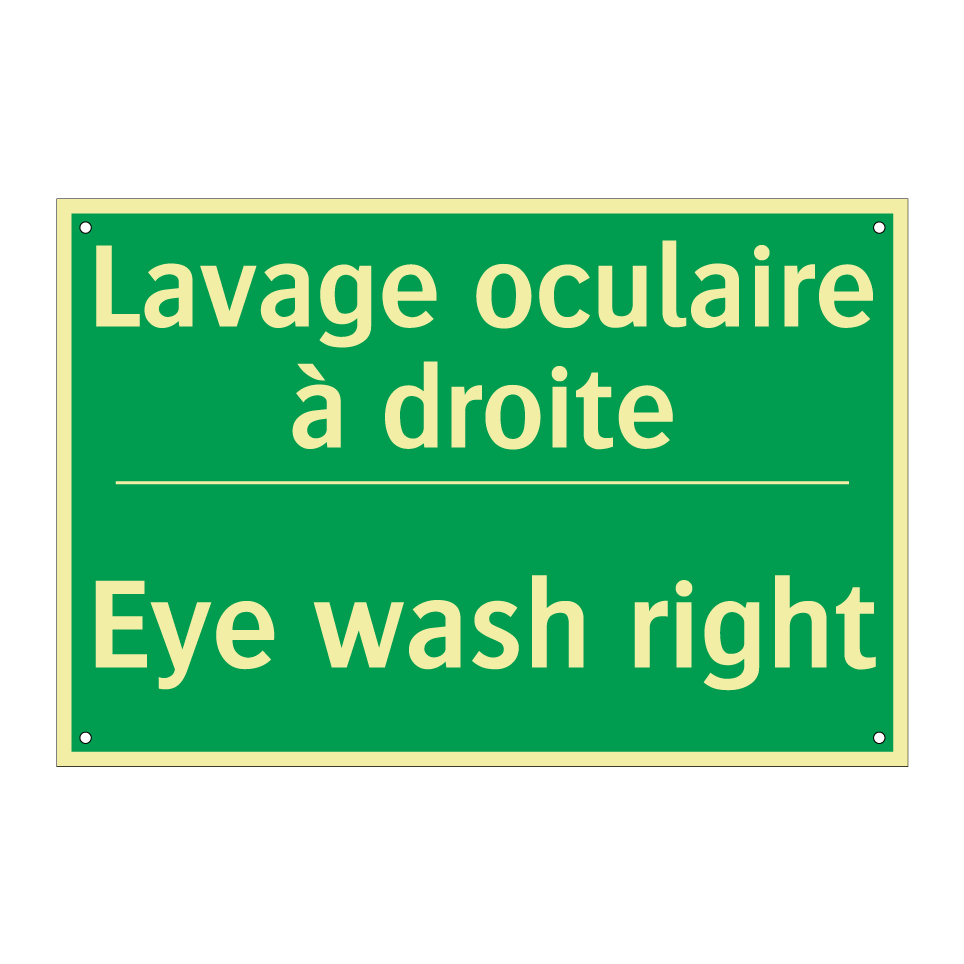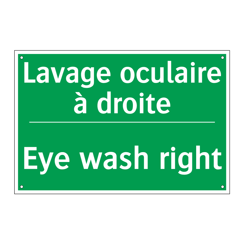 Panneau de secours bilingue avec texte en français : "Lavage oculaire à droite", et en anglais : "Eye wash right"