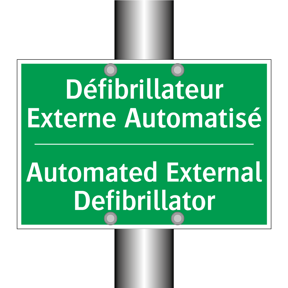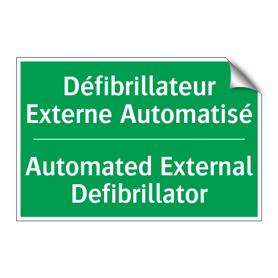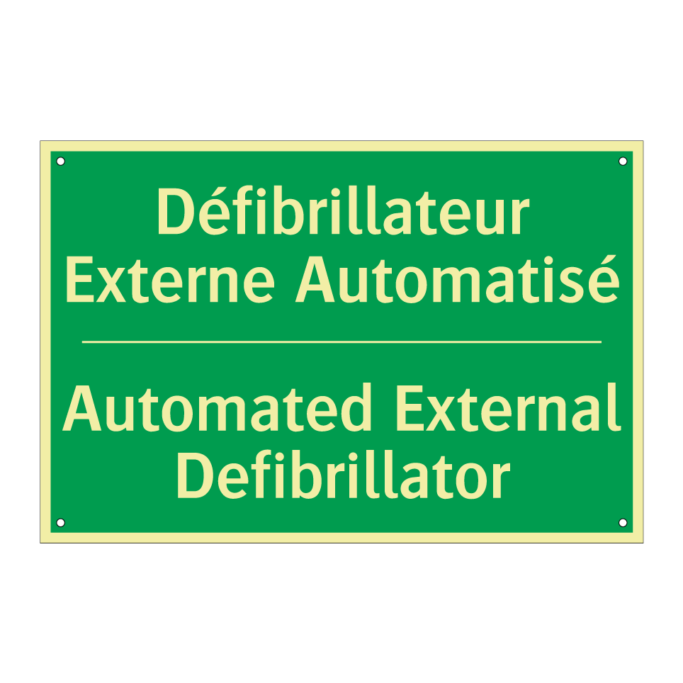 Panneau de secours bilingue avec texte en français : "Défibrillateur Externe Automatisé", et en anglais : "Automated External Defibrillator"