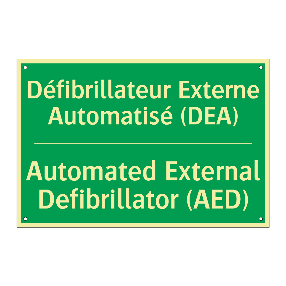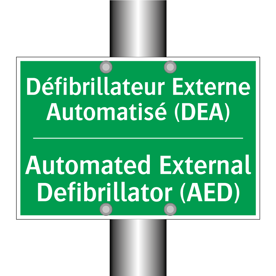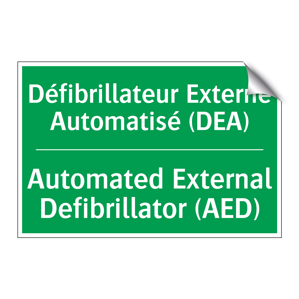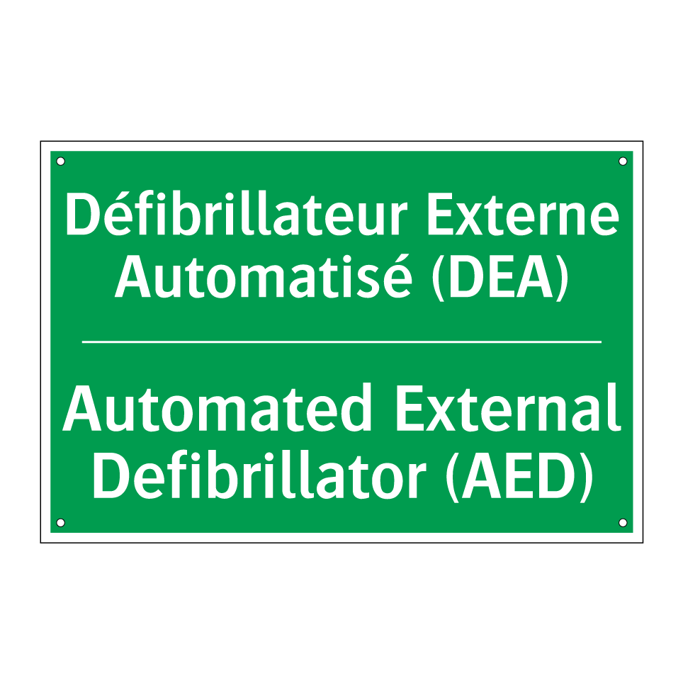 Panneau de secours bilingue avec texte en français : "Défibrillateur Externe Automatisé (DEA)", et en anglais : "Automated External Defibrillator (AED)"