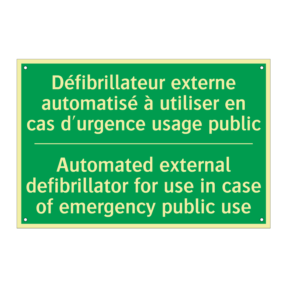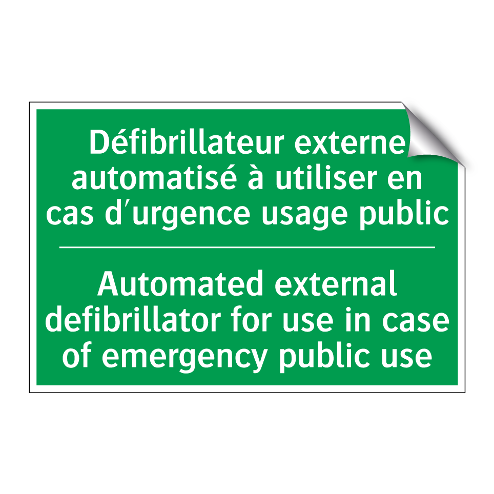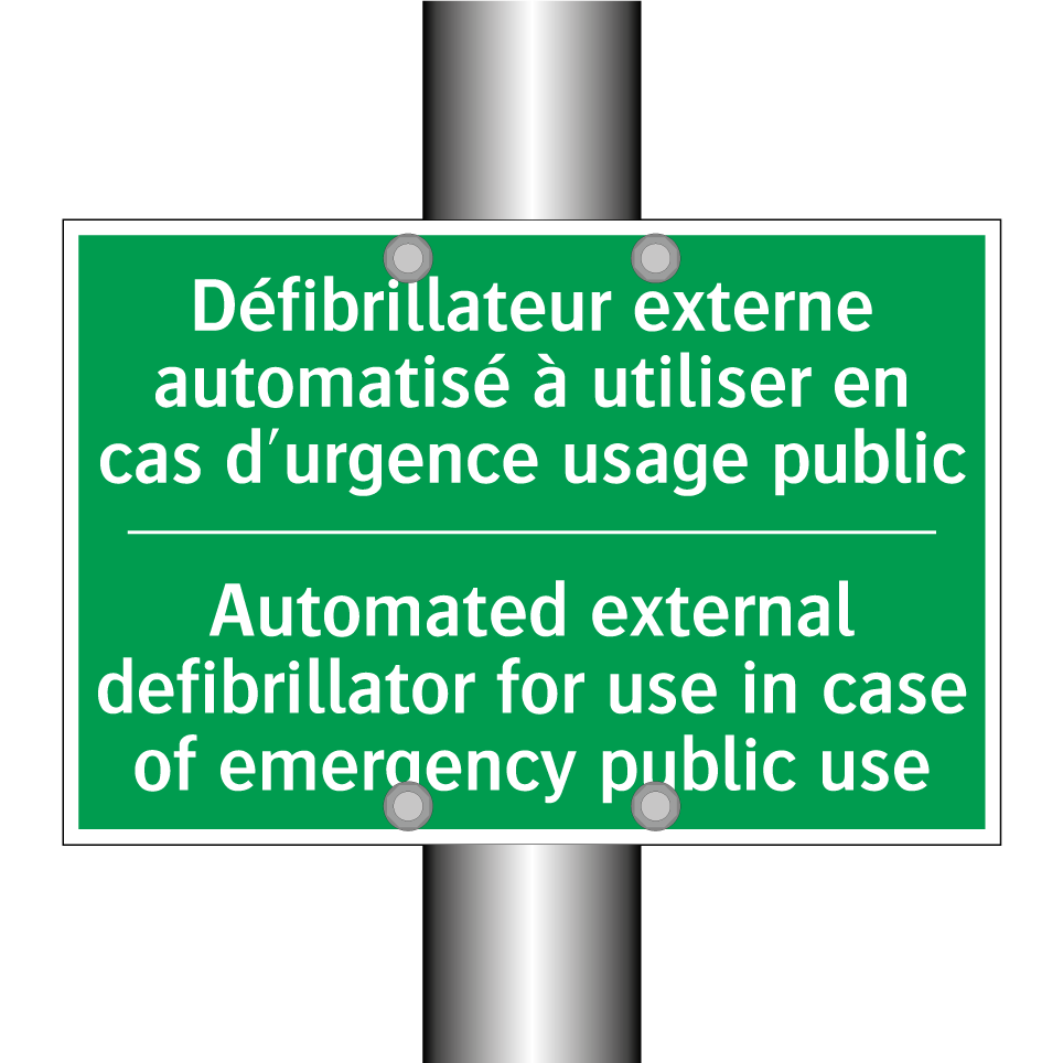 Panneau de secours bilingue avec texte en français : "Défibrillateur externe automatisé à utiliser en cas d'urgence usage public", et en anglais : "Automated external defibrillator for use in case of emergency public use"