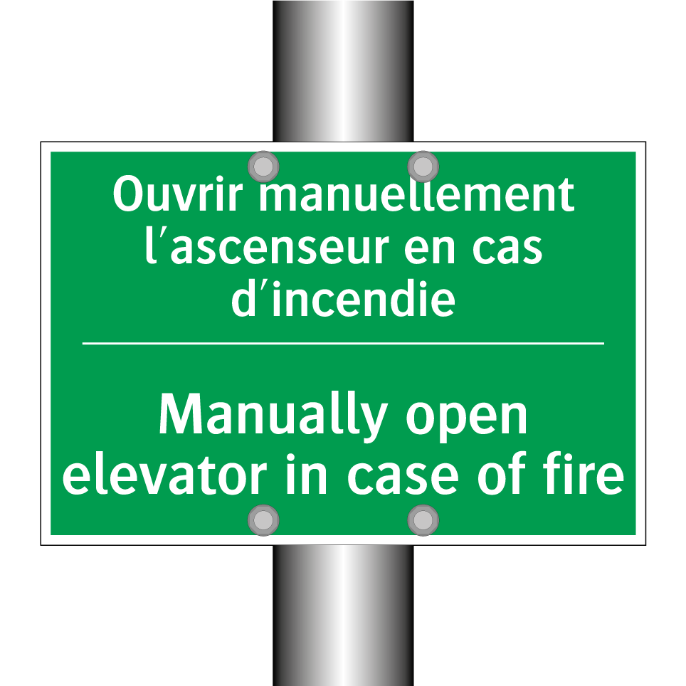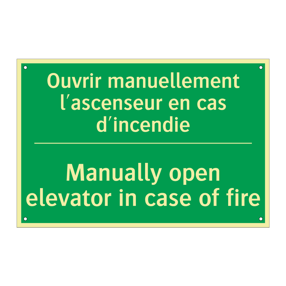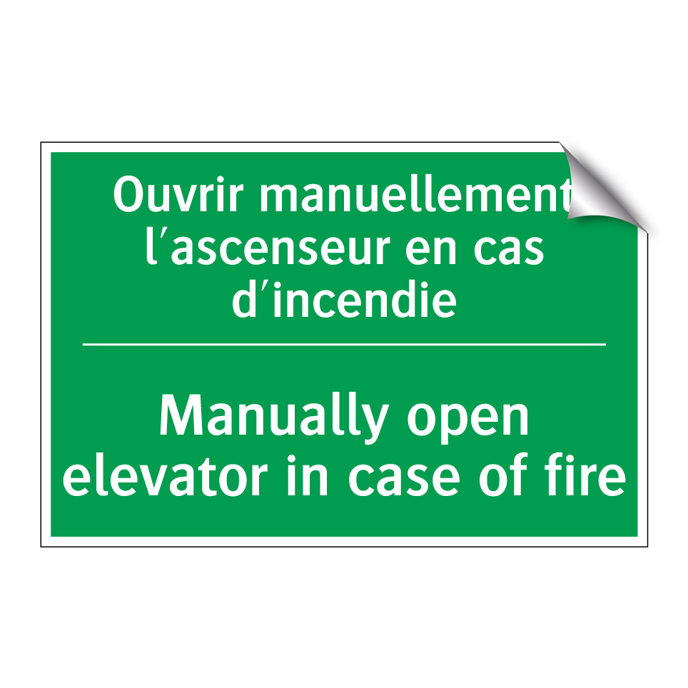 Panneau de secours bilingue avec texte en français : "Ouvrir manuellement l'ascenseur en cas d'incendie", et en anglais : "Manually open elevator in case of fire"