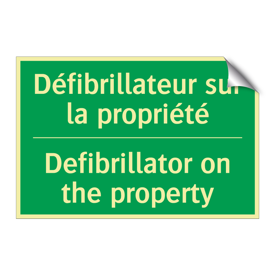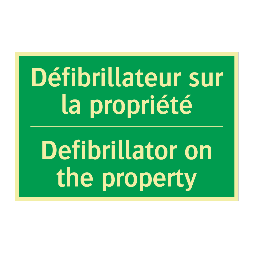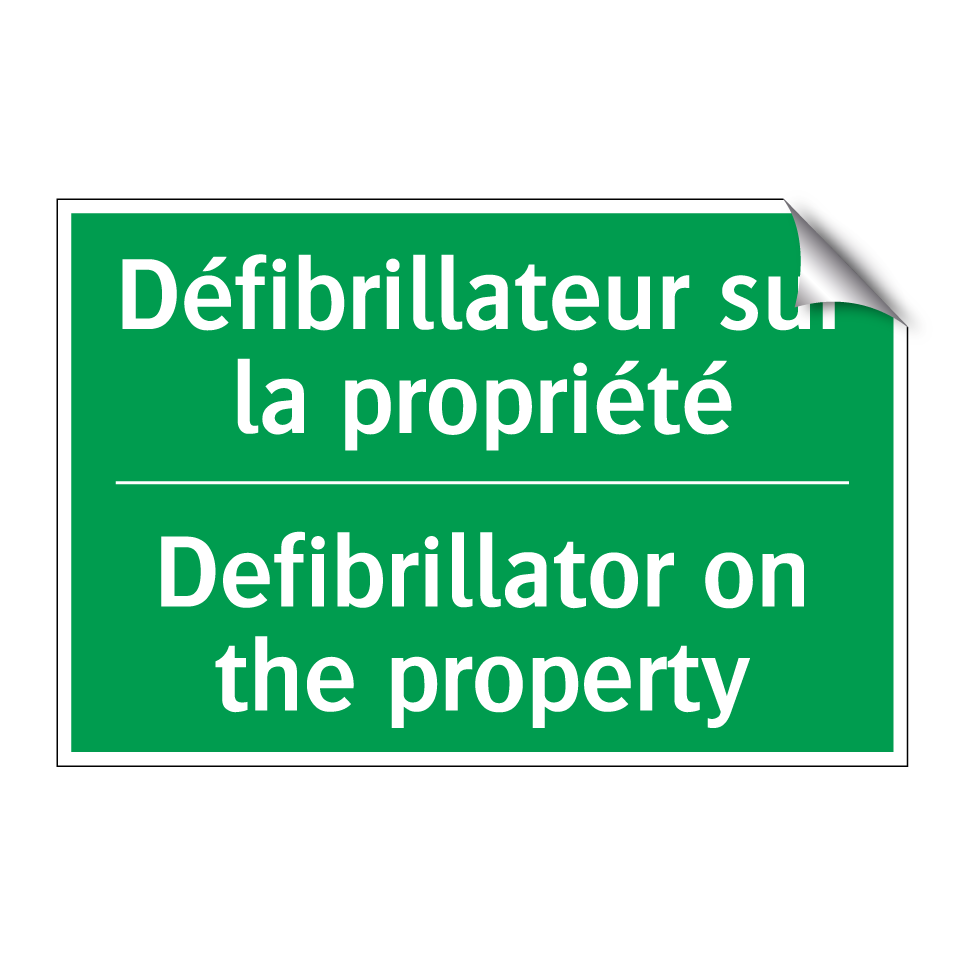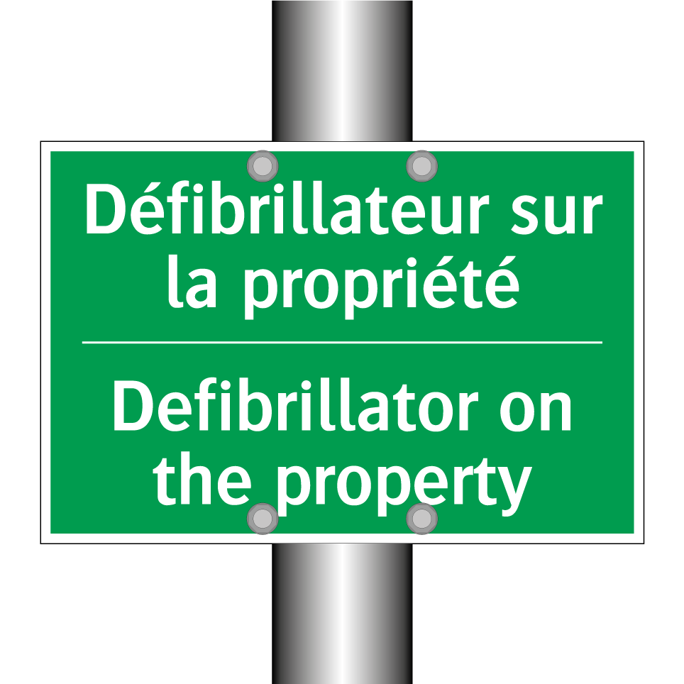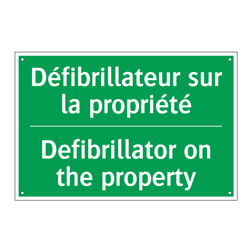 Panneau de secours bilingue avec texte en français : "Défibrillateur sur la propriété", et en anglais : "Defibrillator on the property"
