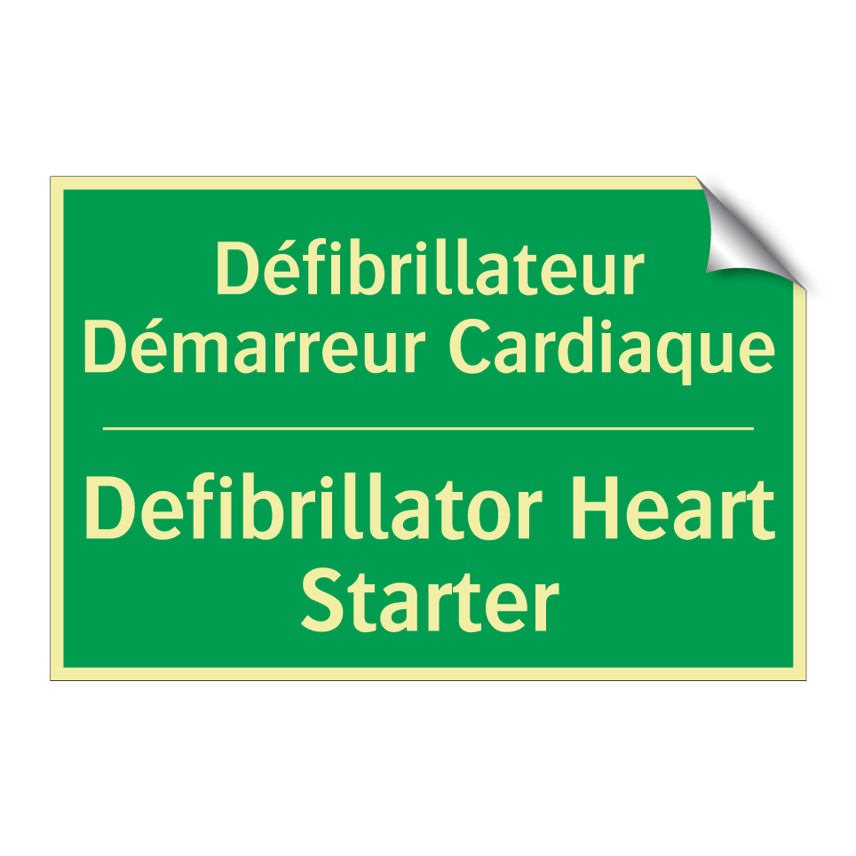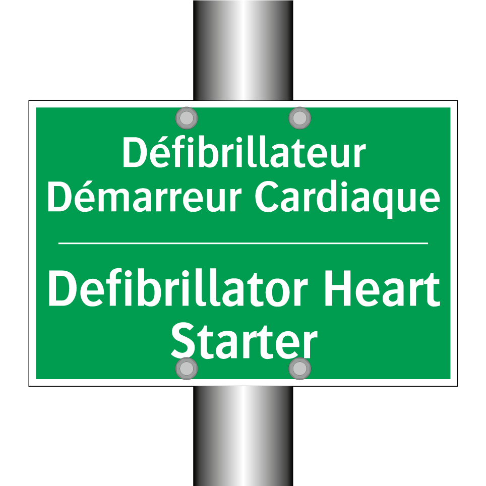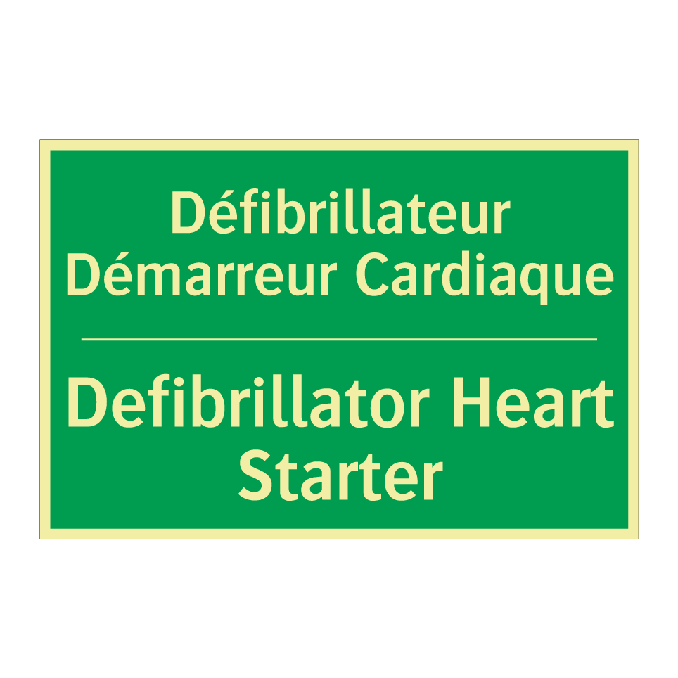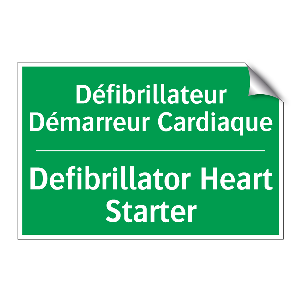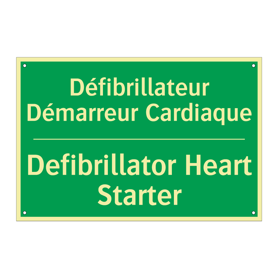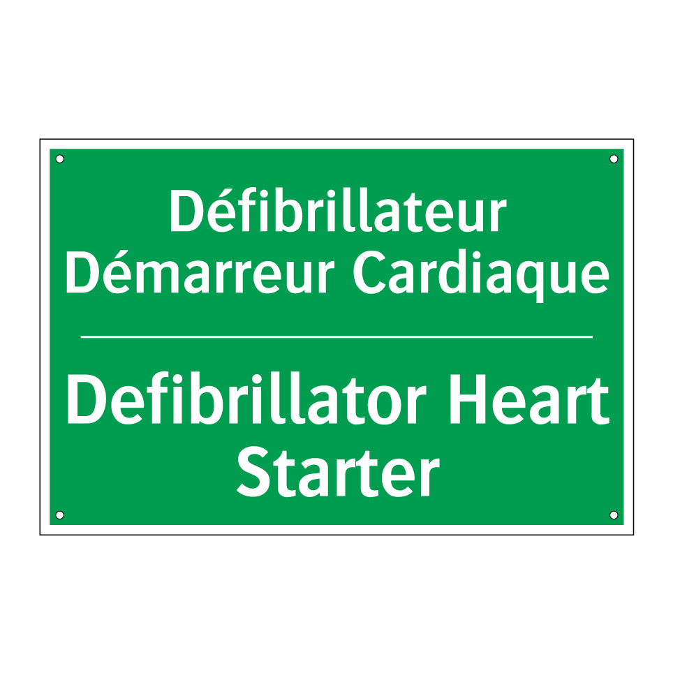 Panneau de secours bilingue avec texte en français : "Défibrillateur Démarreur Cardiaque", et en anglais : "Defibrillator Heart Starter"