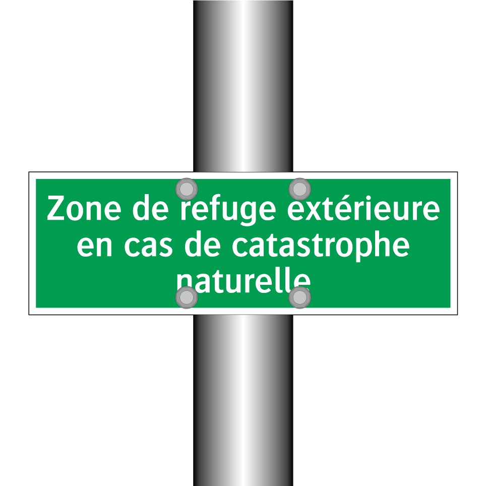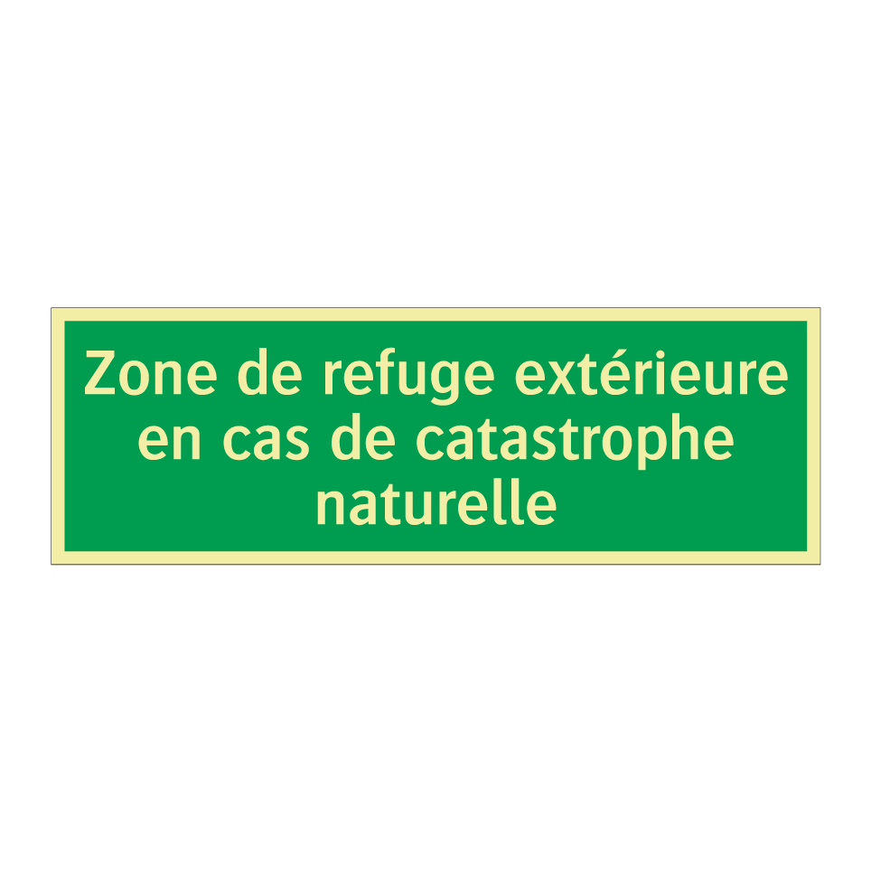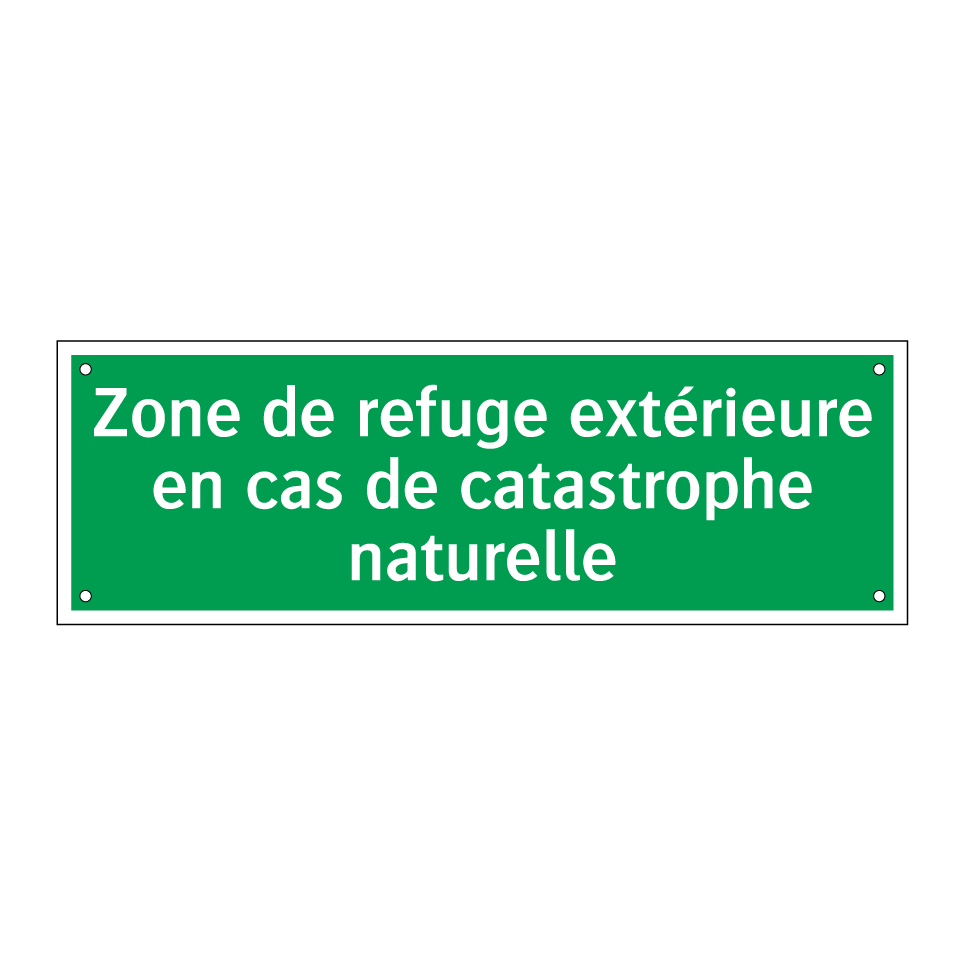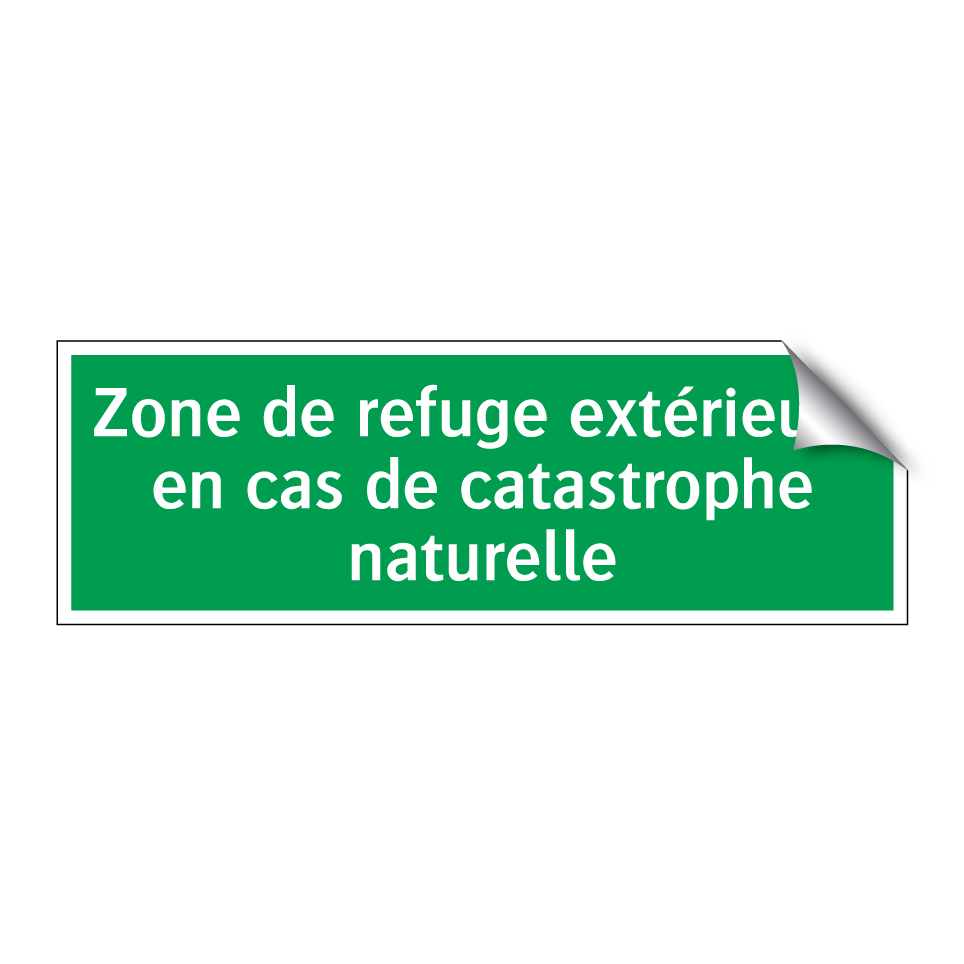 Panneau de secours avec le texte Zone de refuge extérieure en cas de catastrophe naturelle
