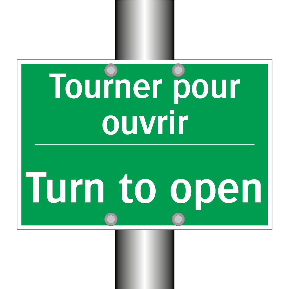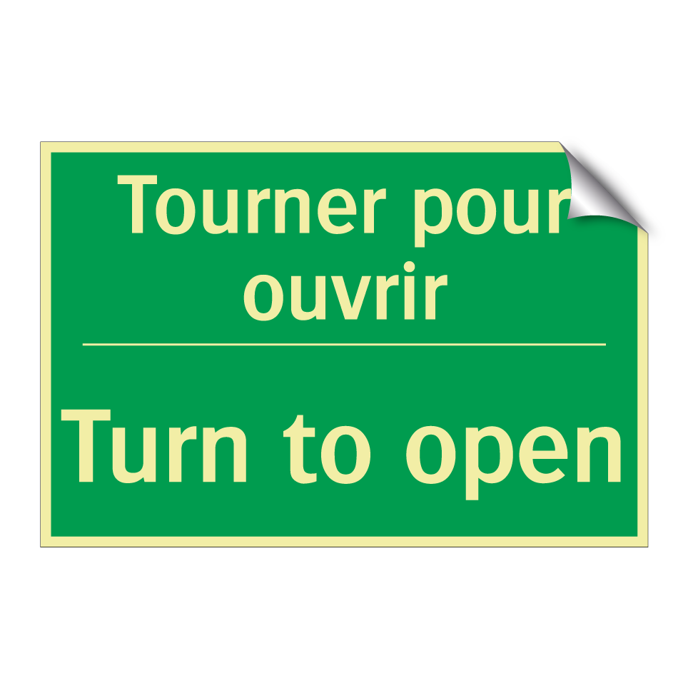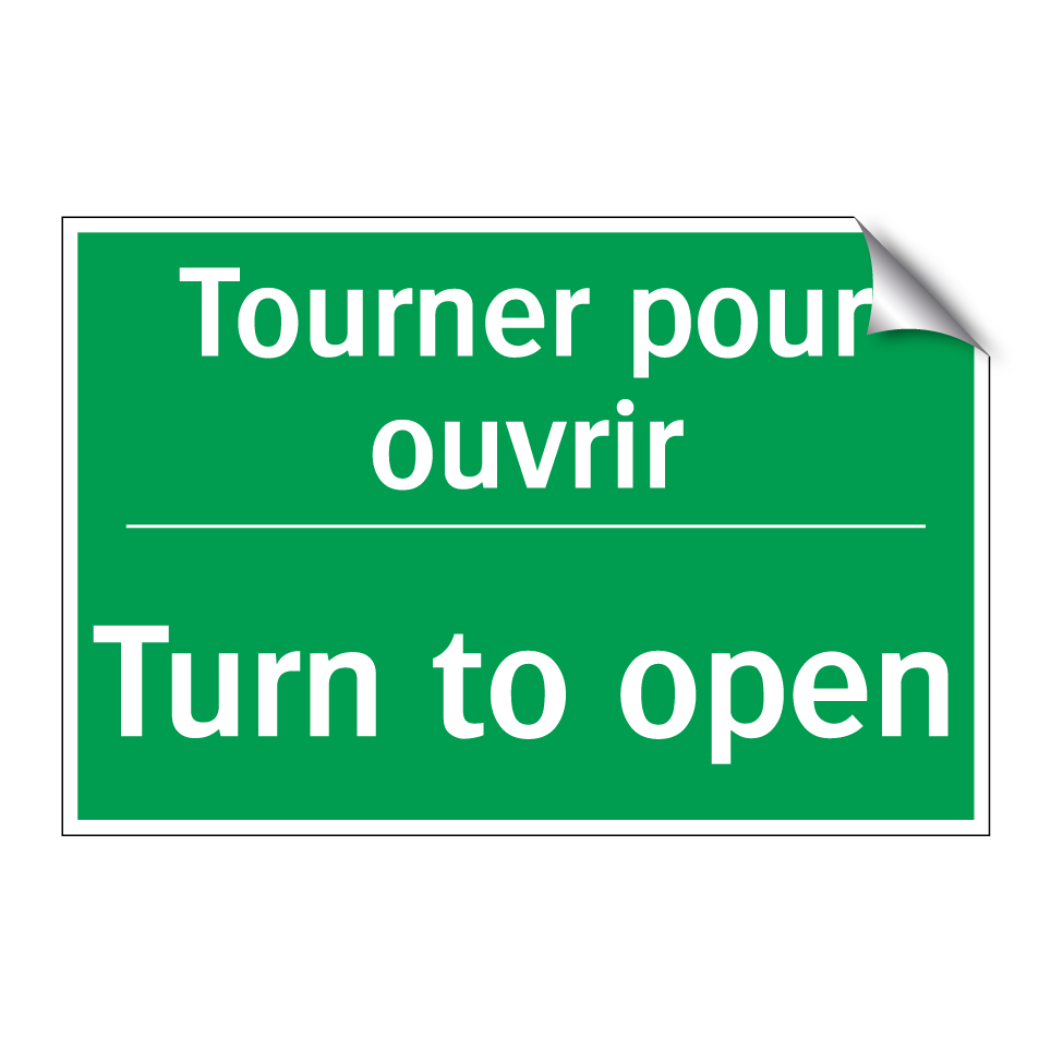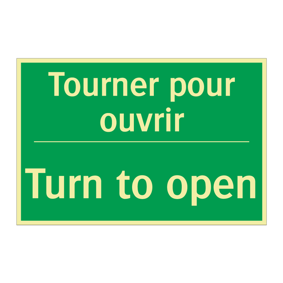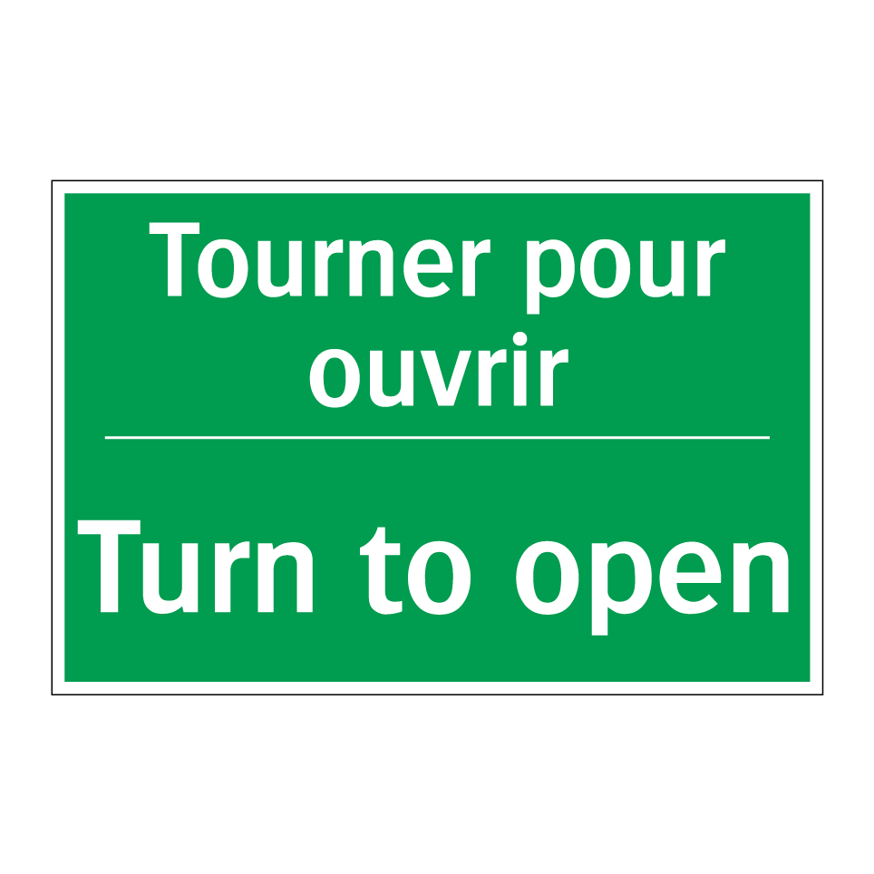 Panneau de secours bilingue avec texte en français : "Tourner pour ouvrir", et en anglais : "Turn to open"