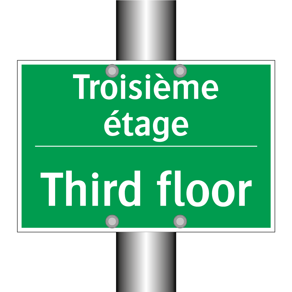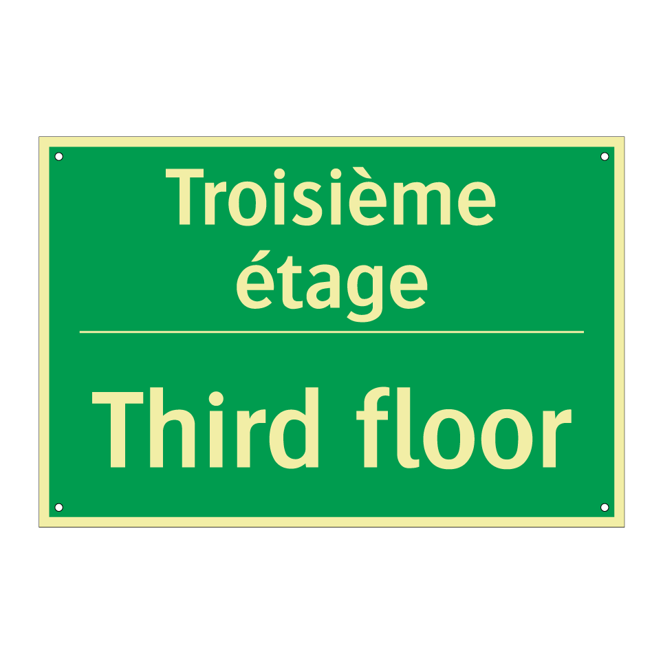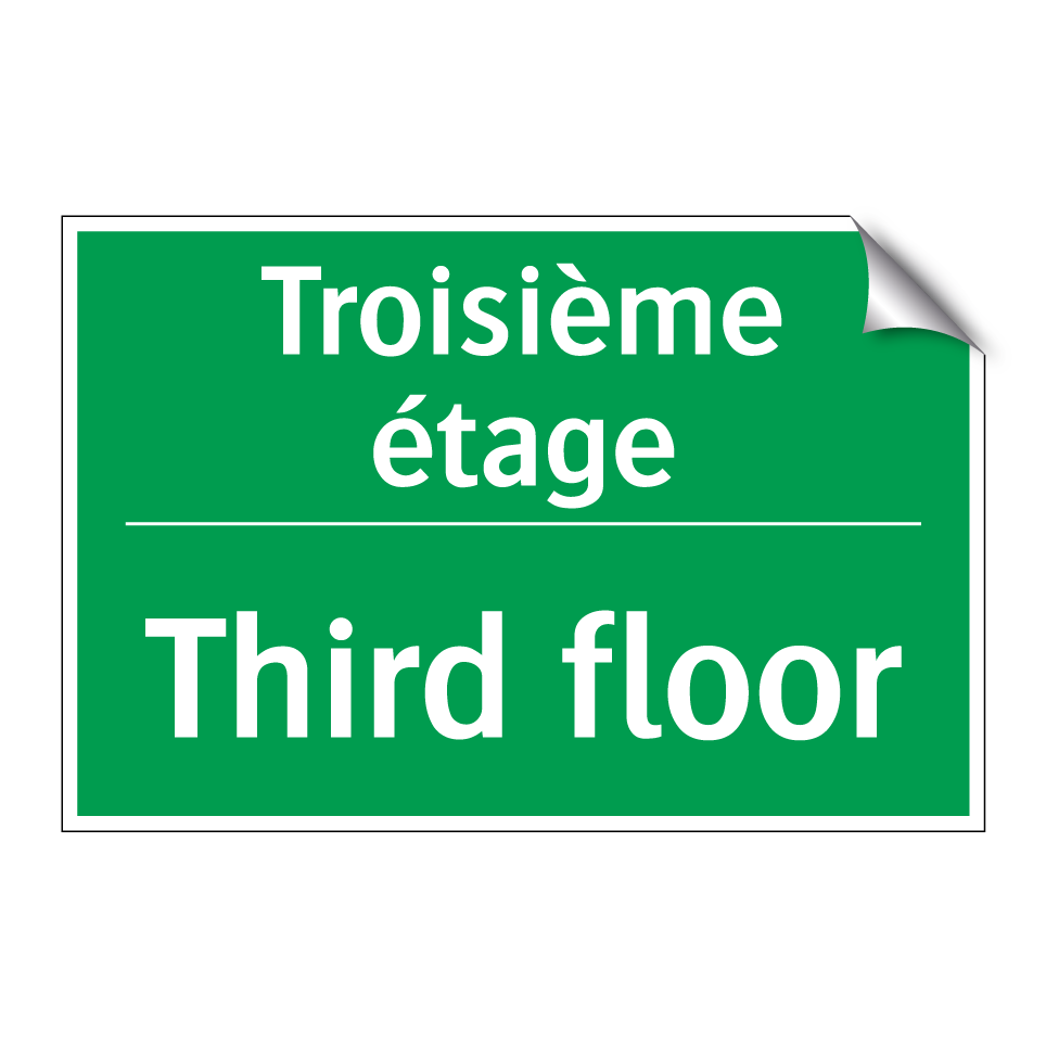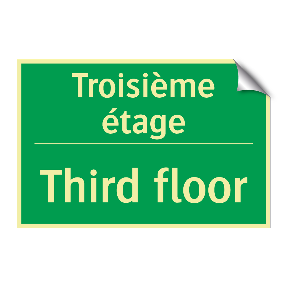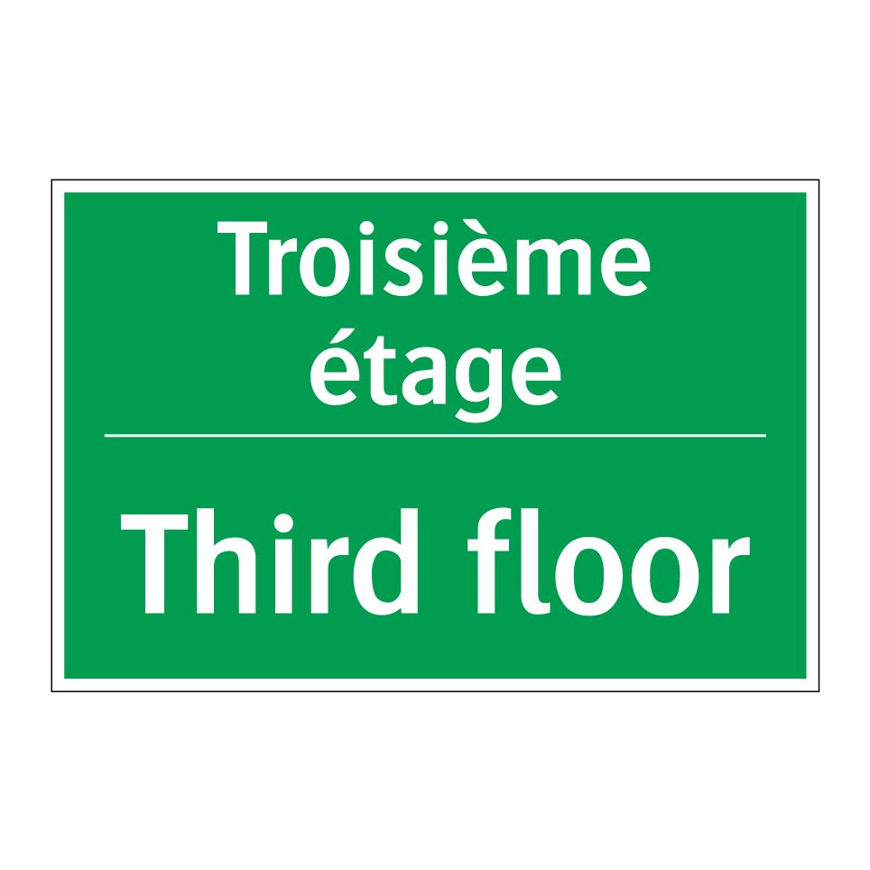Panneau de secours bilingue avec texte en français : "Troisième étage", et en anglais : "Third floor"