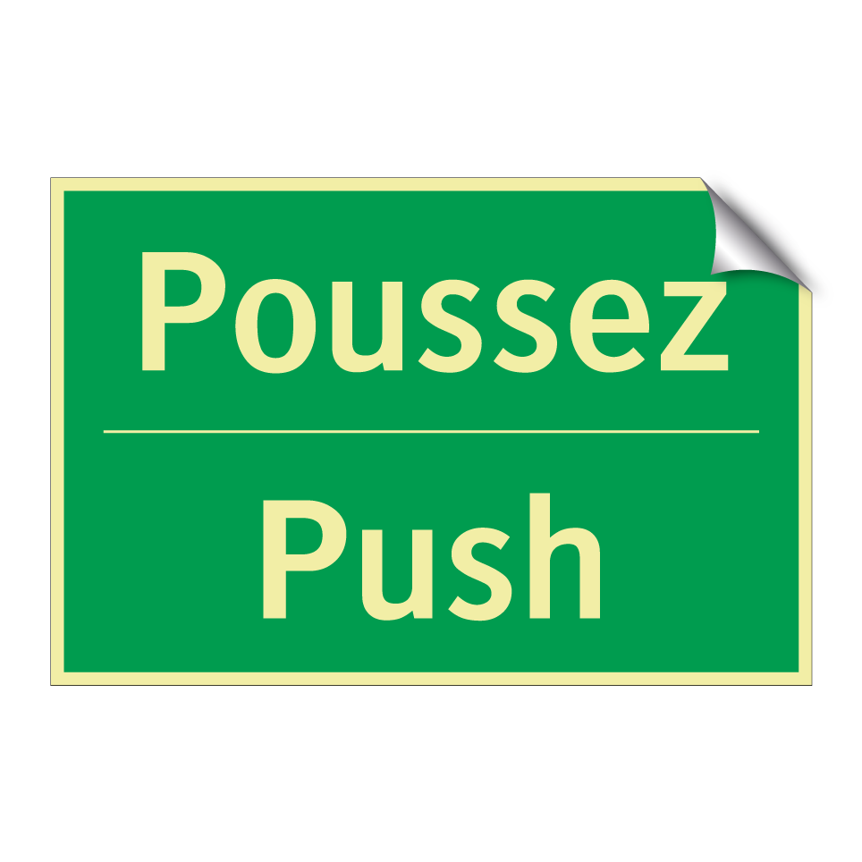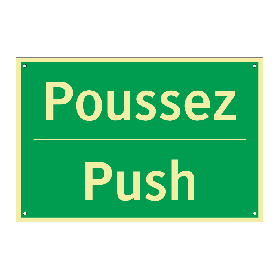 Panneau de secours bilingue avec texte en français : "Poussez", et en anglais : "Push"