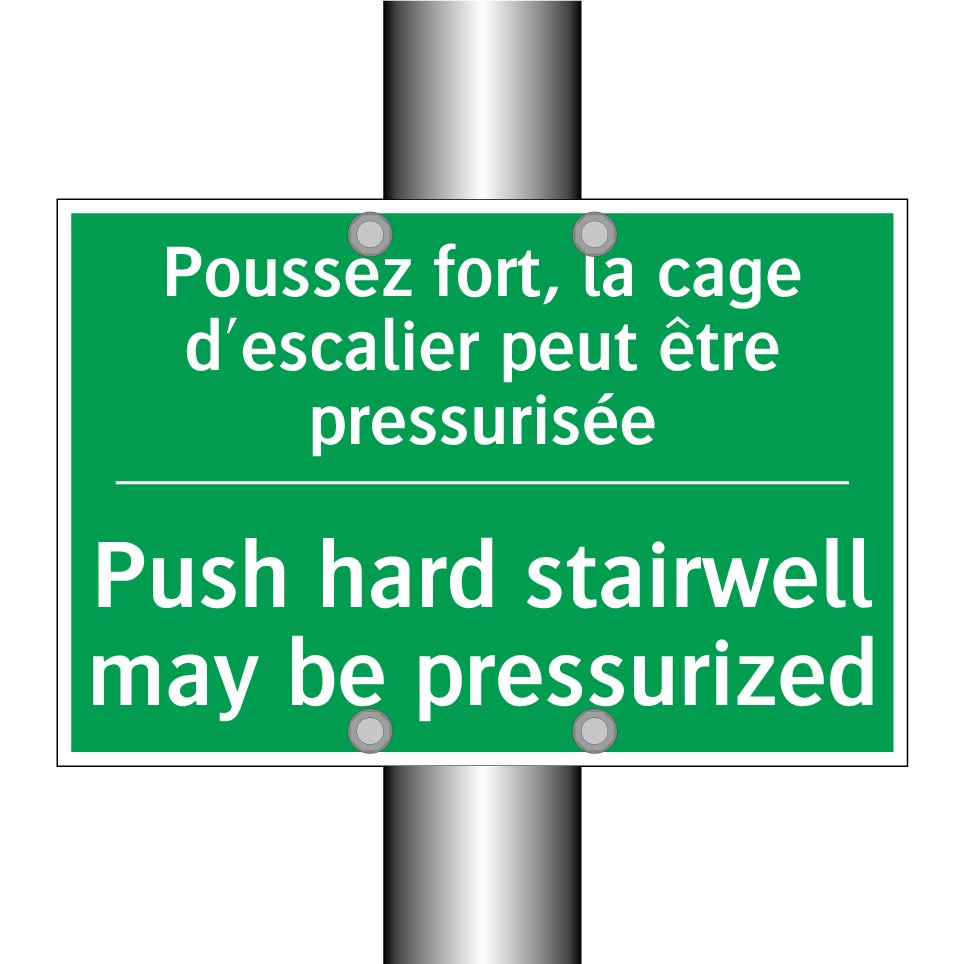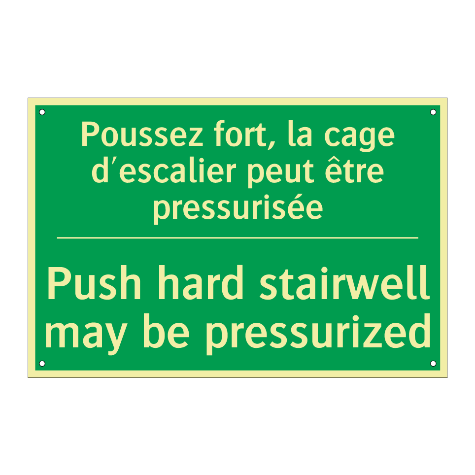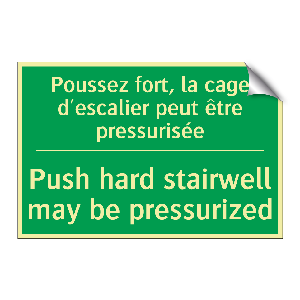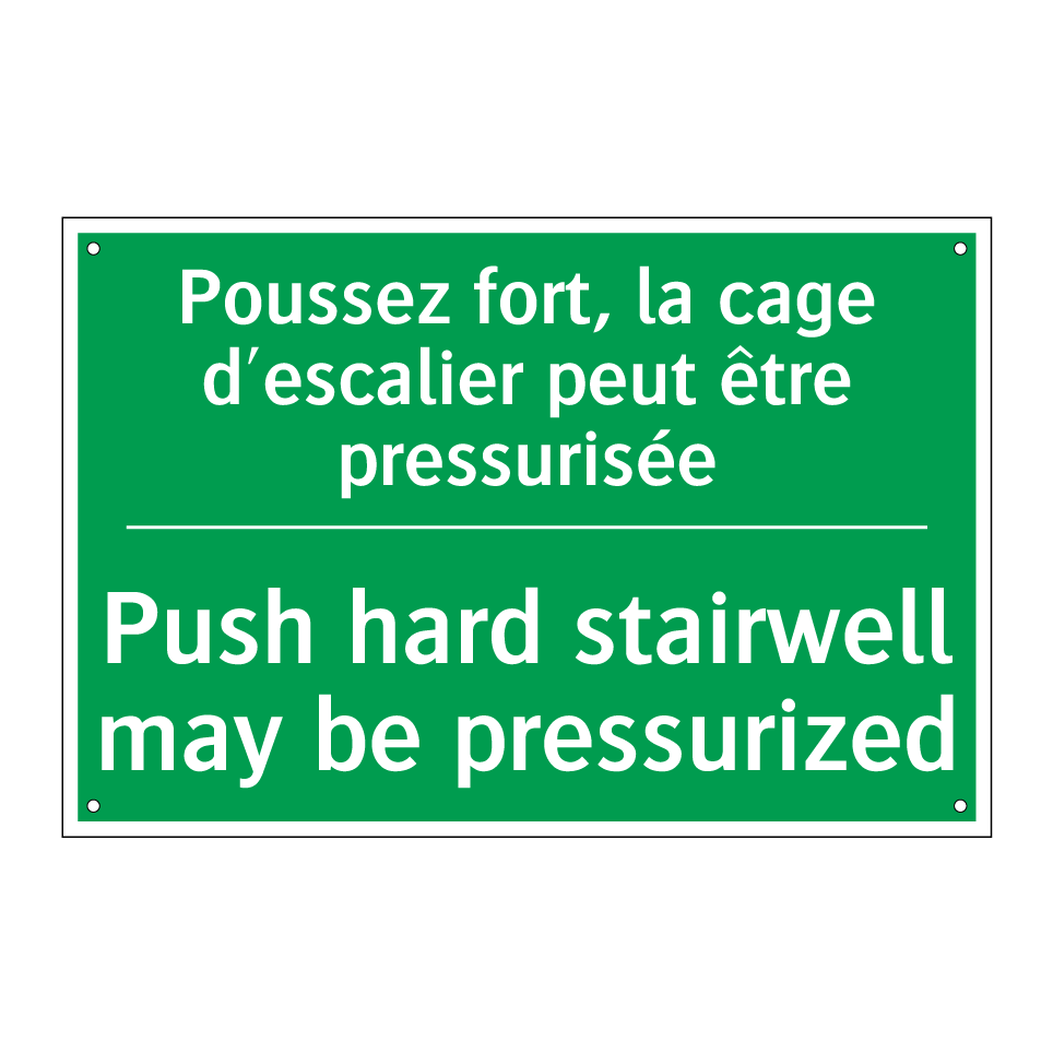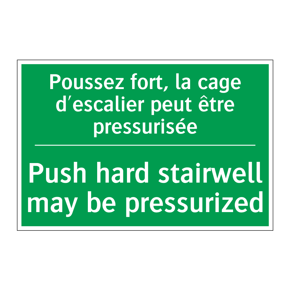 Panneau de secours bilingue avec texte en français : "Poussez fort, la cage d'escalier peut être pressurisée", et en anglais : "Push hard stairwell may be pressurized"
