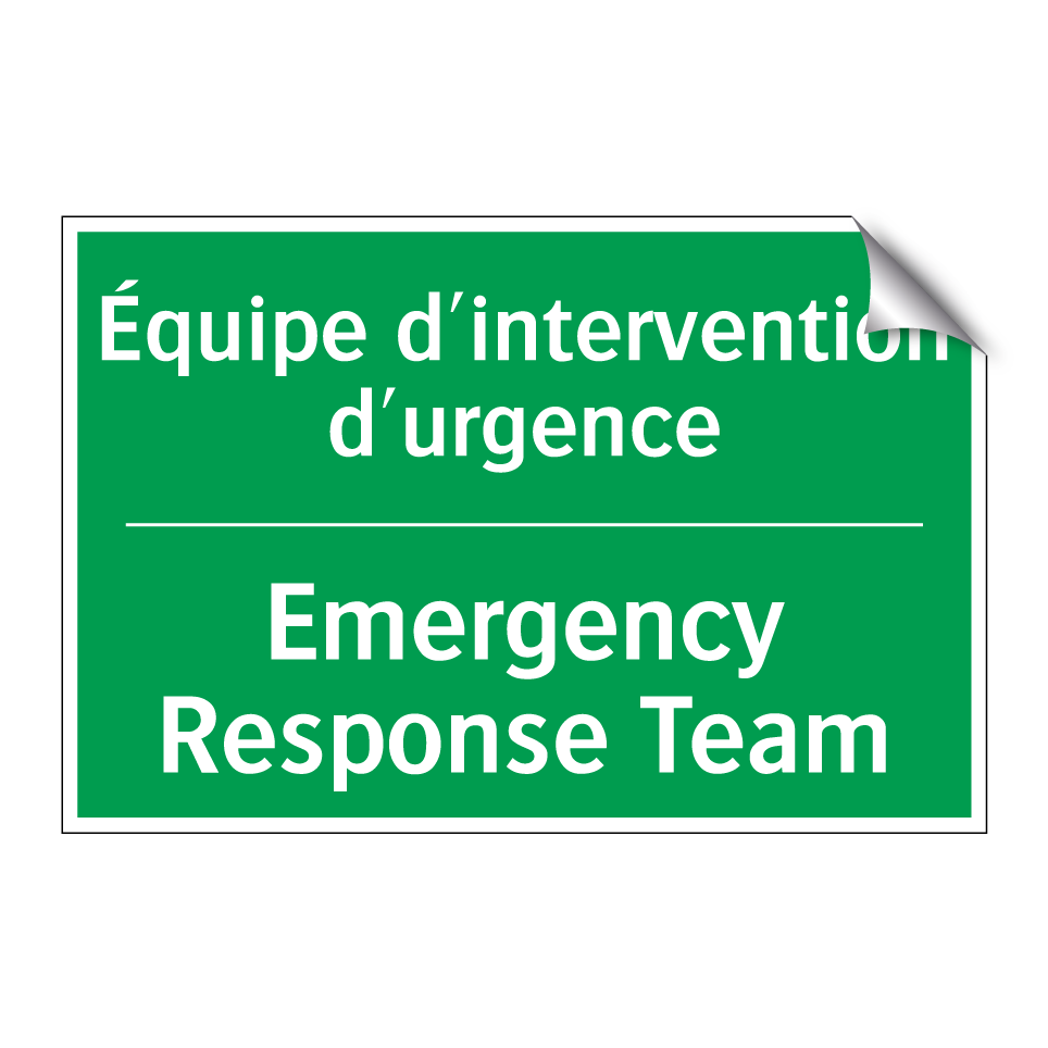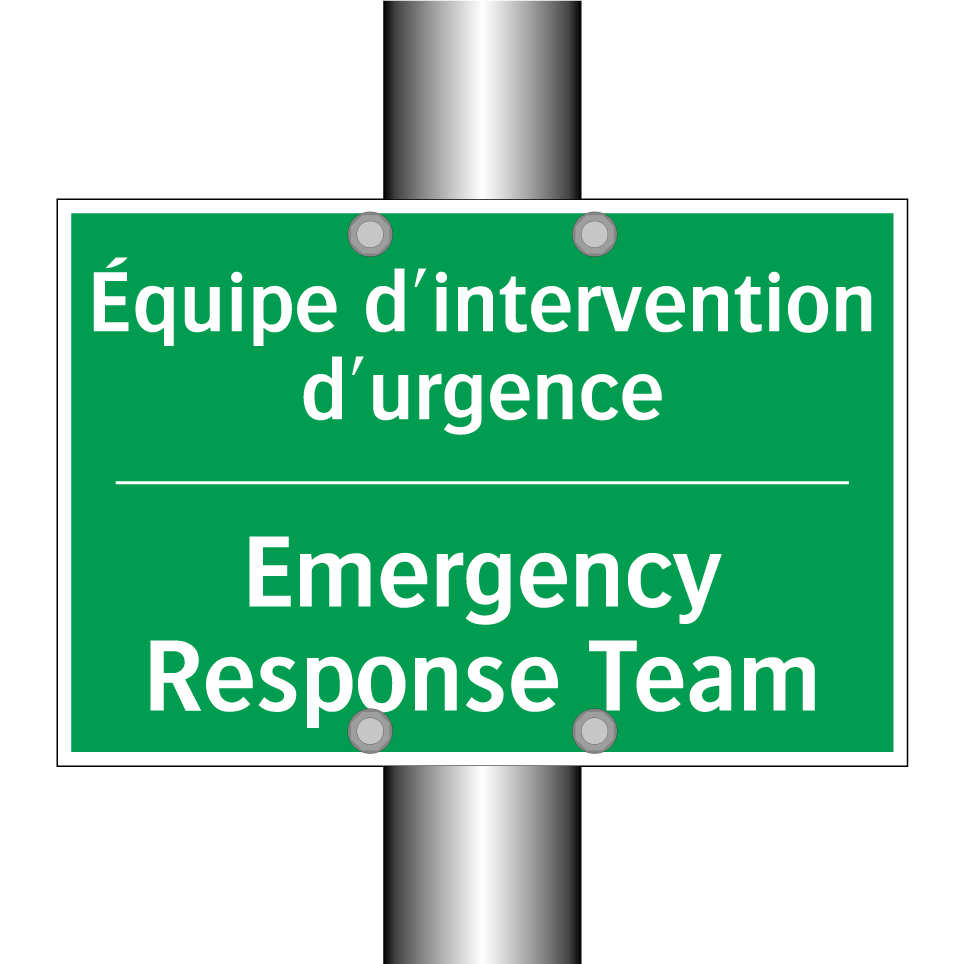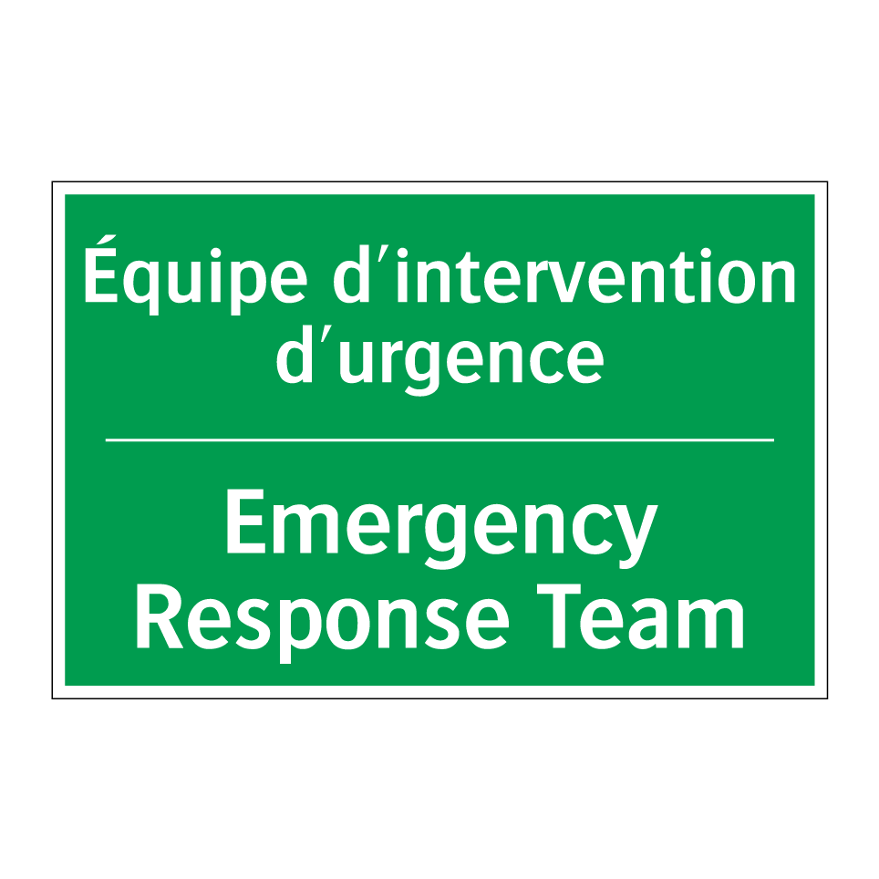 Panneau de secours bilingue avec texte en français : "Équipe d'intervention d'urgence", et en anglais : "Emergency Response Team"
