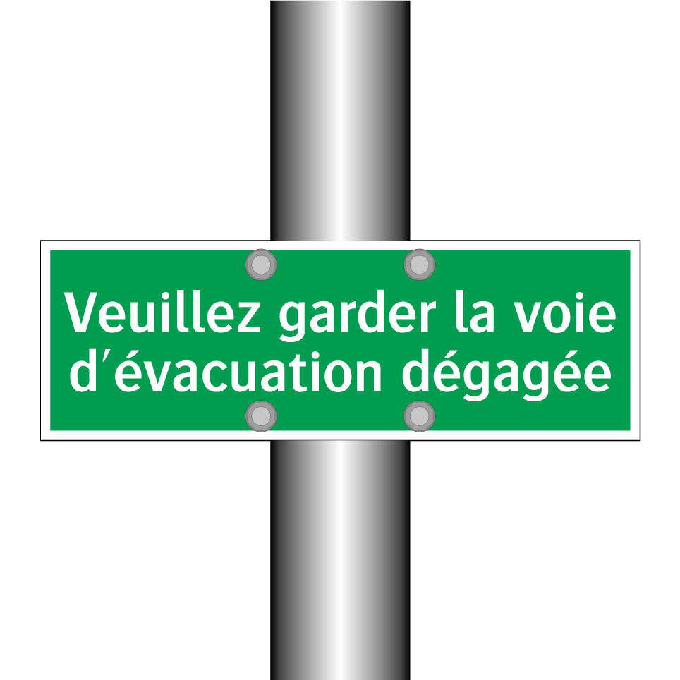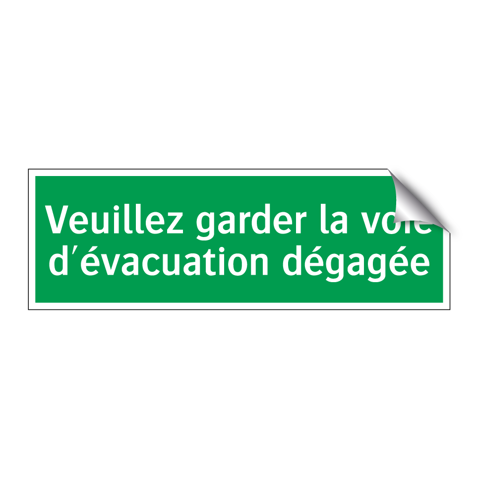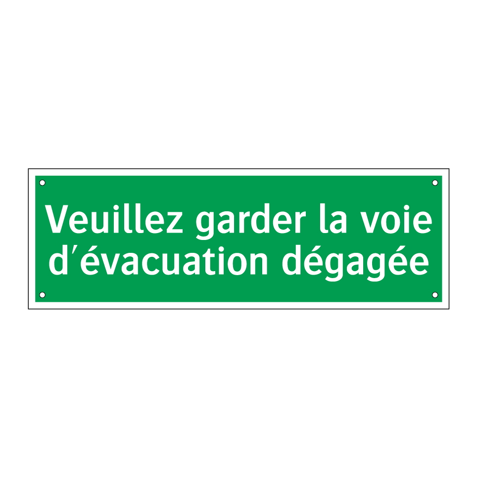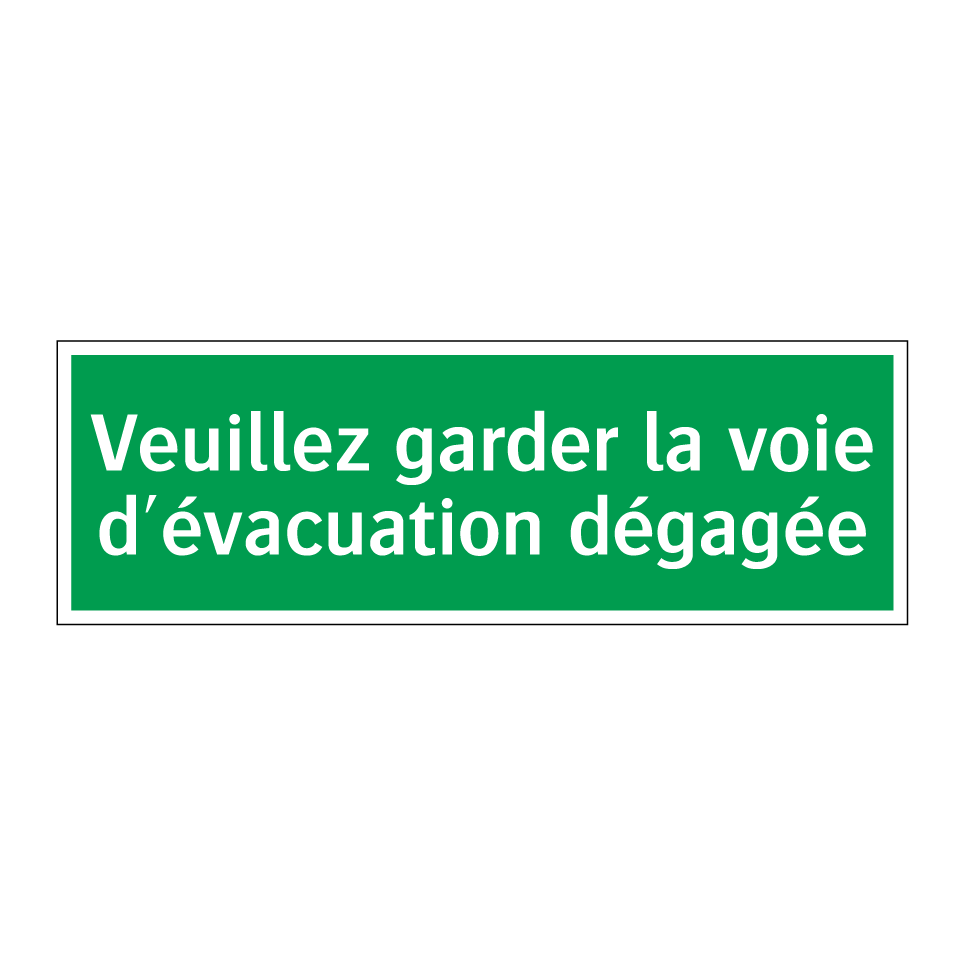 Cette pancarte d'évacuation est essentielle pour garantir la sécurité dans les bâtiments publics et privés. Elle est idéale pour être placée dans les couloirs, près des sorties de secours ou dans les zones à fort passage. Conçue pour rappeler l'importance de maintenir les voies d'évacuation libres, elle assure une évacuation rapide et efficace en cas d'urgence. Sa couleur verte et son texte blanc garantissent une visibilité optimale, même dans des conditions de faible éclairage. Utilisez cette signalisation pour renforcer la sécurité et la conformité de votre espace.