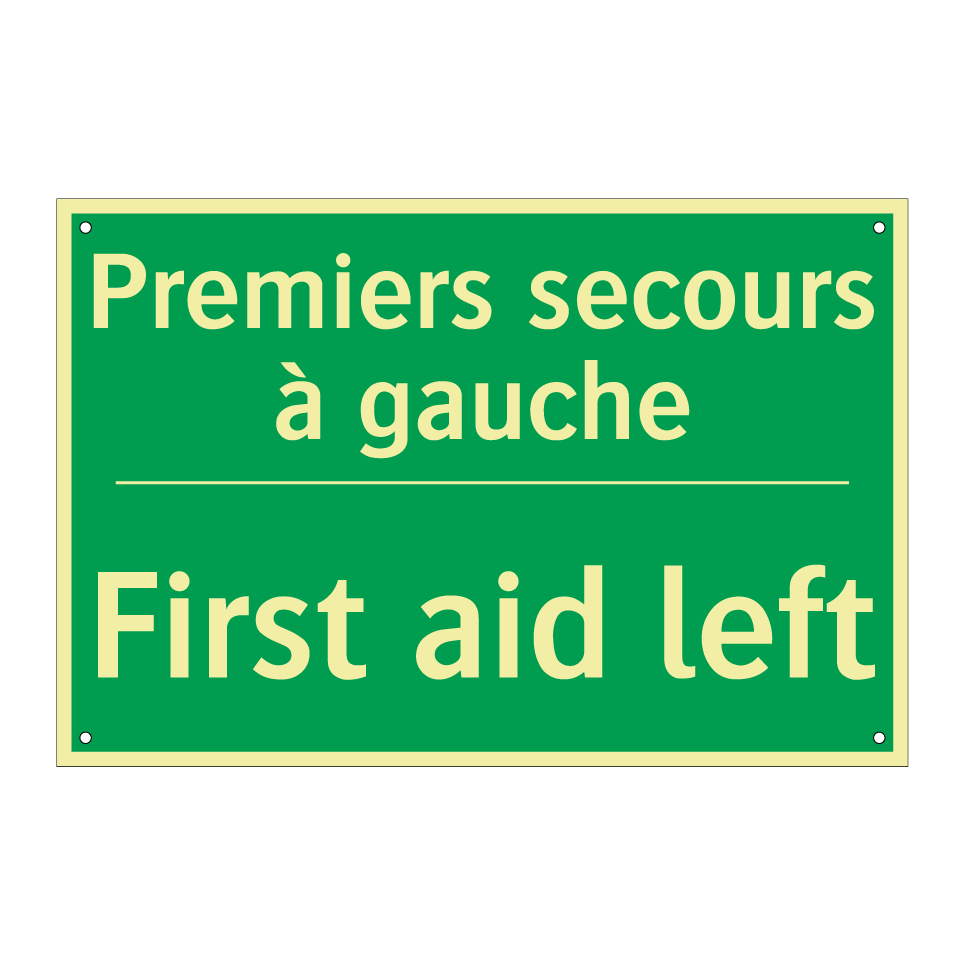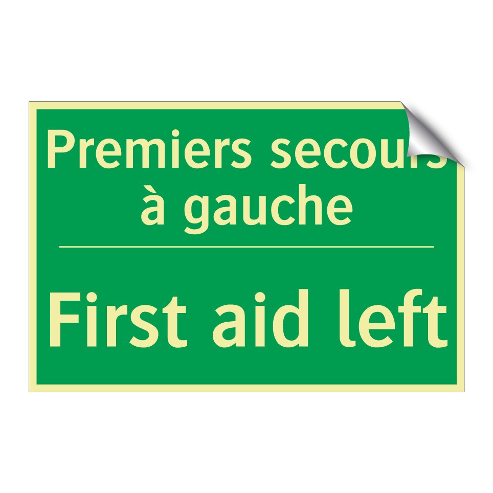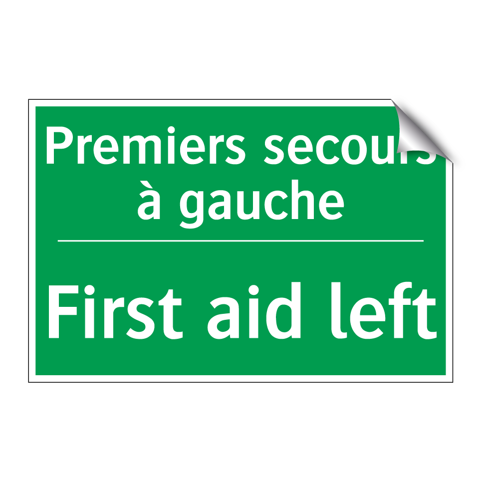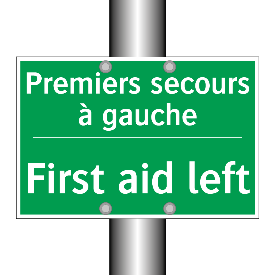 Panneau de secours bilingue avec texte en français : "Premiers secours à gauche", et en anglais : "First aid left"