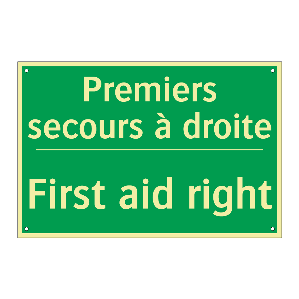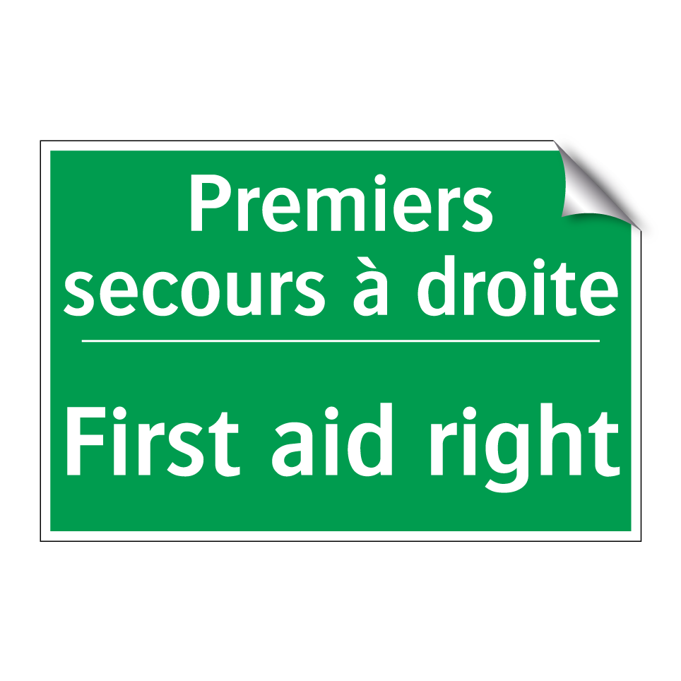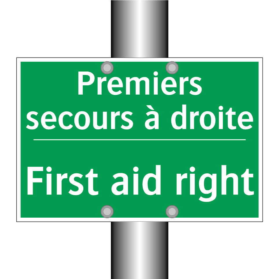 Panneau de secours bilingue avec texte en français : "Premiers secours à droite", et en anglais : "First aid right"