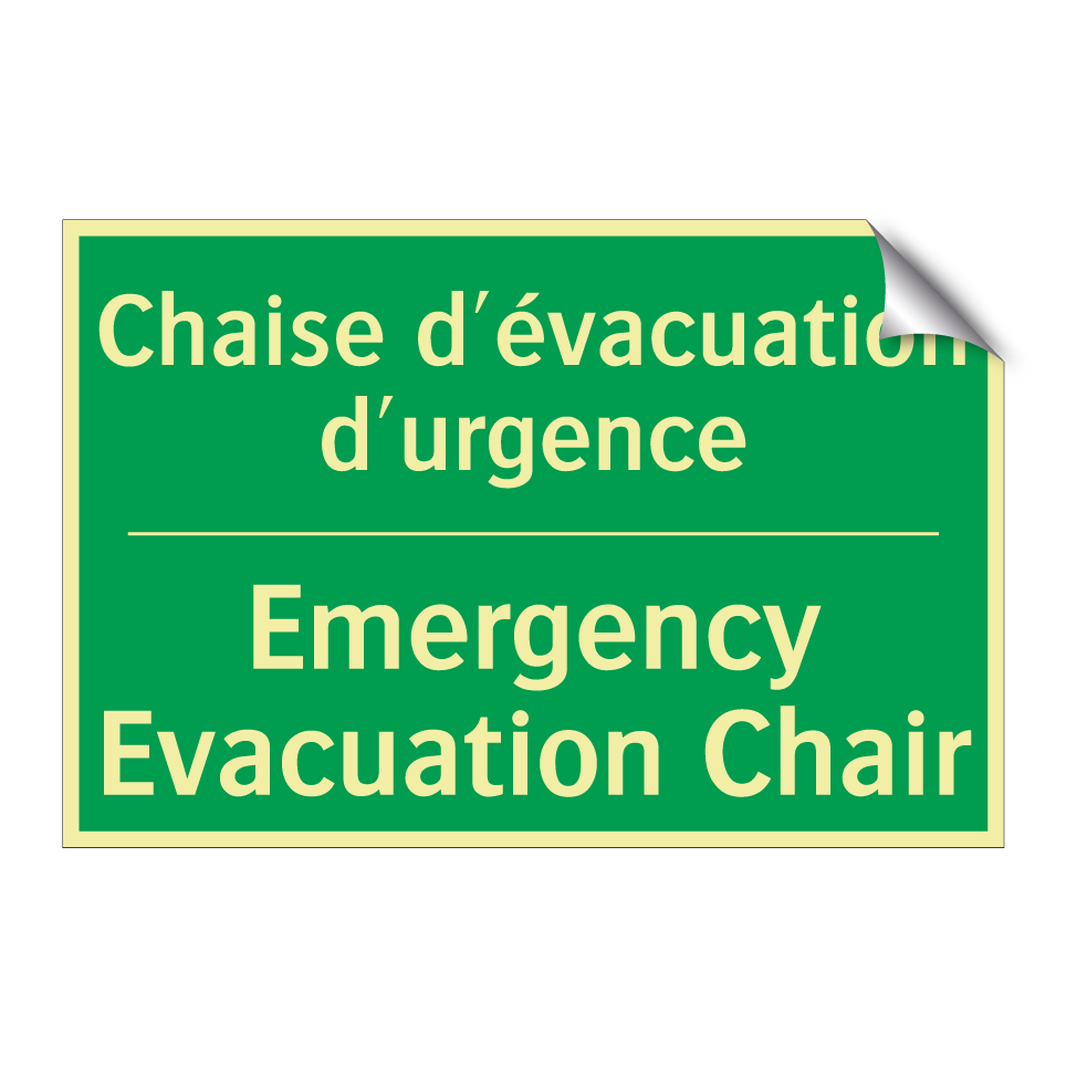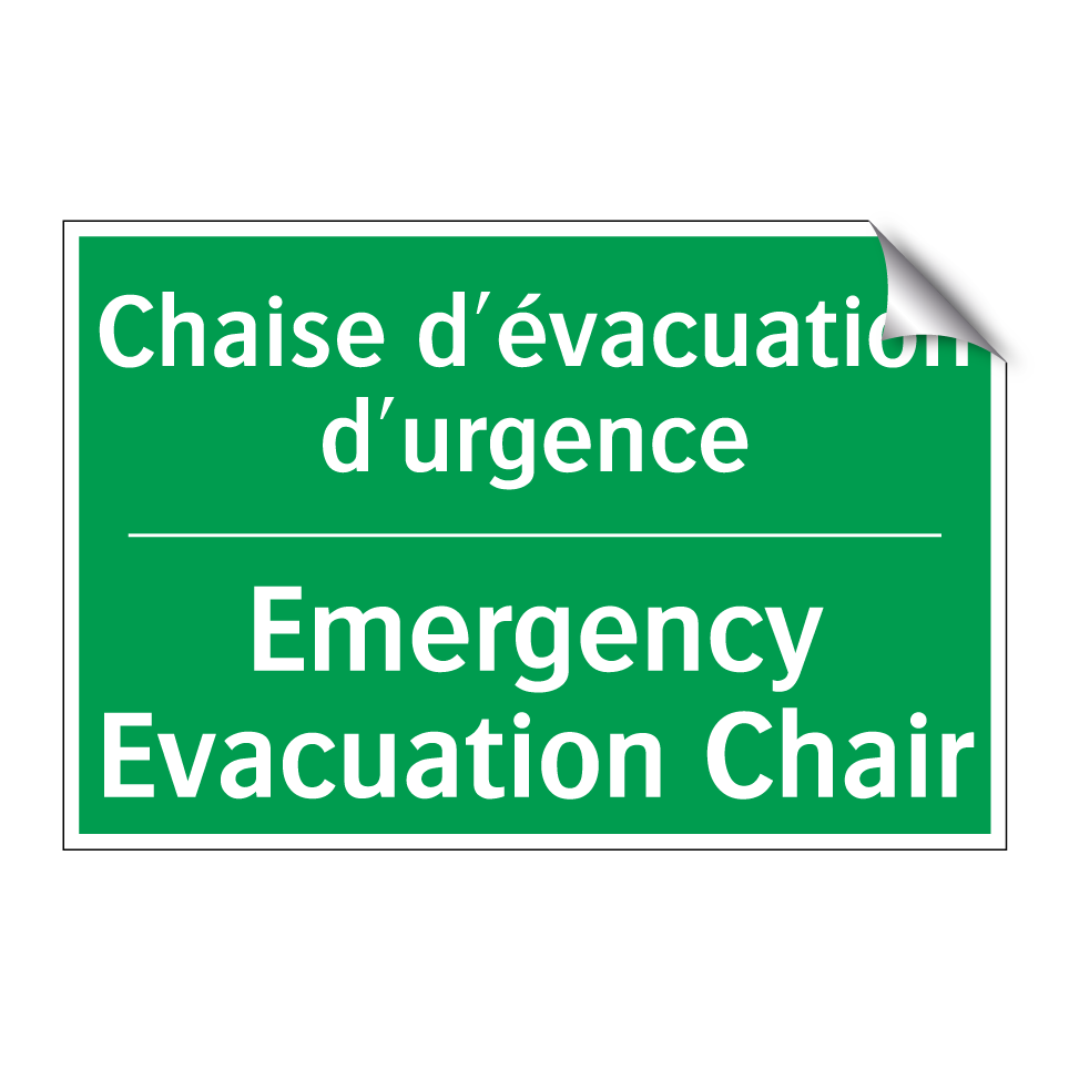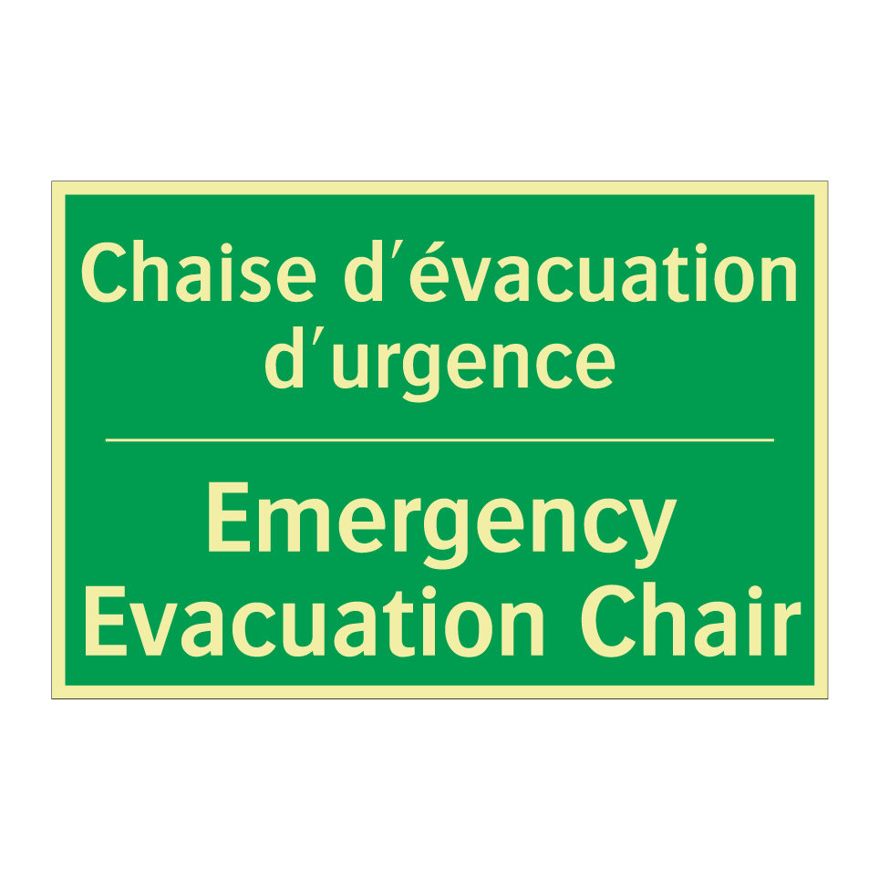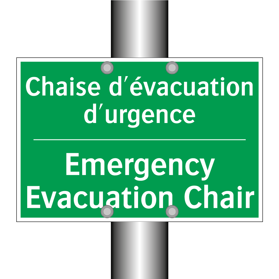 Panneau de secours bilingue avec texte en français : "Chaise d'évacuation d'urgence", et en anglais : "Emergency Evacuation Chair"