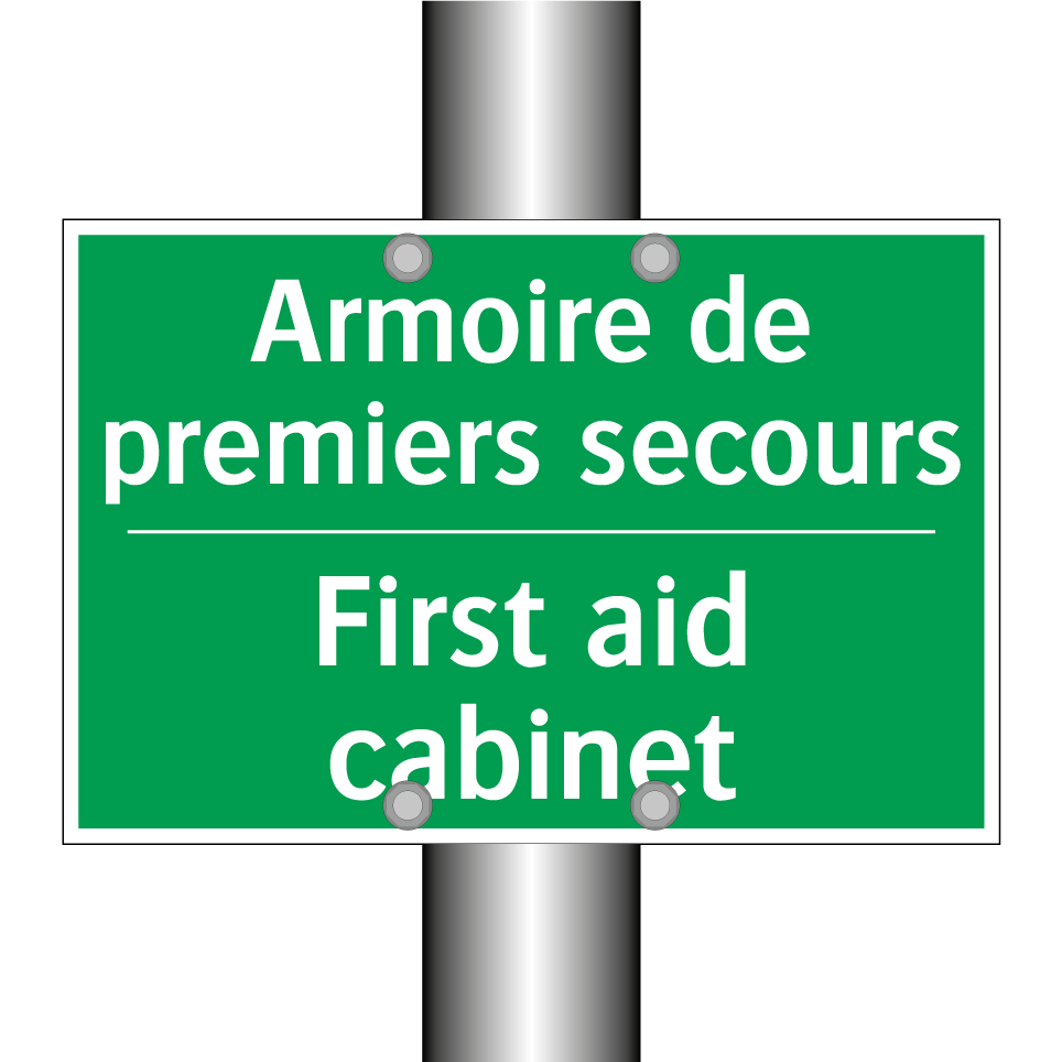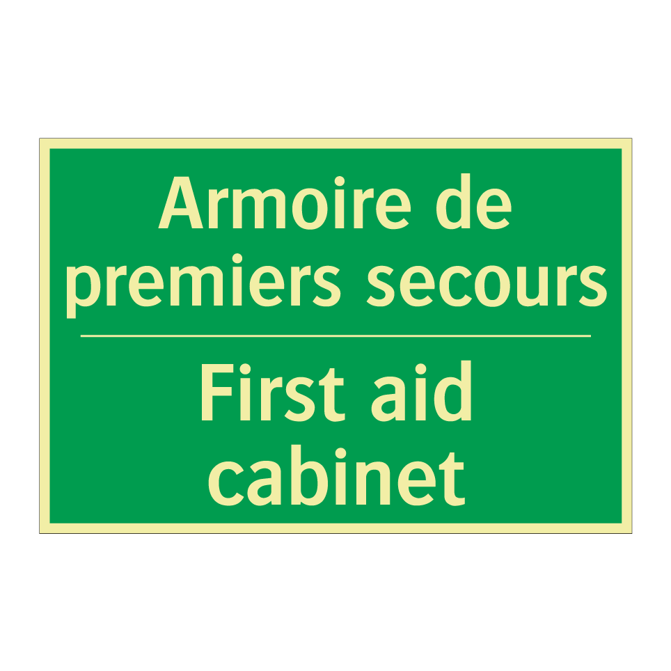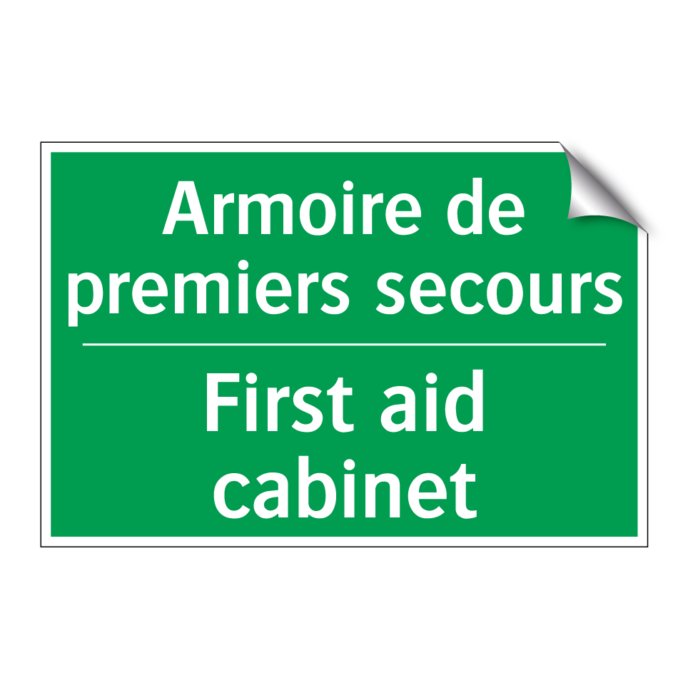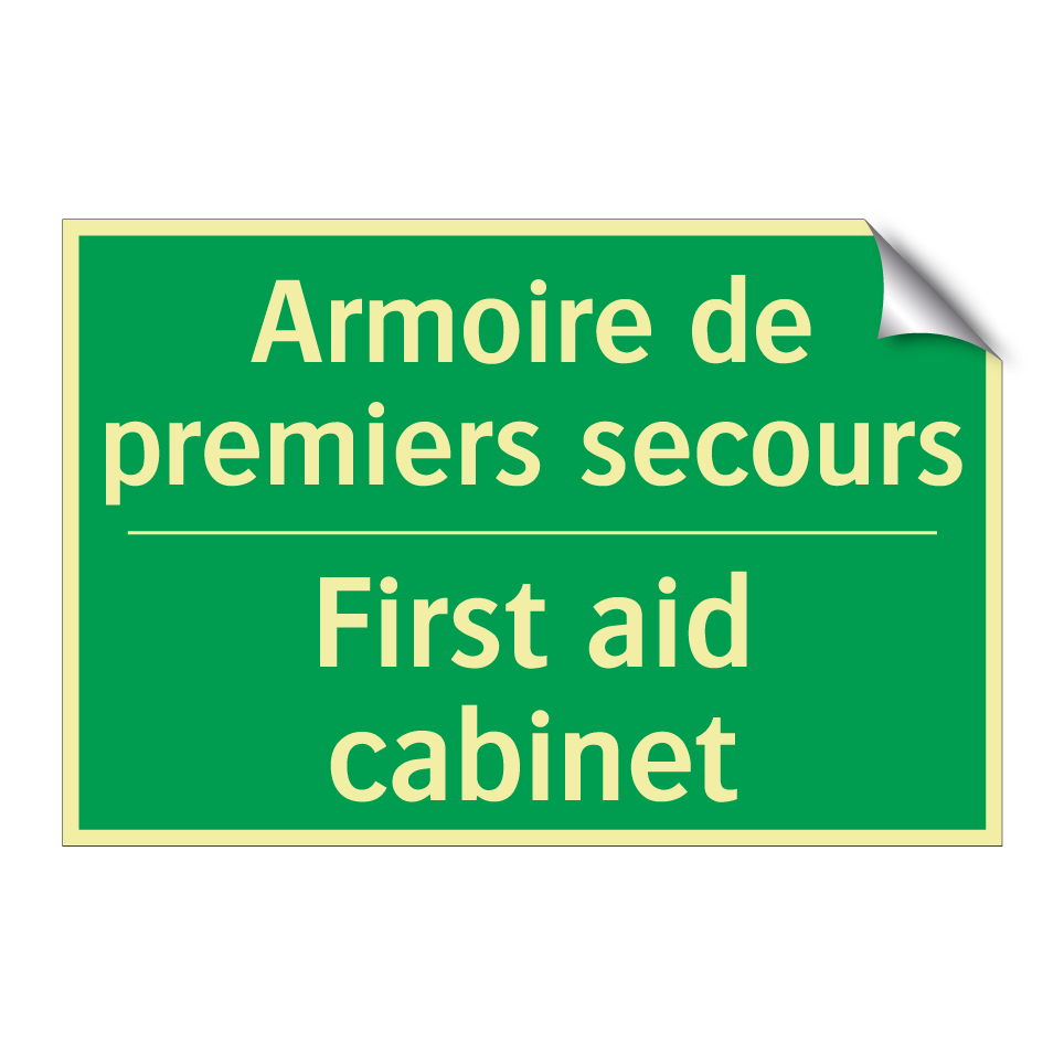 Panneau de secours bilingue avec texte en français : "Armoire de premiers secours", et en anglais : "First aid cabinet"