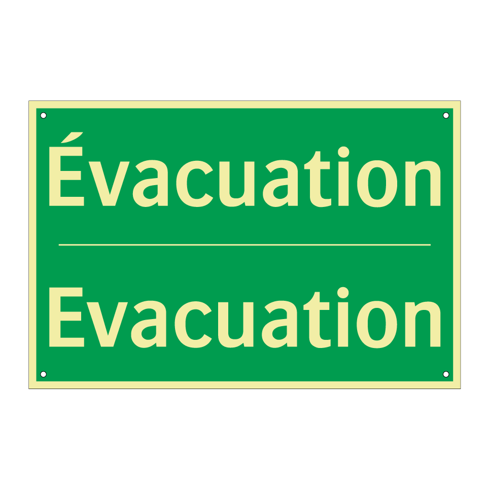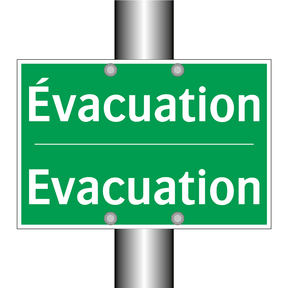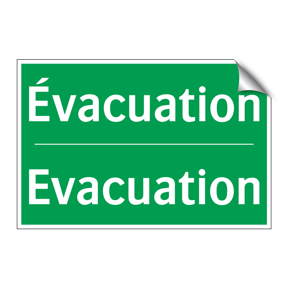 Panneau de secours bilingue avec texte en français : "Évacuation", et en anglais : "Evacuation"