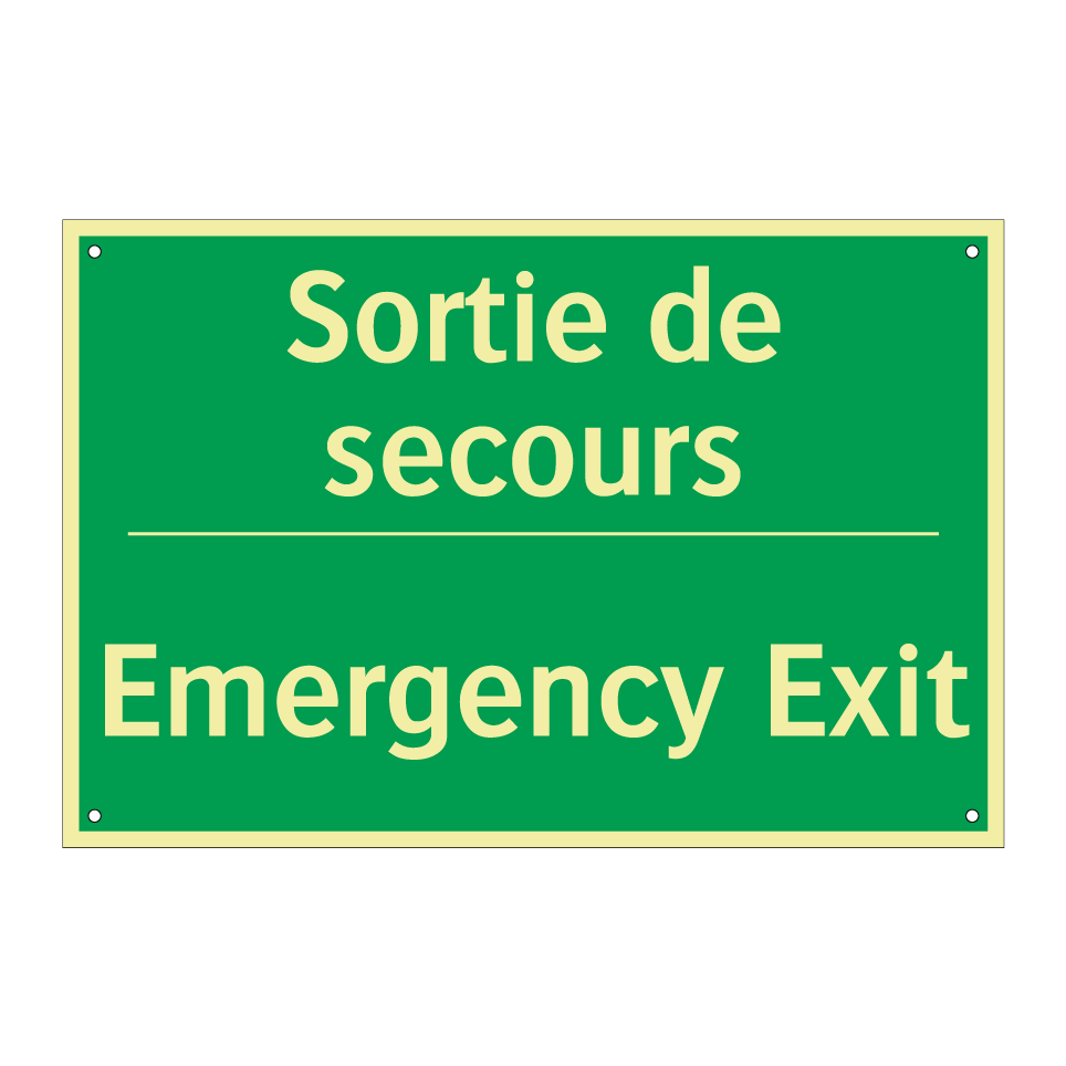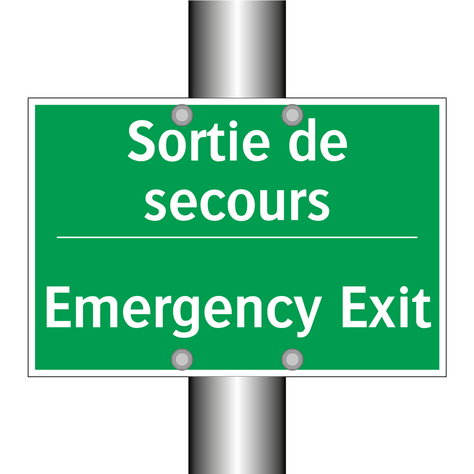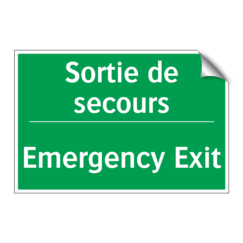Panneau de secours bilingue avec texte en français : "Sortie de secours", et en anglais : "Emergency Exit"