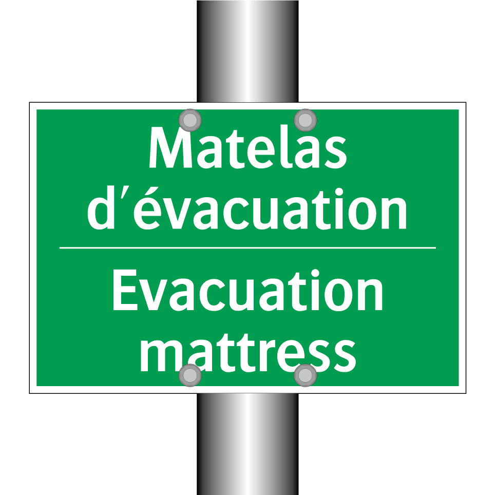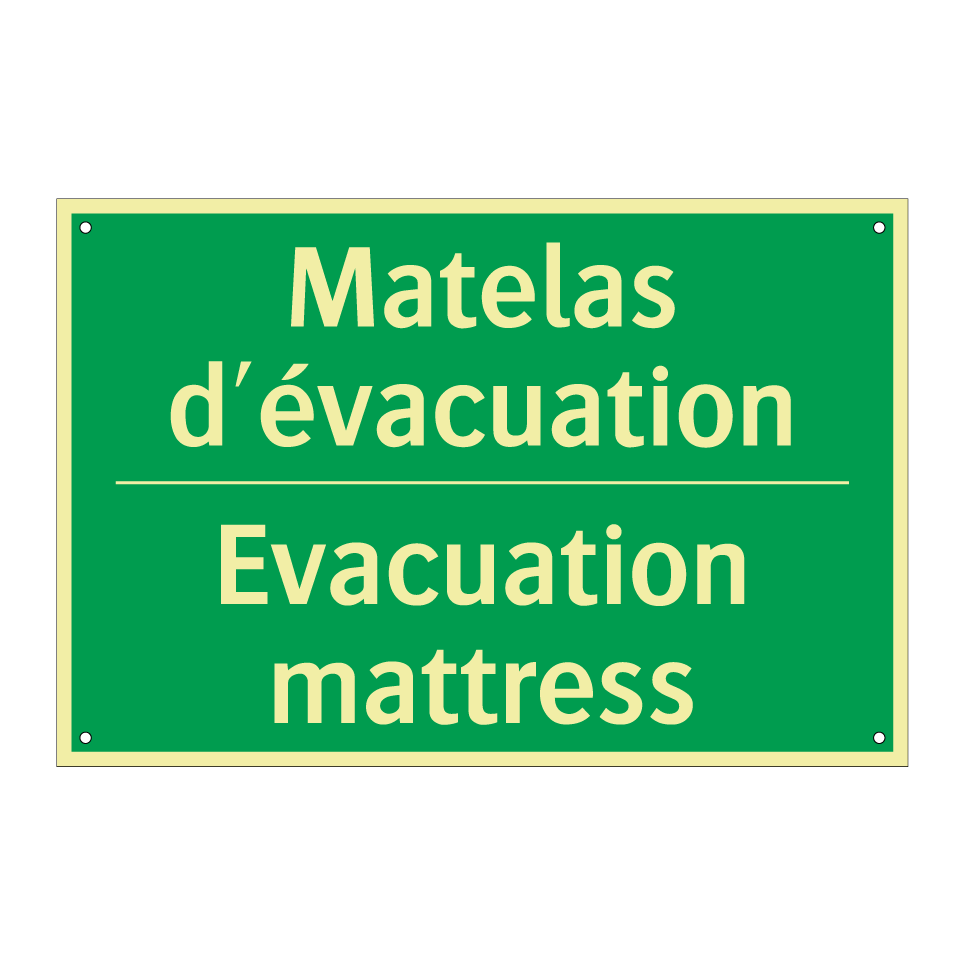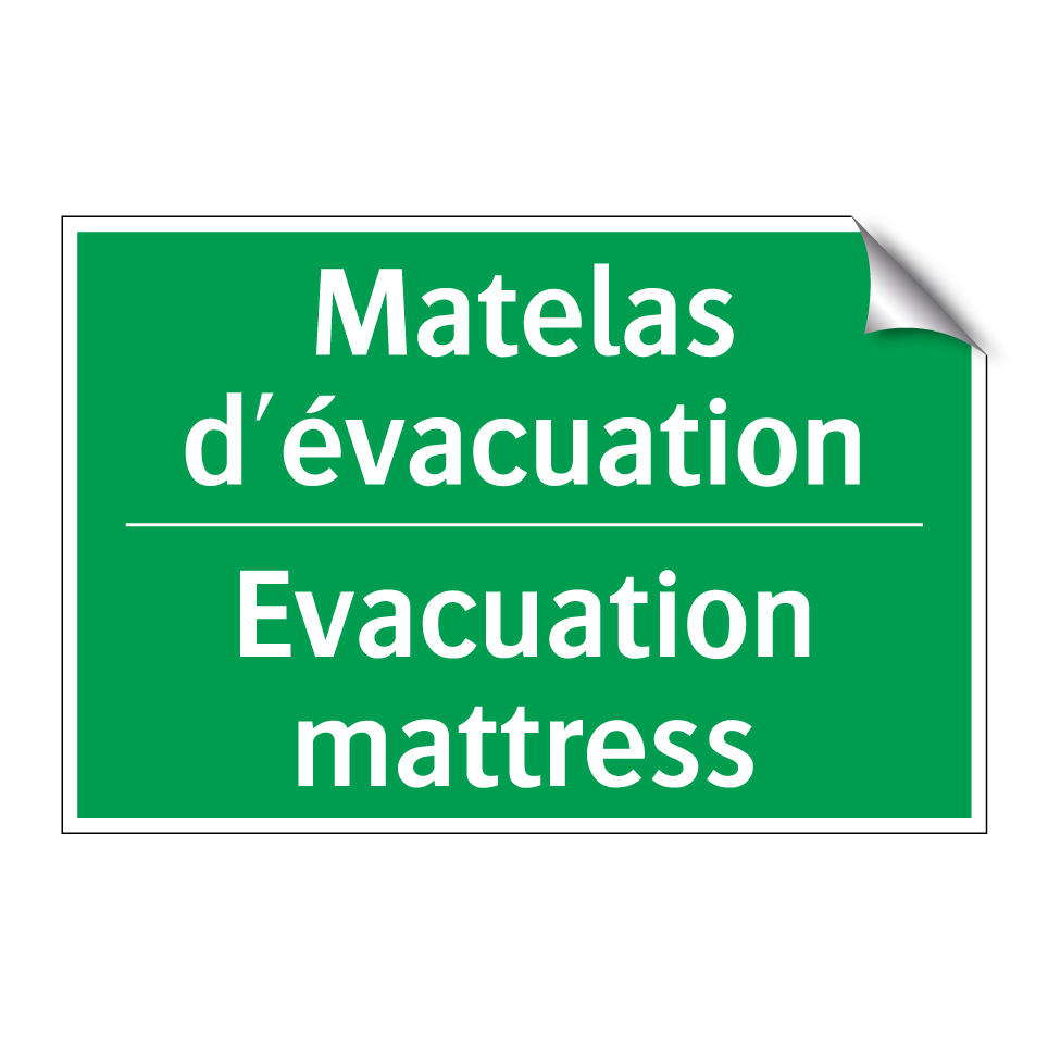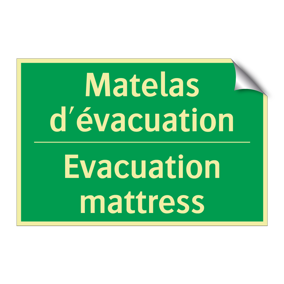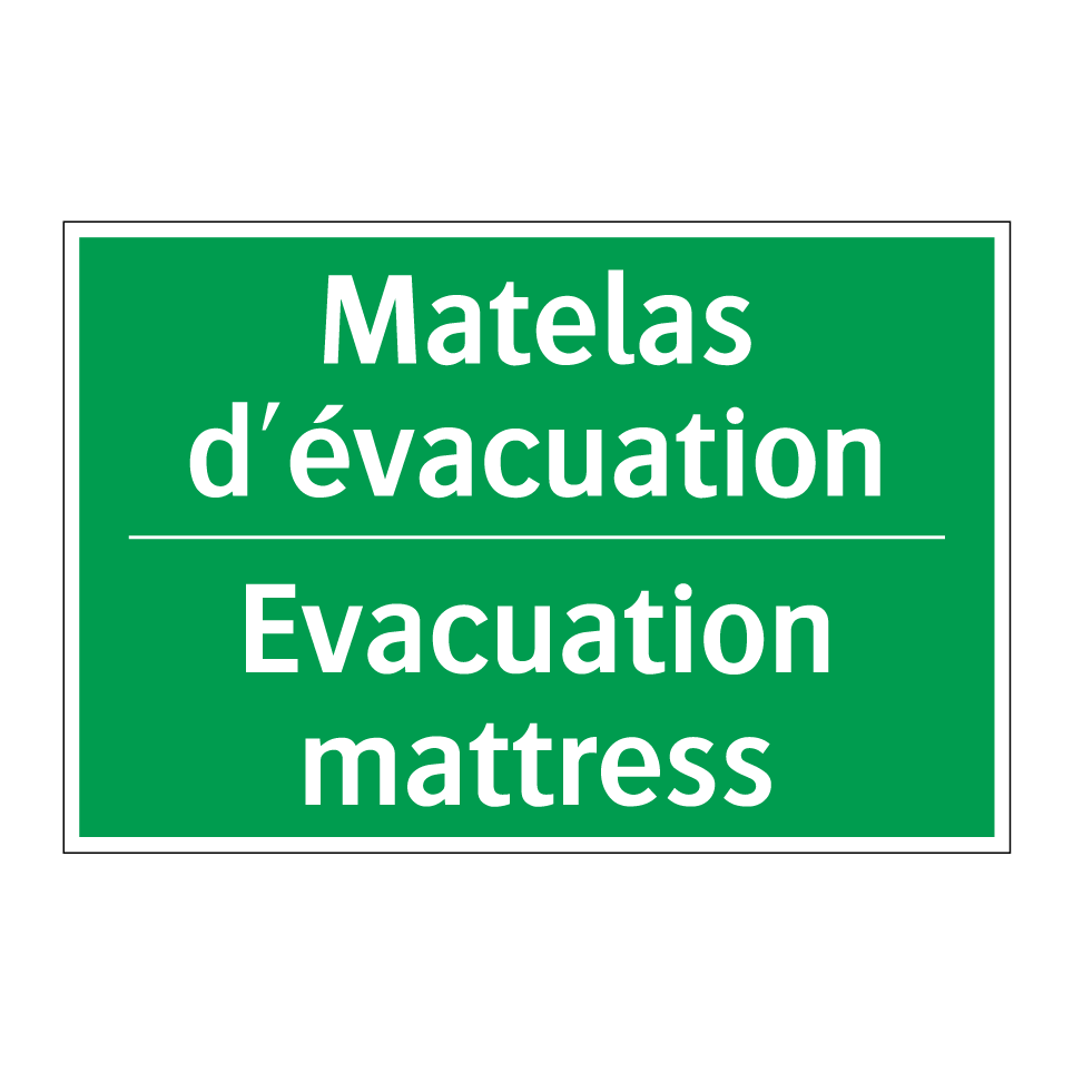 Panneau de secours bilingue avec texte en français : "Matelas d'évacuation", et en anglais : "Evacuation mattress"