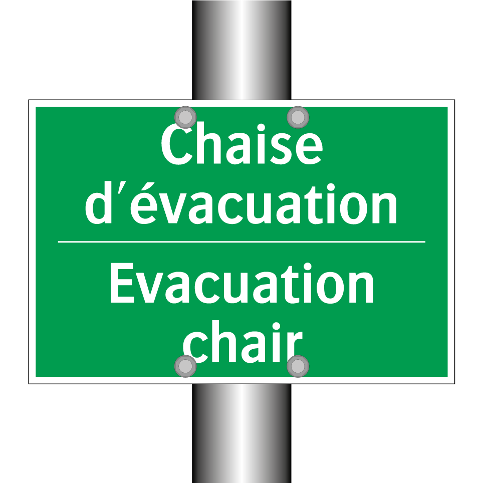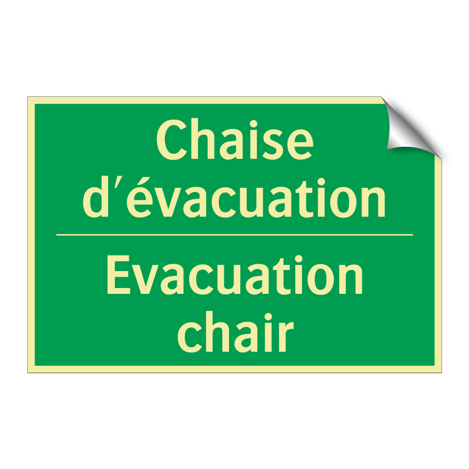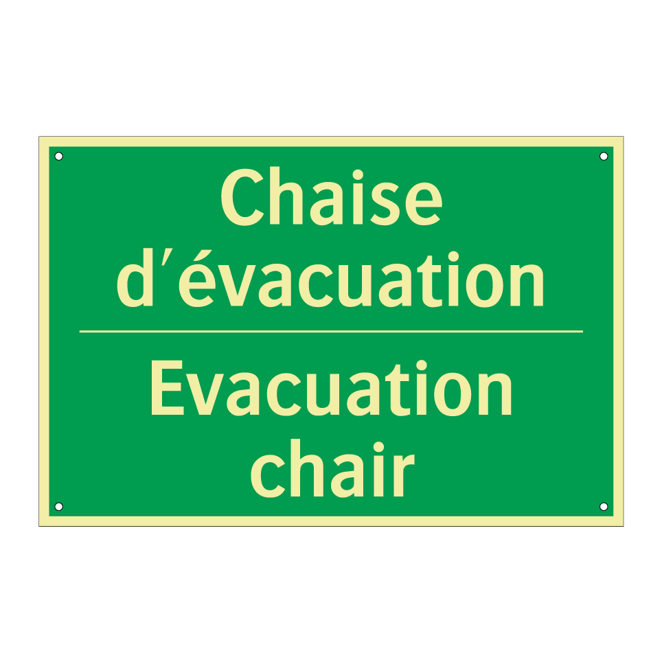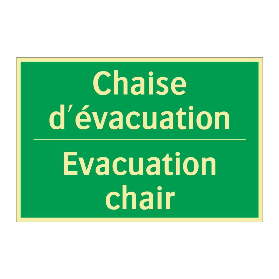 Panneau de secours bilingue avec texte en français : "Chaise d'évacuation", et en anglais : "Evacuation chair"
