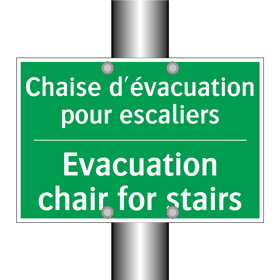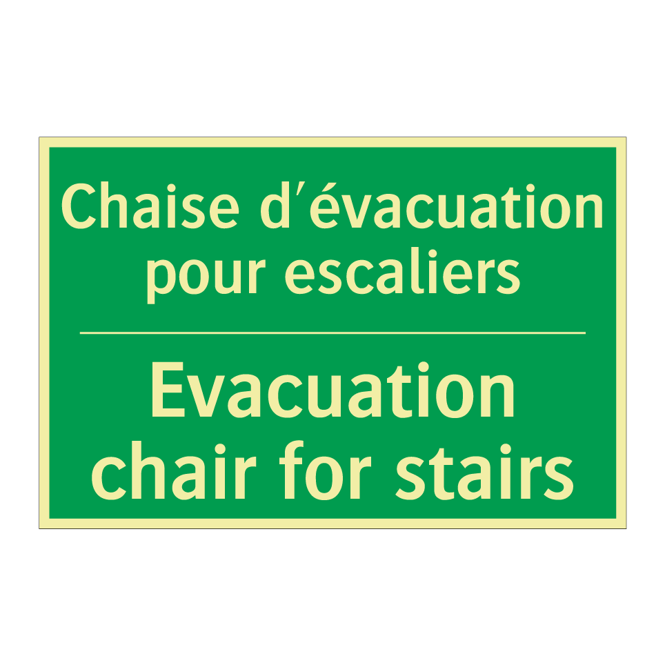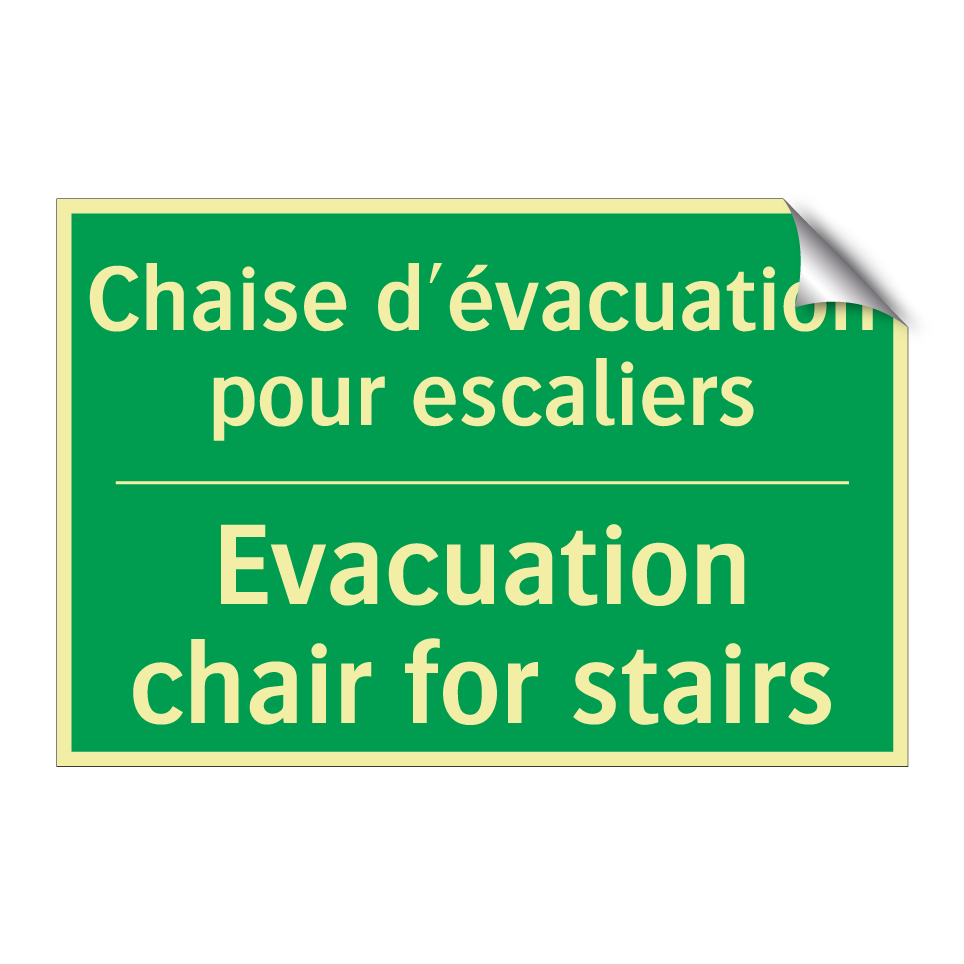Panneau de secours bilingue avec texte en français : "Chaise d'évacuation pour escaliers", et en anglais : "Evacuation chair for stairs"