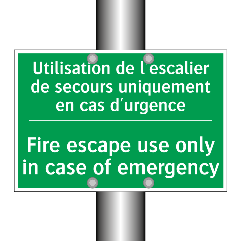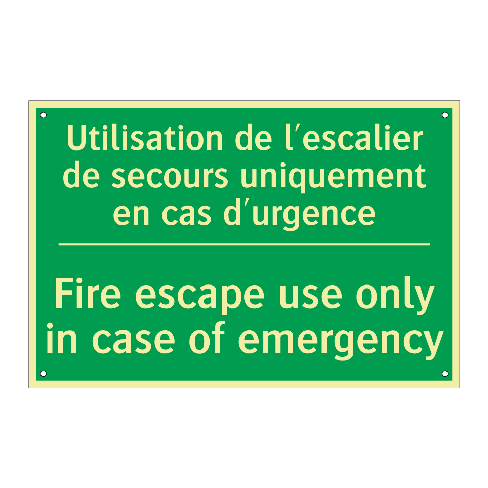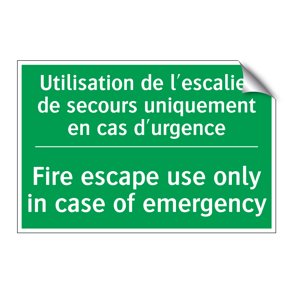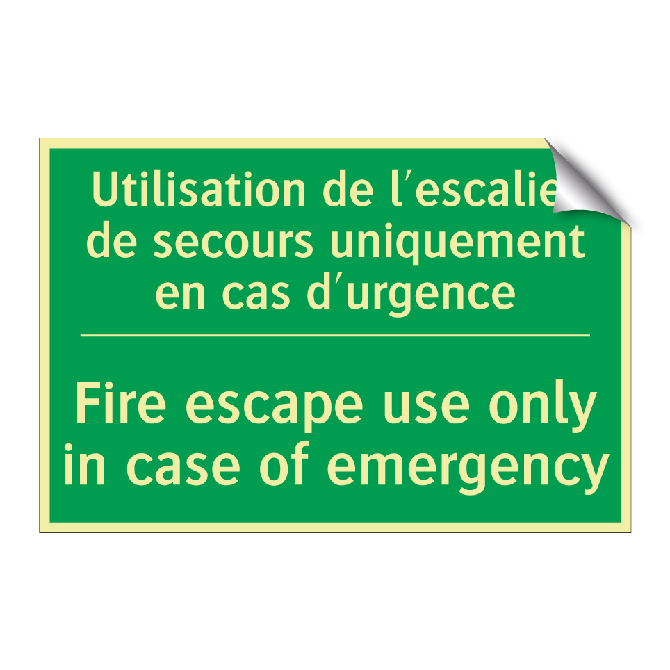 Panneau de secours bilingue avec texte en français : "Utilisation de l'escalier de secours uniquement en cas d'urgence", et en anglais : "Fire escape use only in case of emergency"