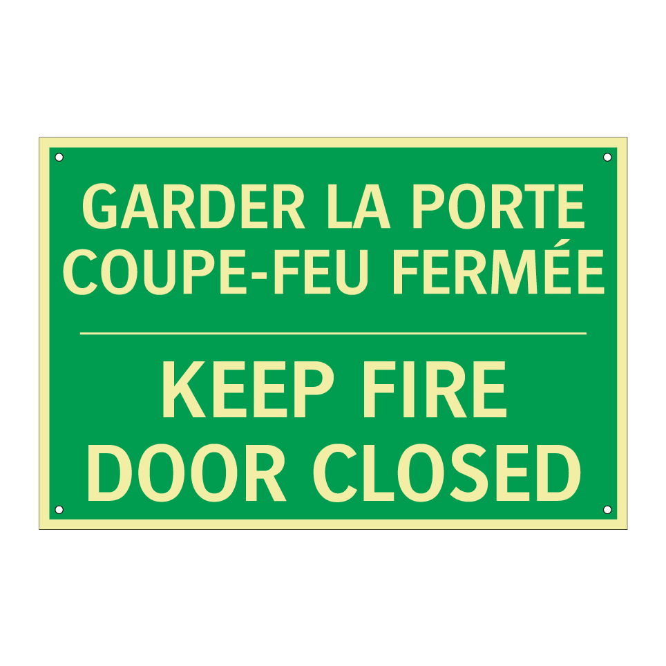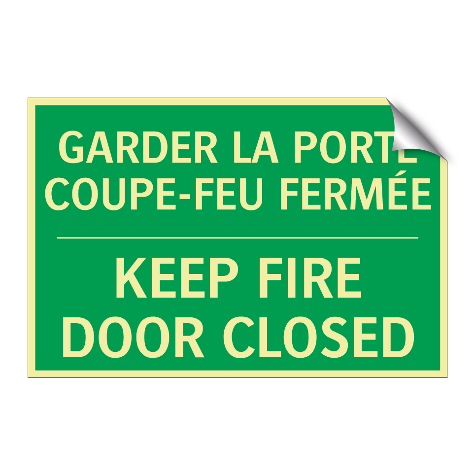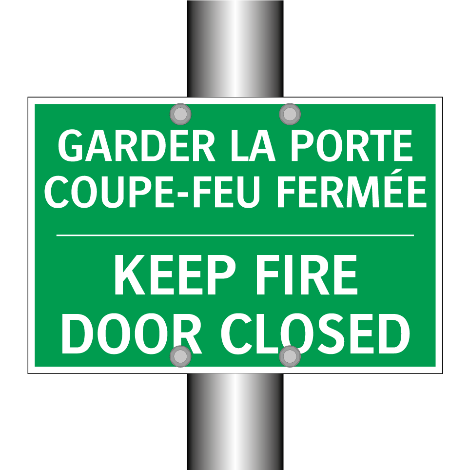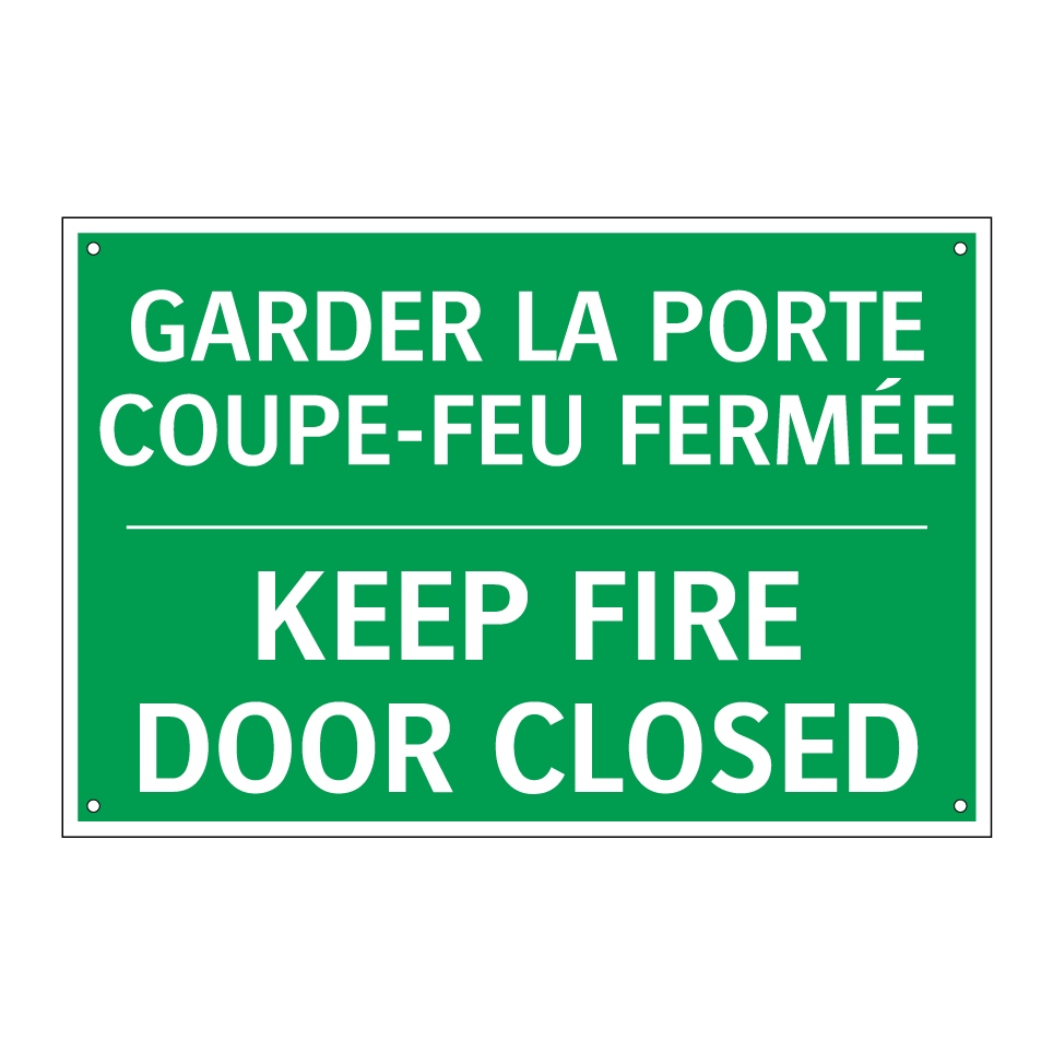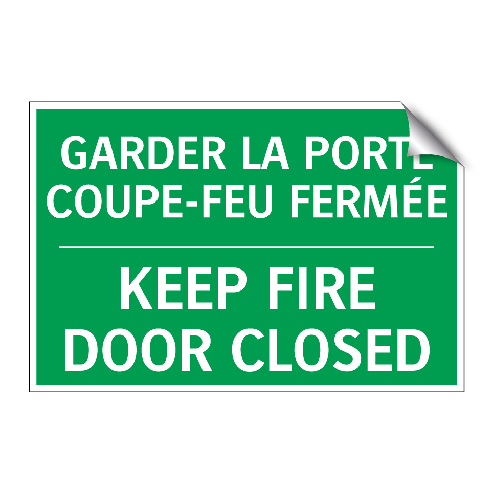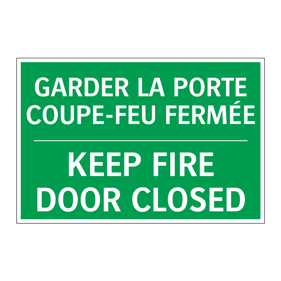 Panneau de secours bilingue avec texte en français : "GARDER LA PORTE COUPE-FEU FERMÉE", et en anglais : "KEEP FIRE DOOR CLOSED"