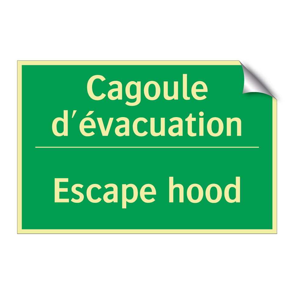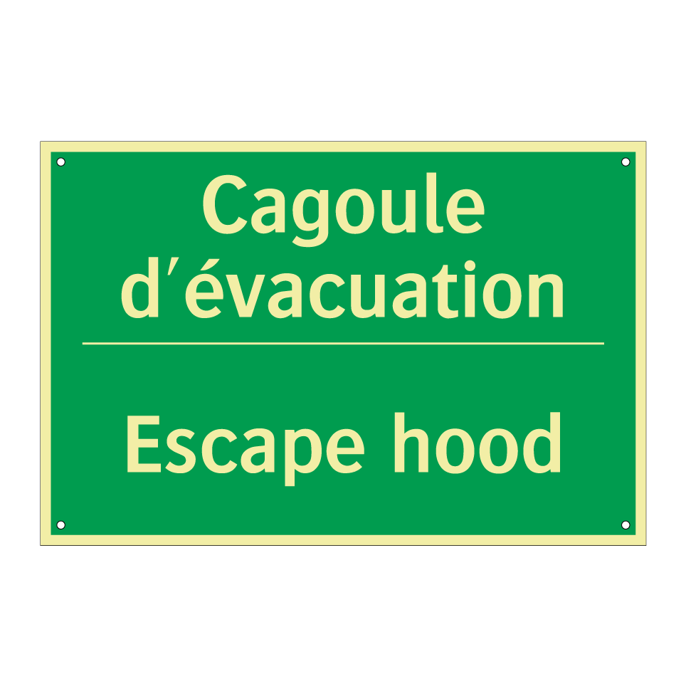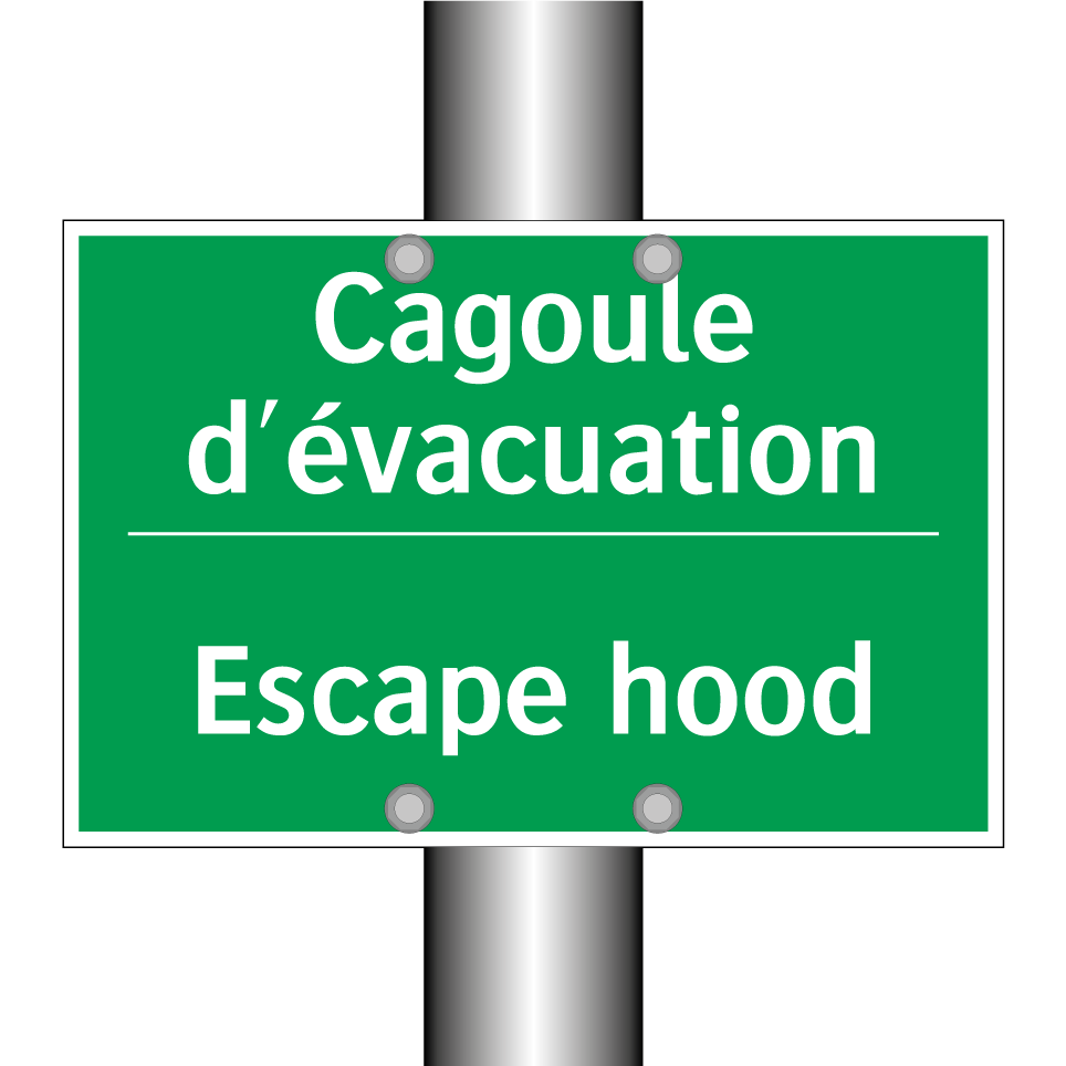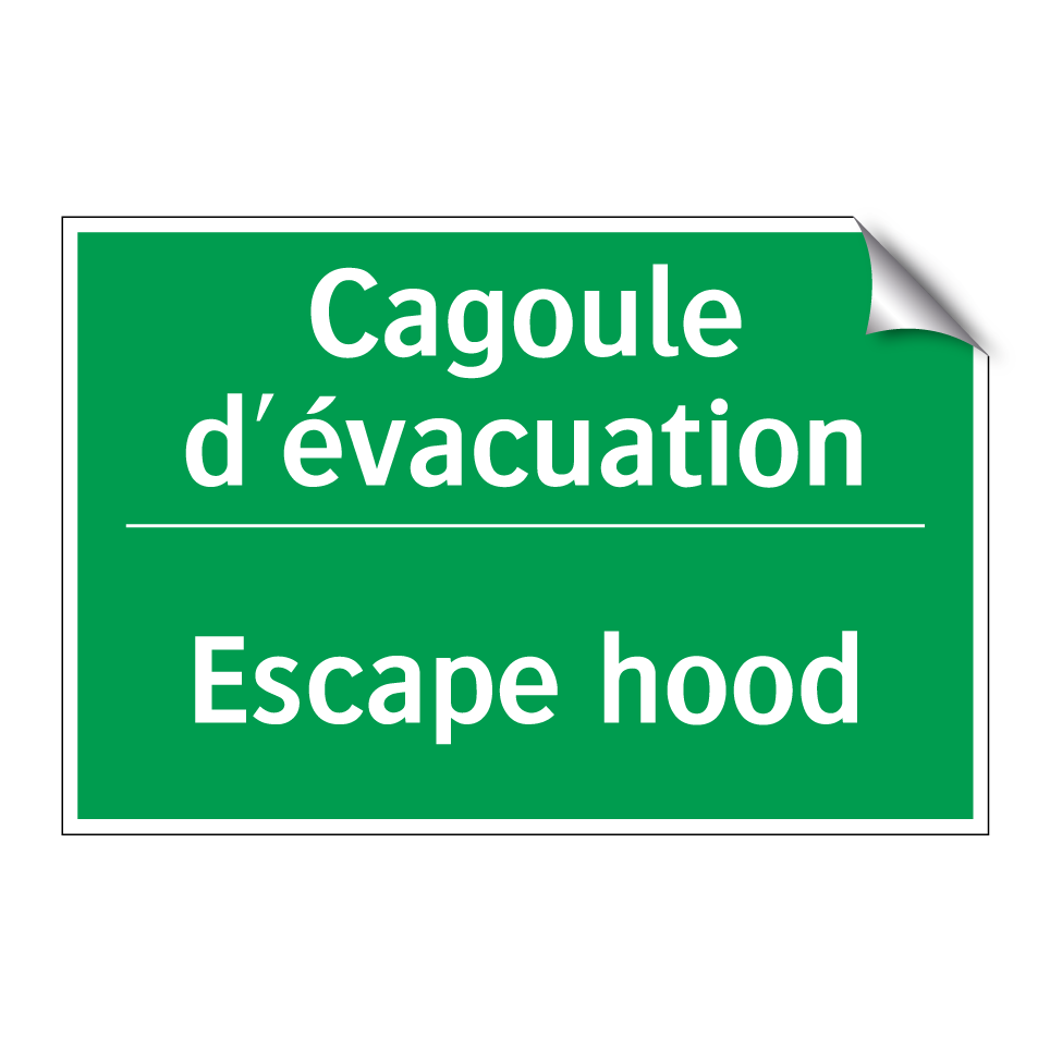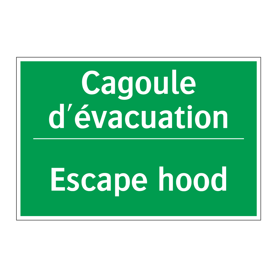Panneau de secours bilingue avec texte en français : "Cagoule d'évacuation", et en anglais : "Escape hood"