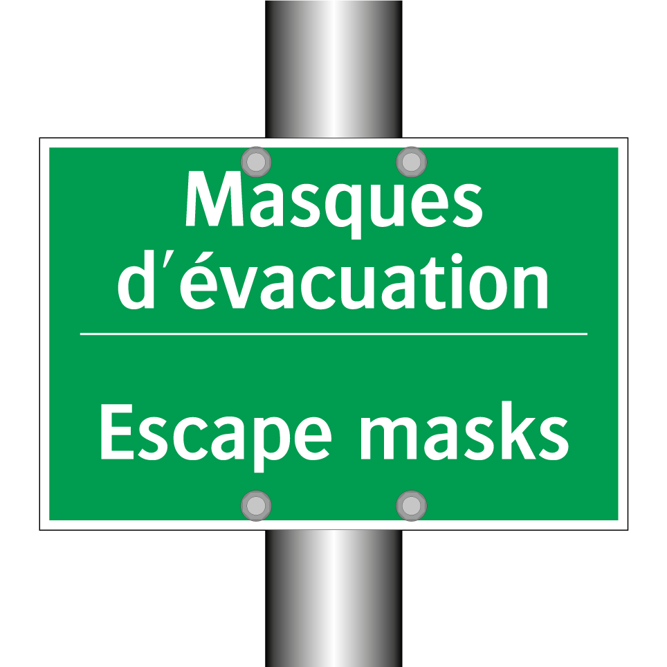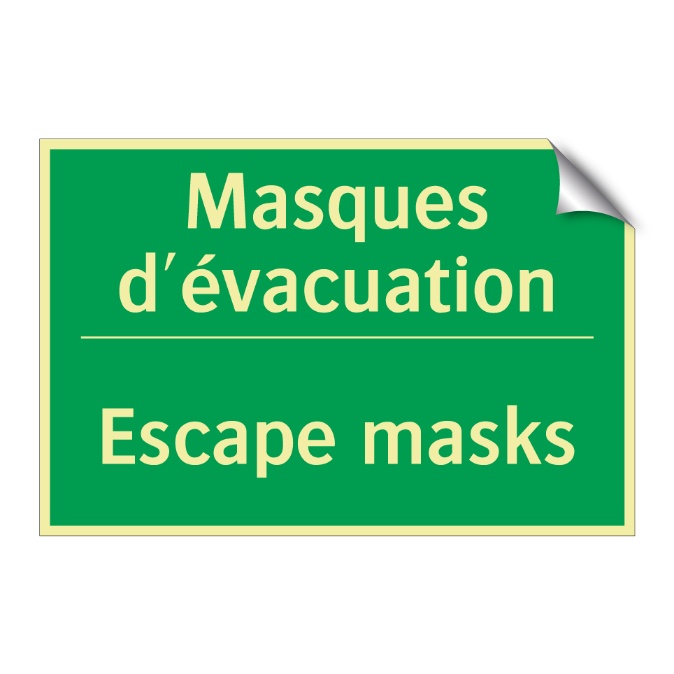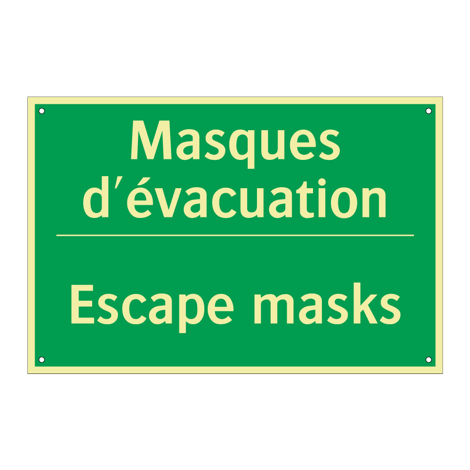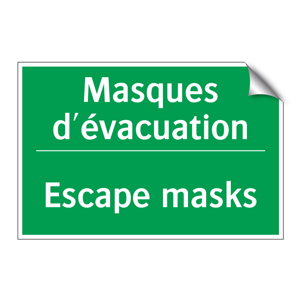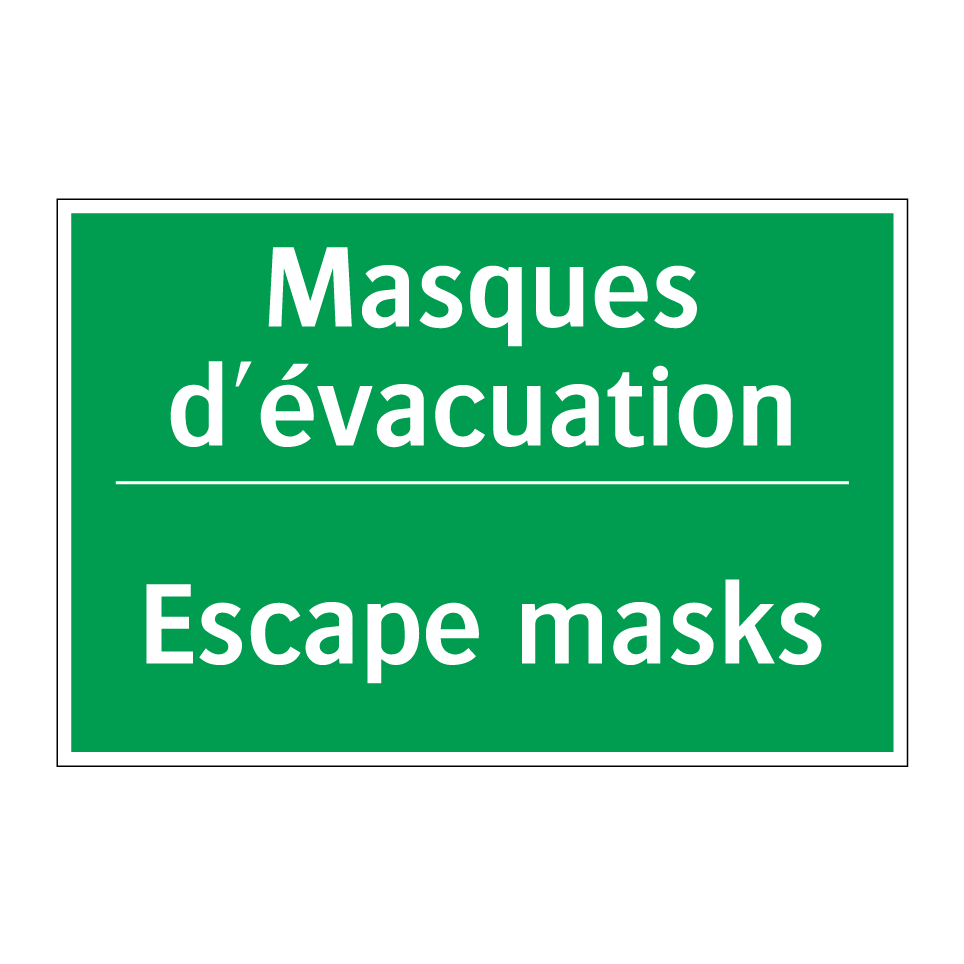 Panneau de secours bilingue avec texte en français : "Masques d'évacuation", et en anglais : "Escape masks"