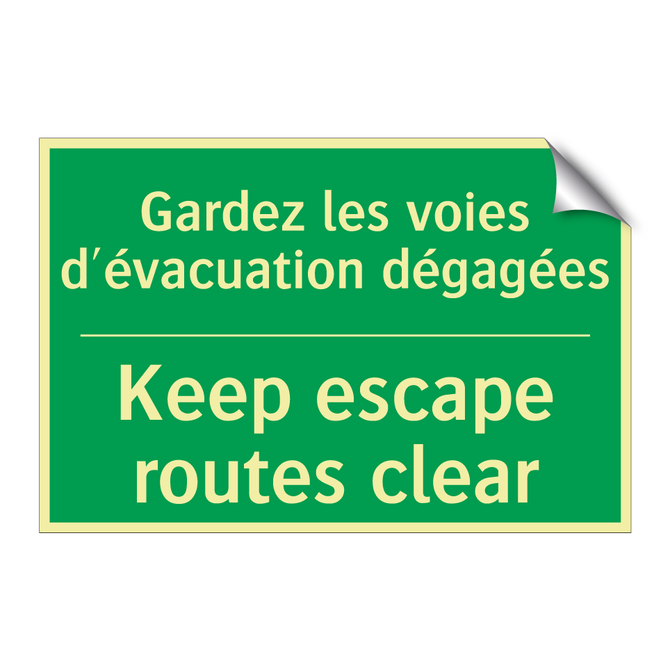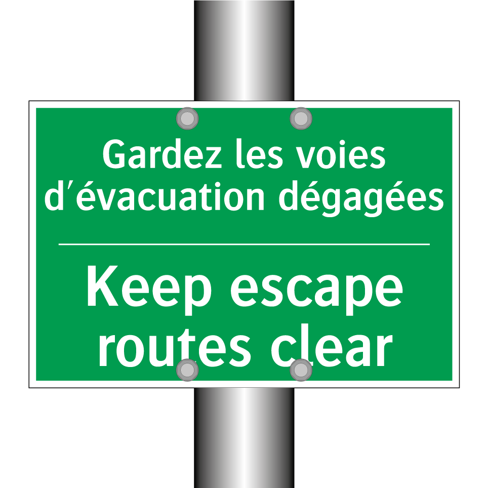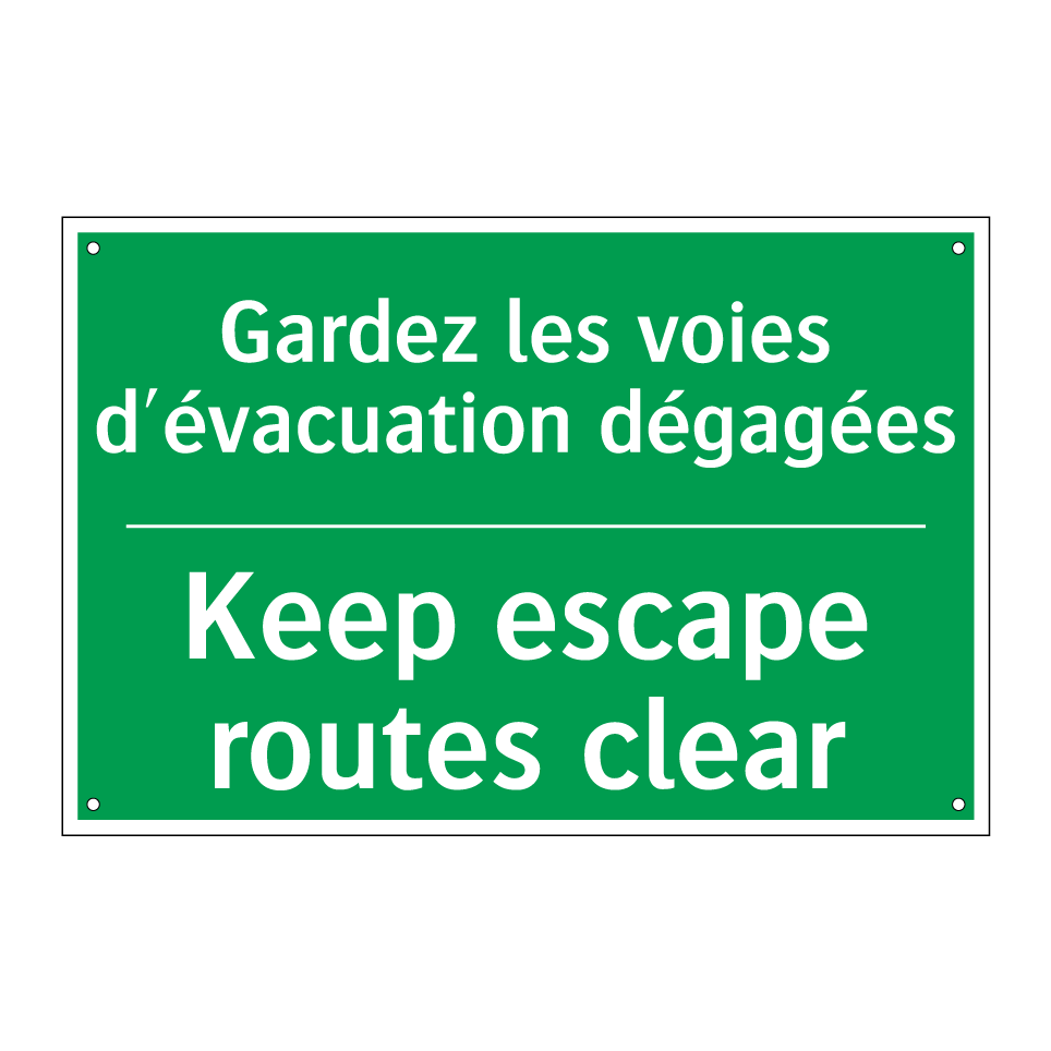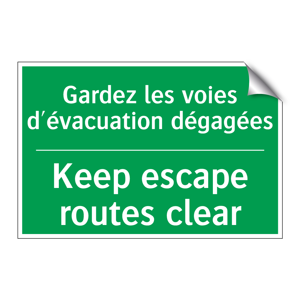 Panneau de secours bilingue avec texte en français : "Gardez les voies d'évacuation dégagées", et en anglais : "Keep escape routes clear"