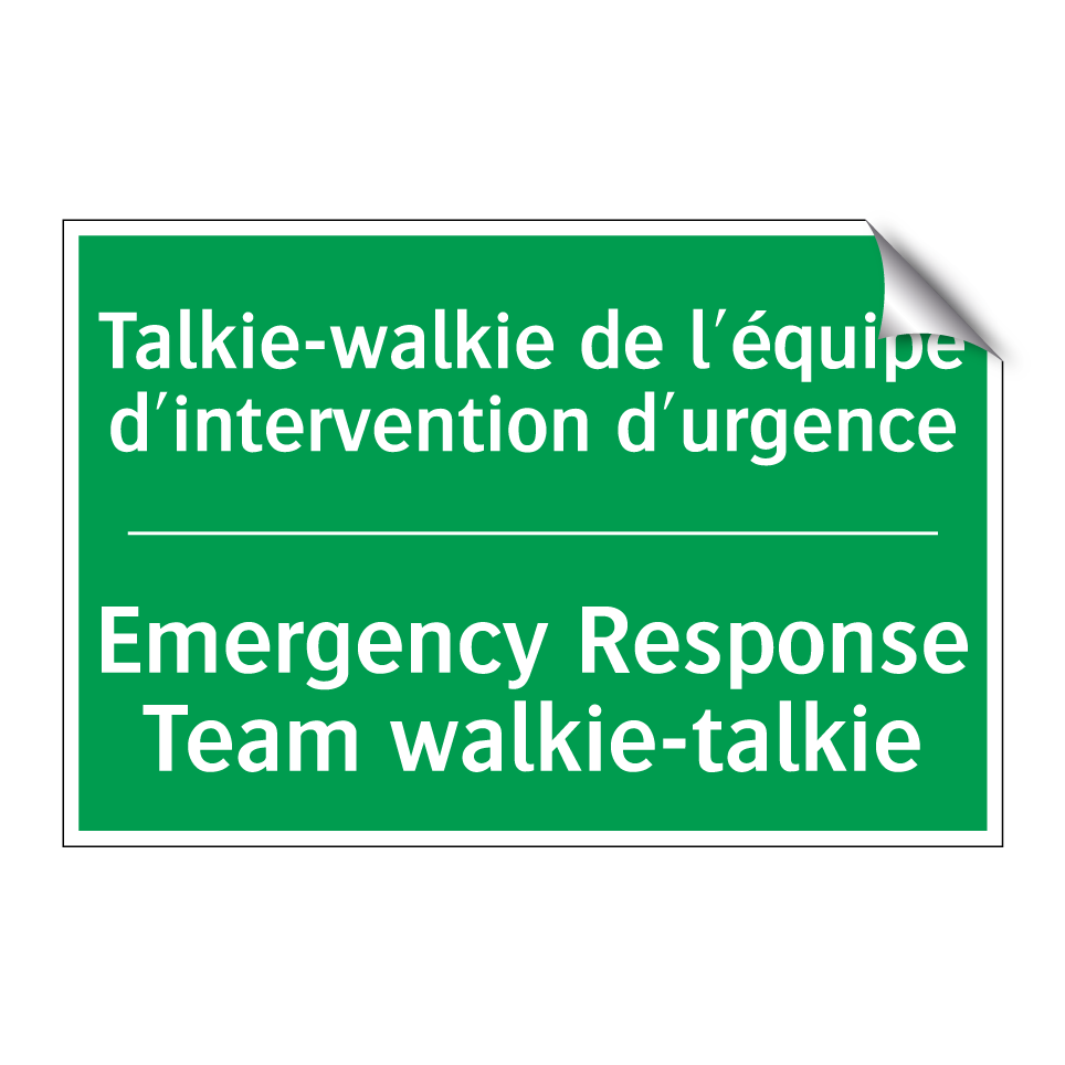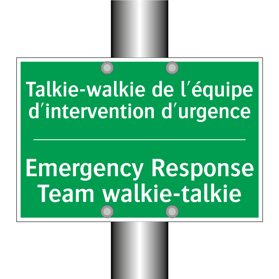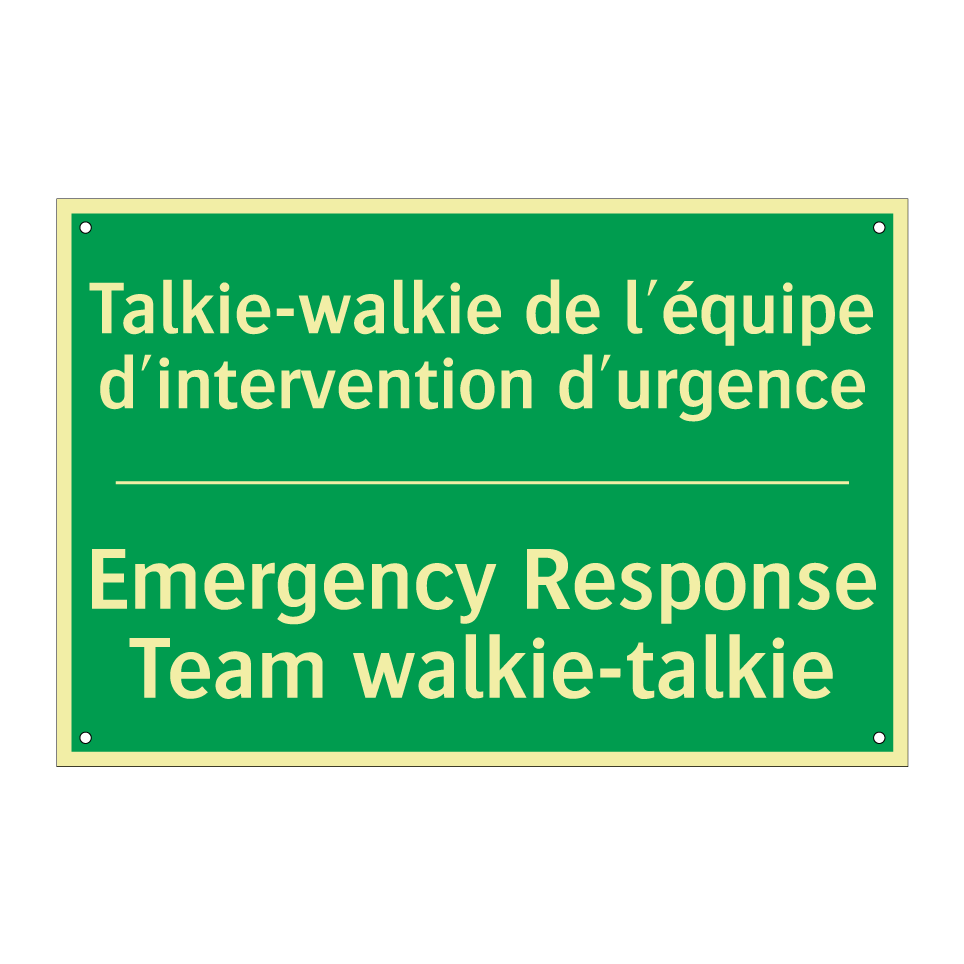 Panneau de secours bilingue avec texte en français : "Talkie-walkie de l'équipe d'intervention d'urgence", et en anglais : "Emergency Response Team walkie-talkie"