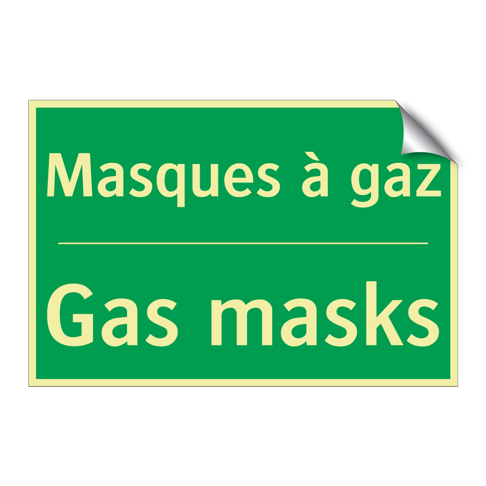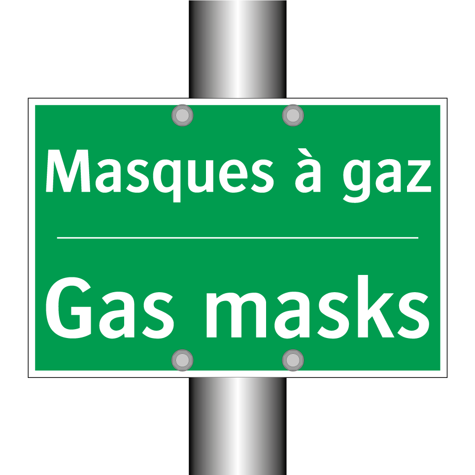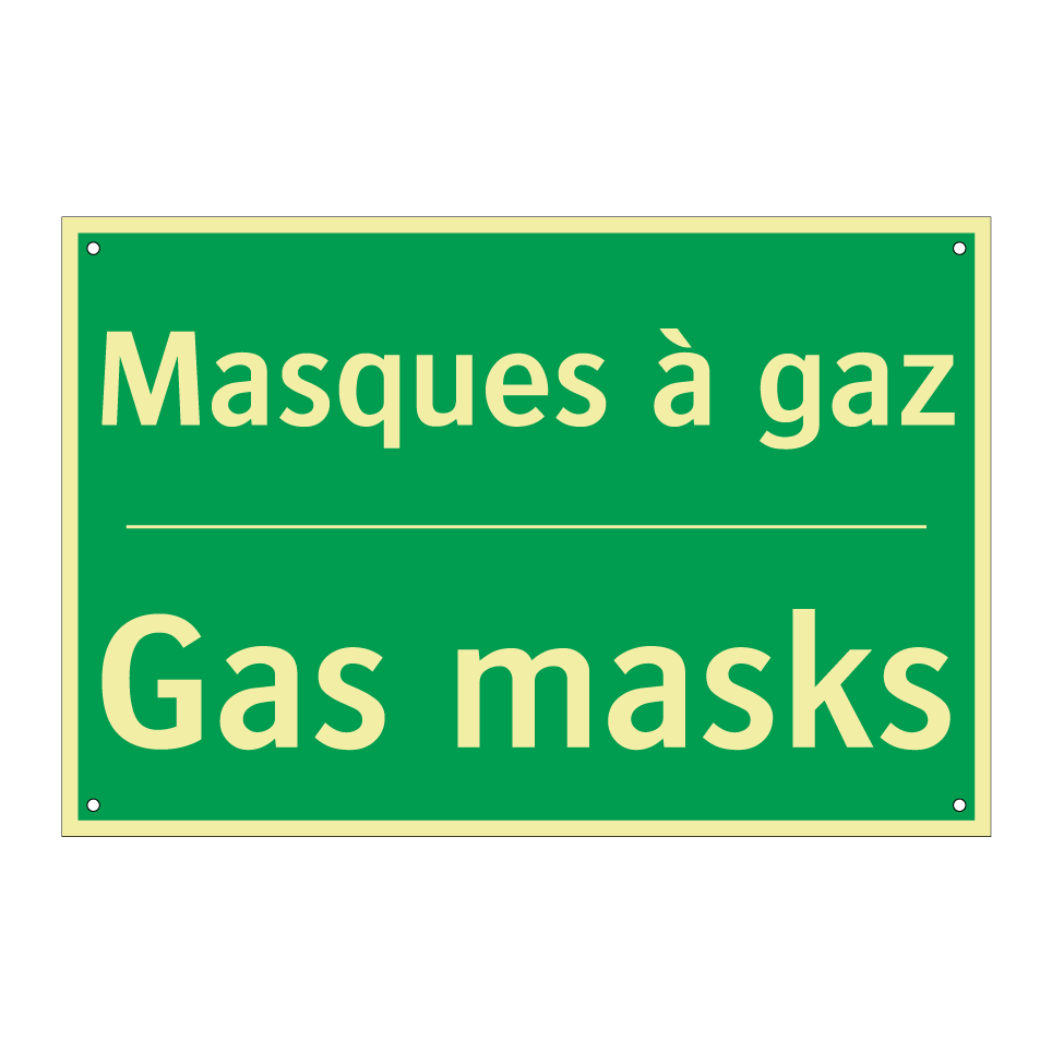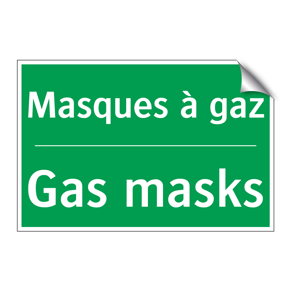 Panneau de secours bilingue avec texte en français : "Masques à gaz", et en anglais : "Gas masks"