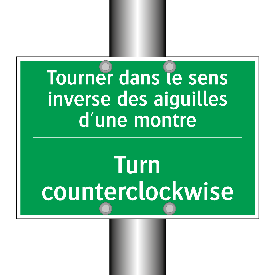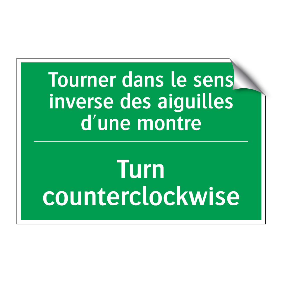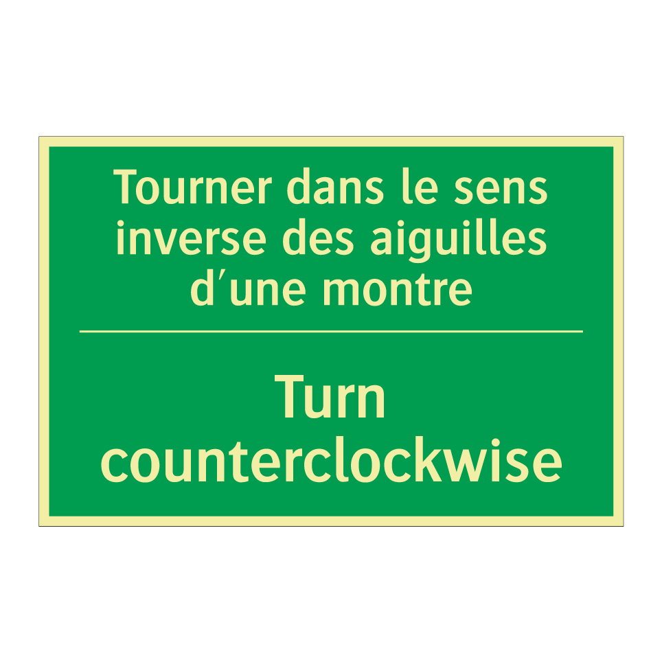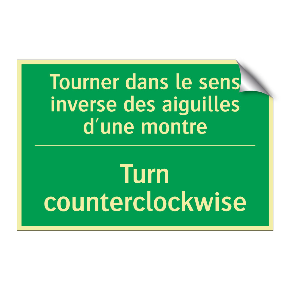 Panneau de secours bilingue avec texte en français : "Tourner dans le sens inverse des aiguilles d'une montre", et en anglais : "Turn counterclockwise"