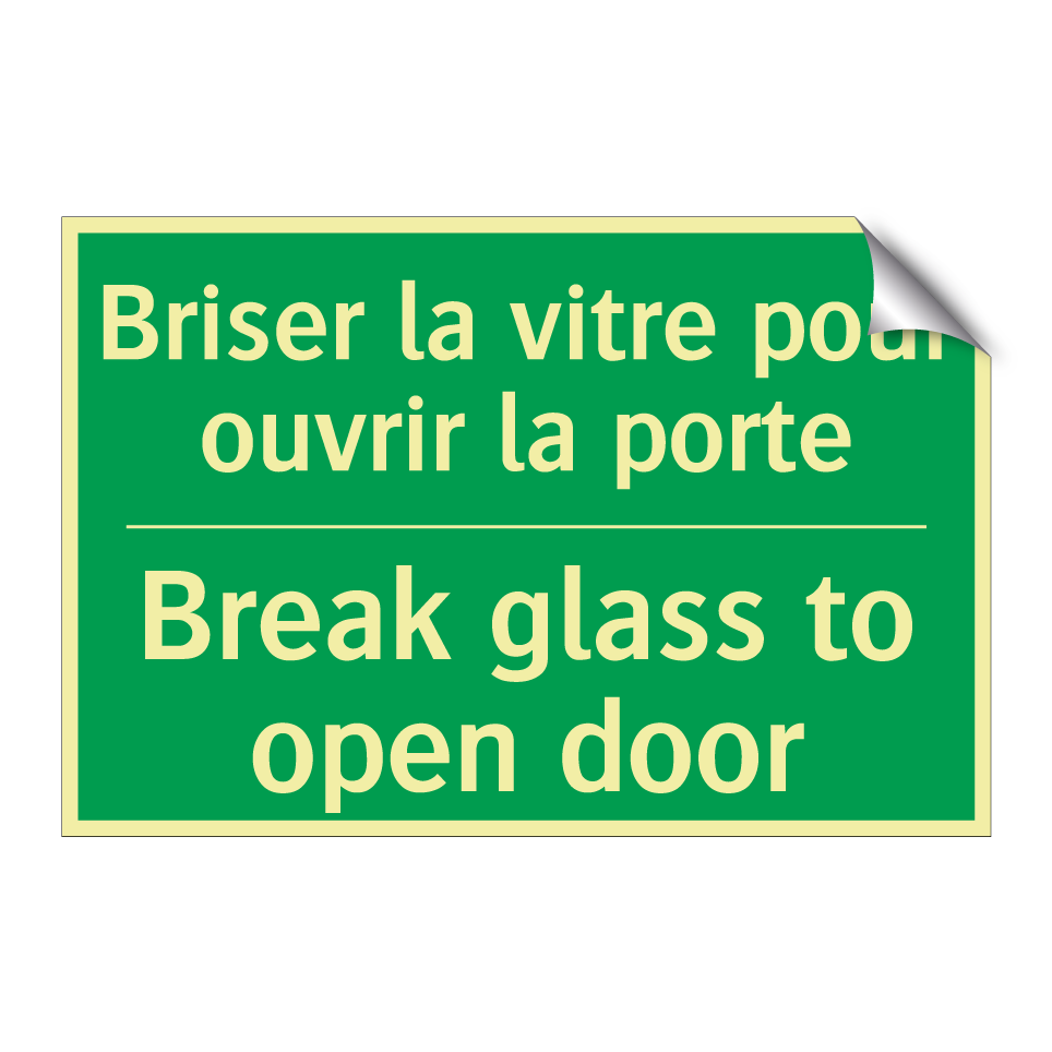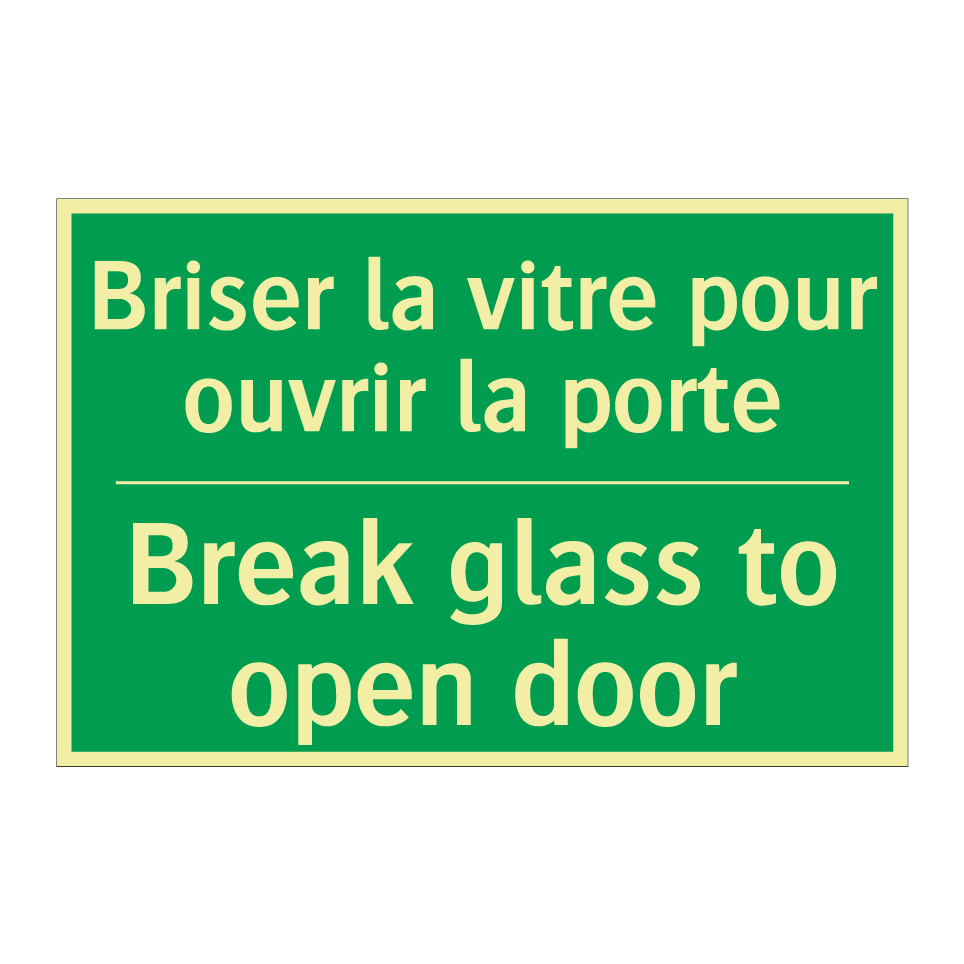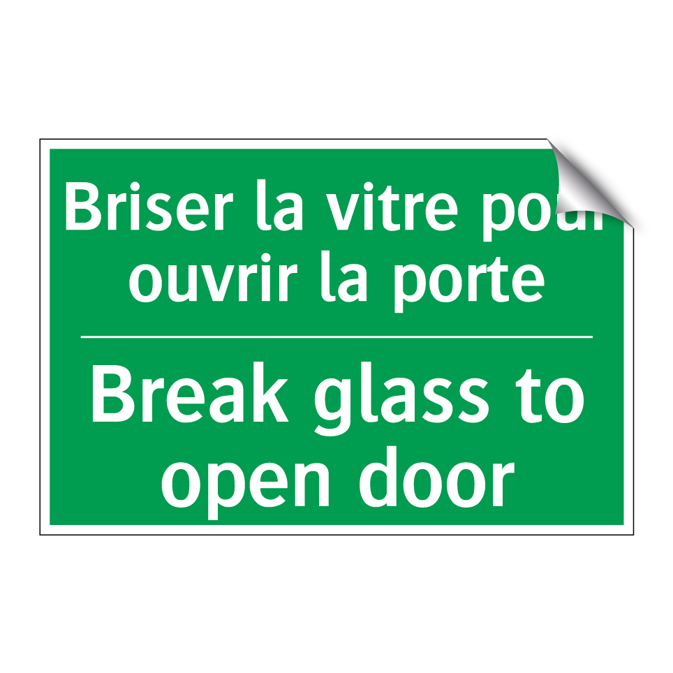 Panneau de secours bilingue avec texte en français : "Briser la vitre pour ouvrir la porte", et en anglais : "Break glass to open door"