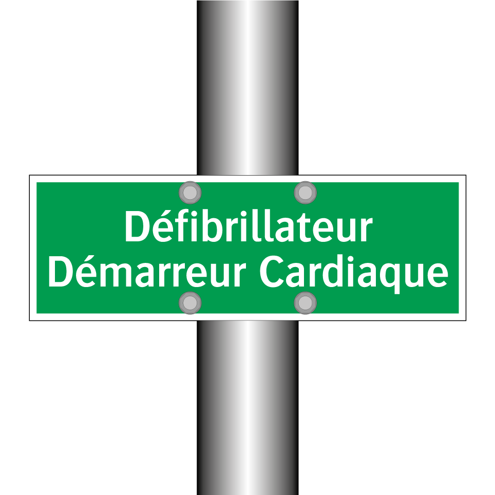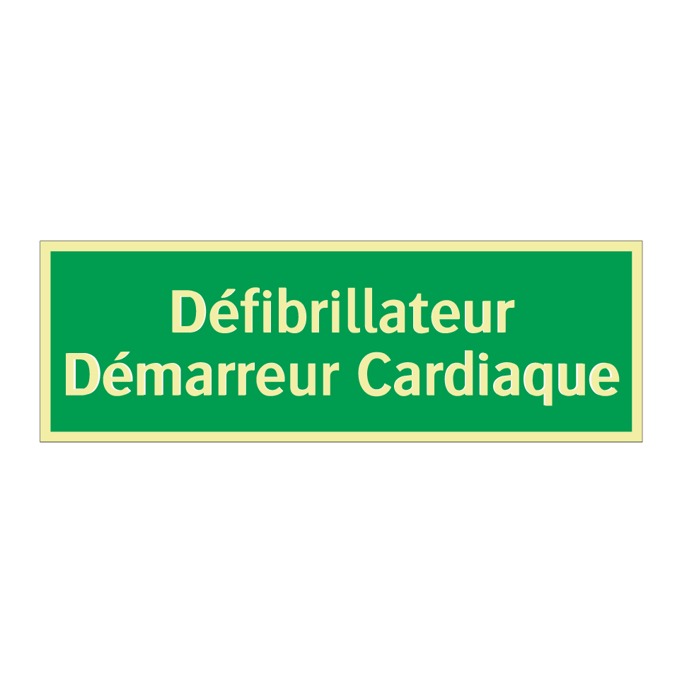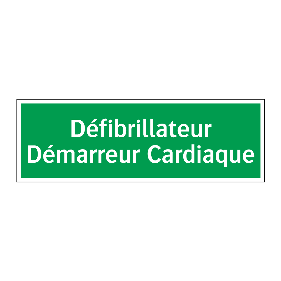 Panneau de secours avec le texte Défibrillateur Démarreur Cardiaque