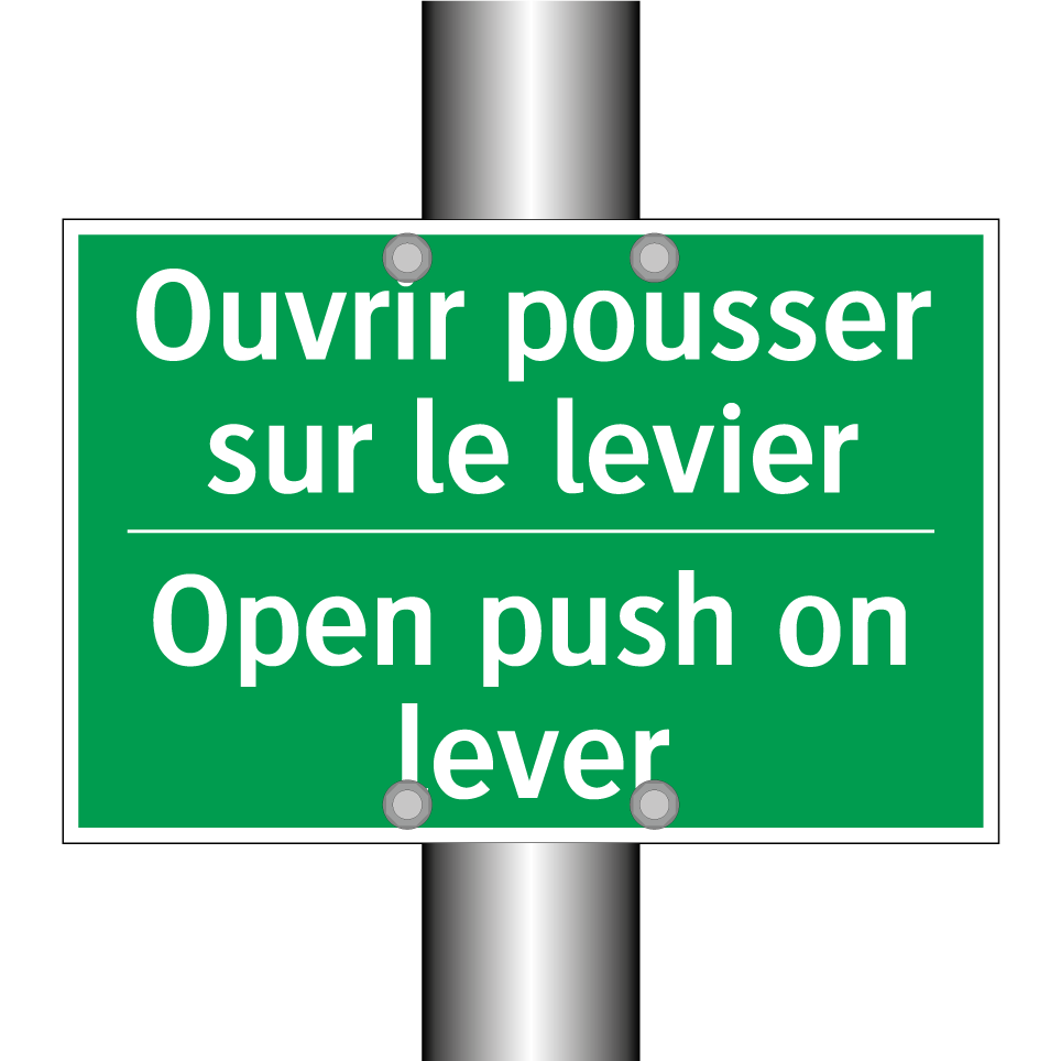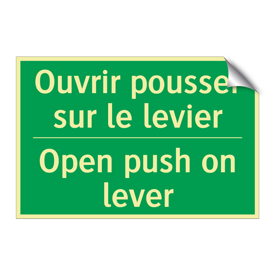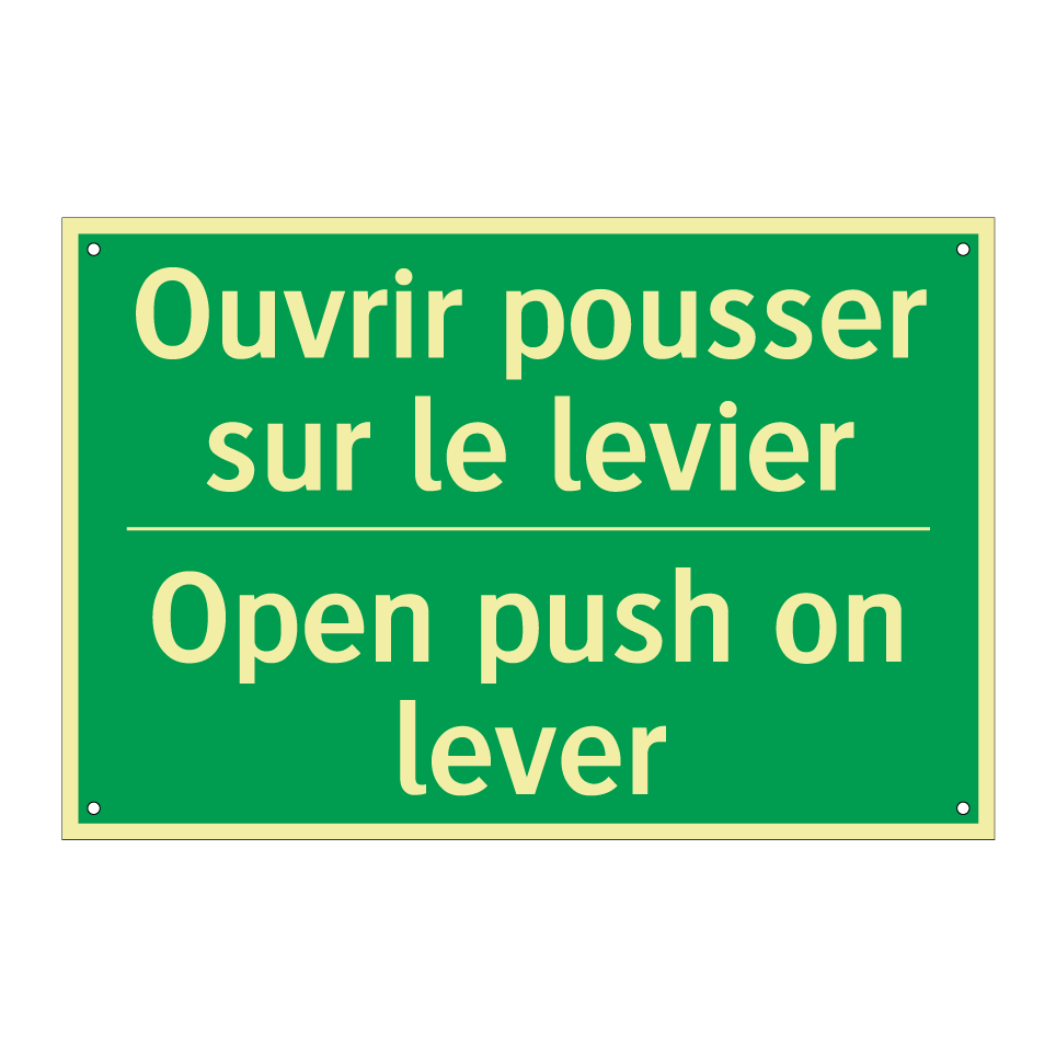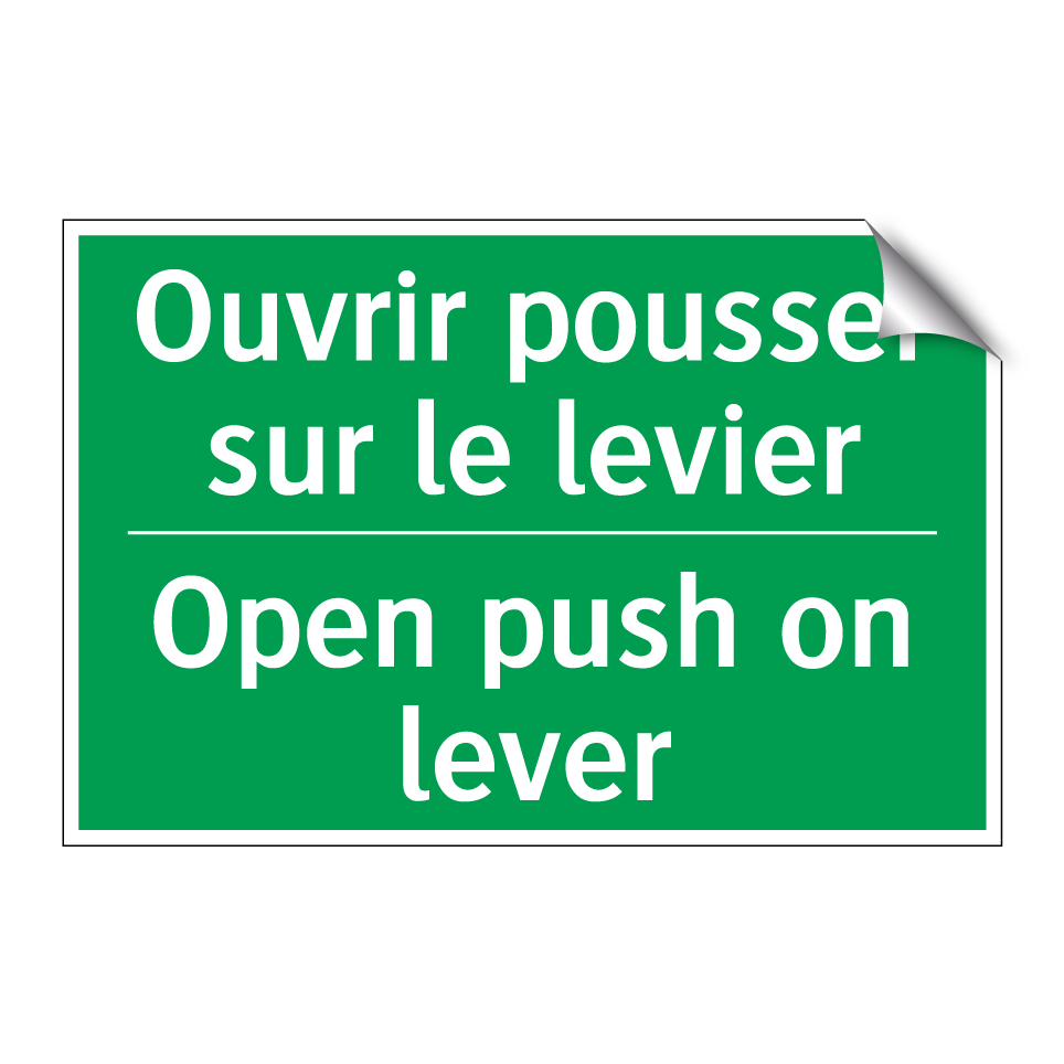 Panneau de secours bilingue avec texte en français : "Ouvrir pousser sur le levier", et en anglais : "Open push on lever"