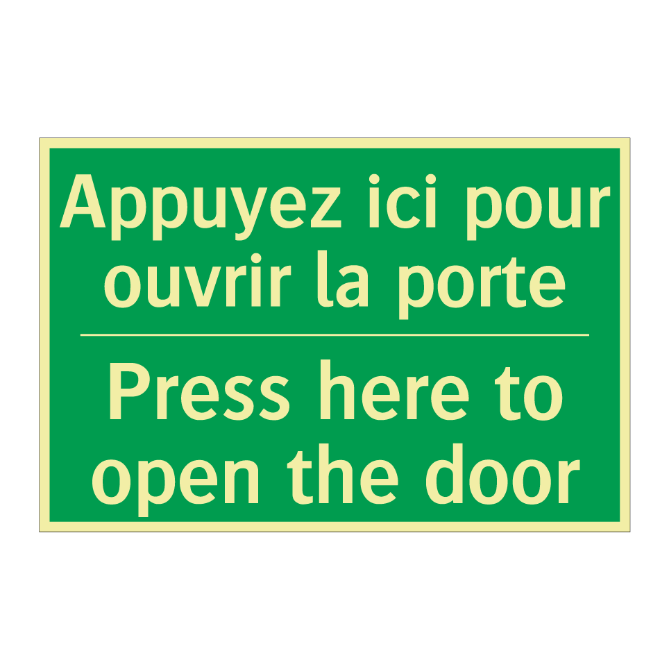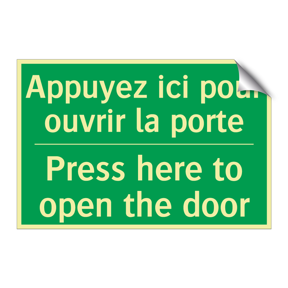 Panneau de secours bilingue avec texte en français : "Appuyez ici pour ouvrir la porte", et en anglais : "Press here to open the door"