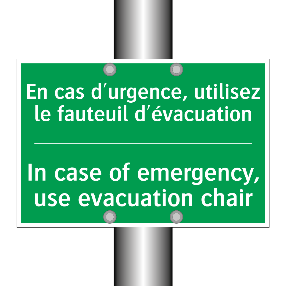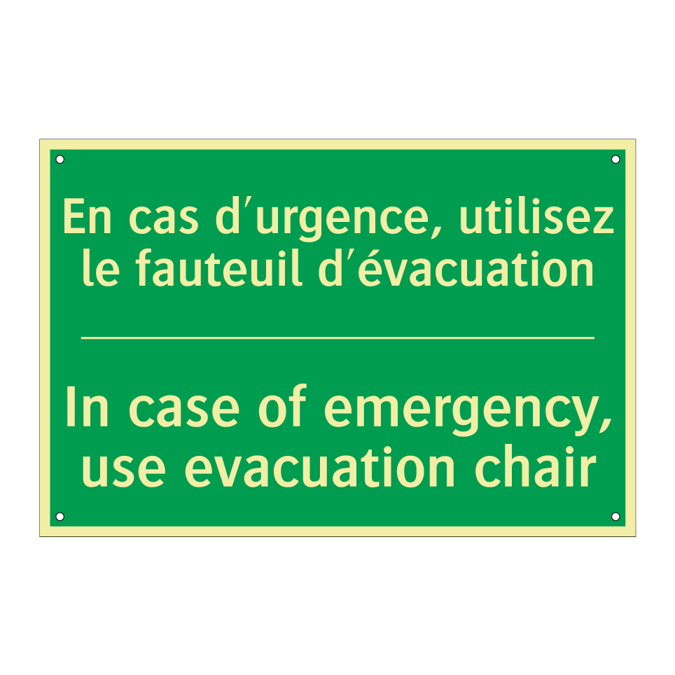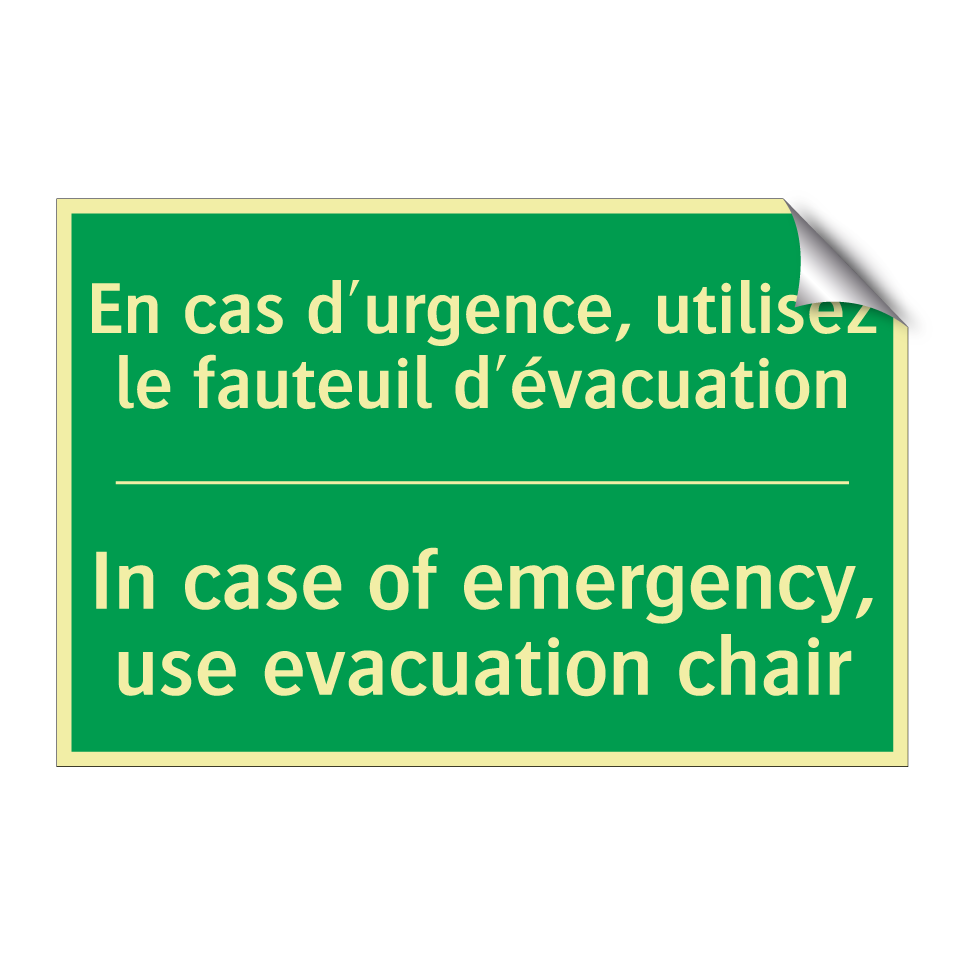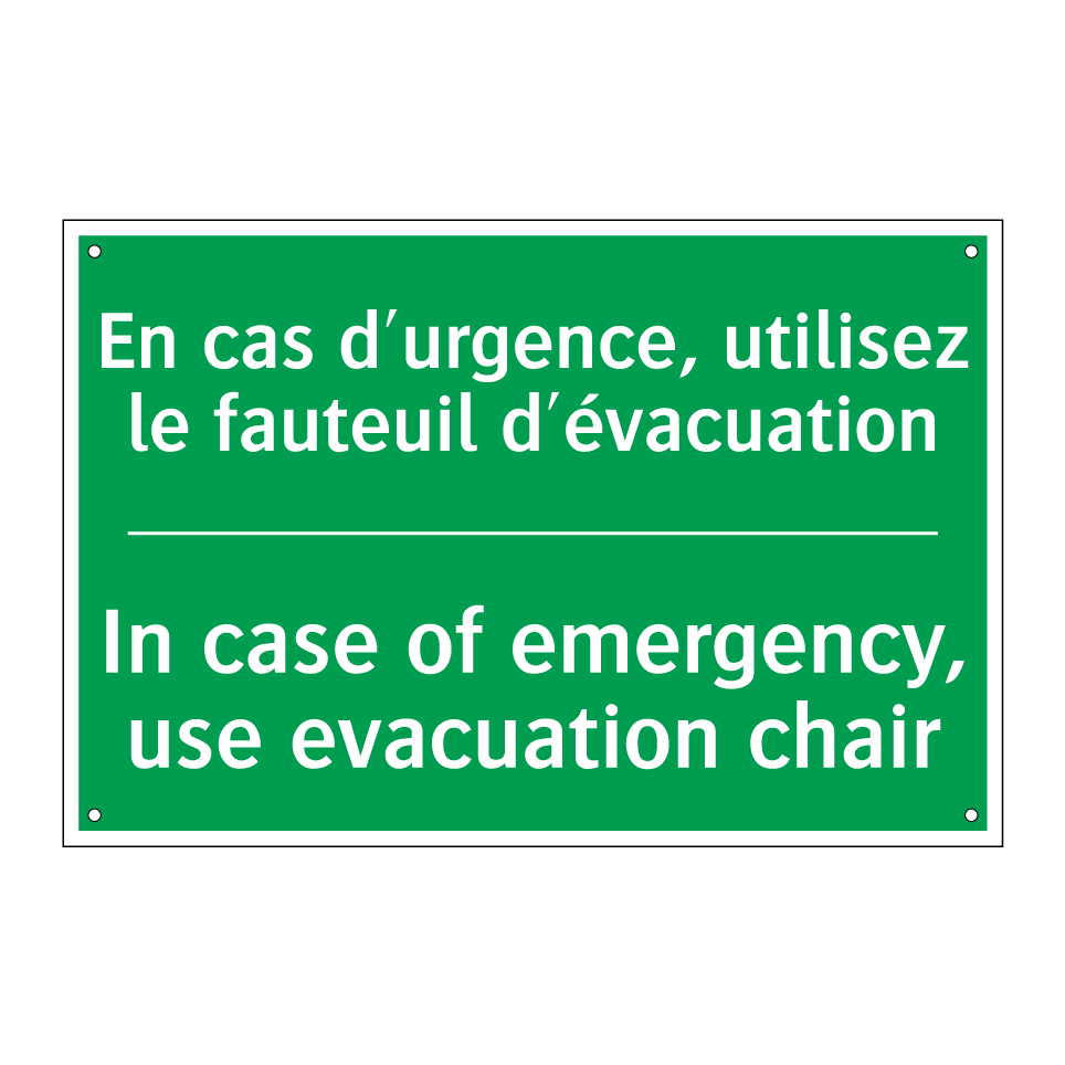 Panneau de secours bilingue avec texte en français : "En cas d'urgence, utilisez le fauteuil d'évacuation", et en anglais : "In case of emergency, use evacuation chair"