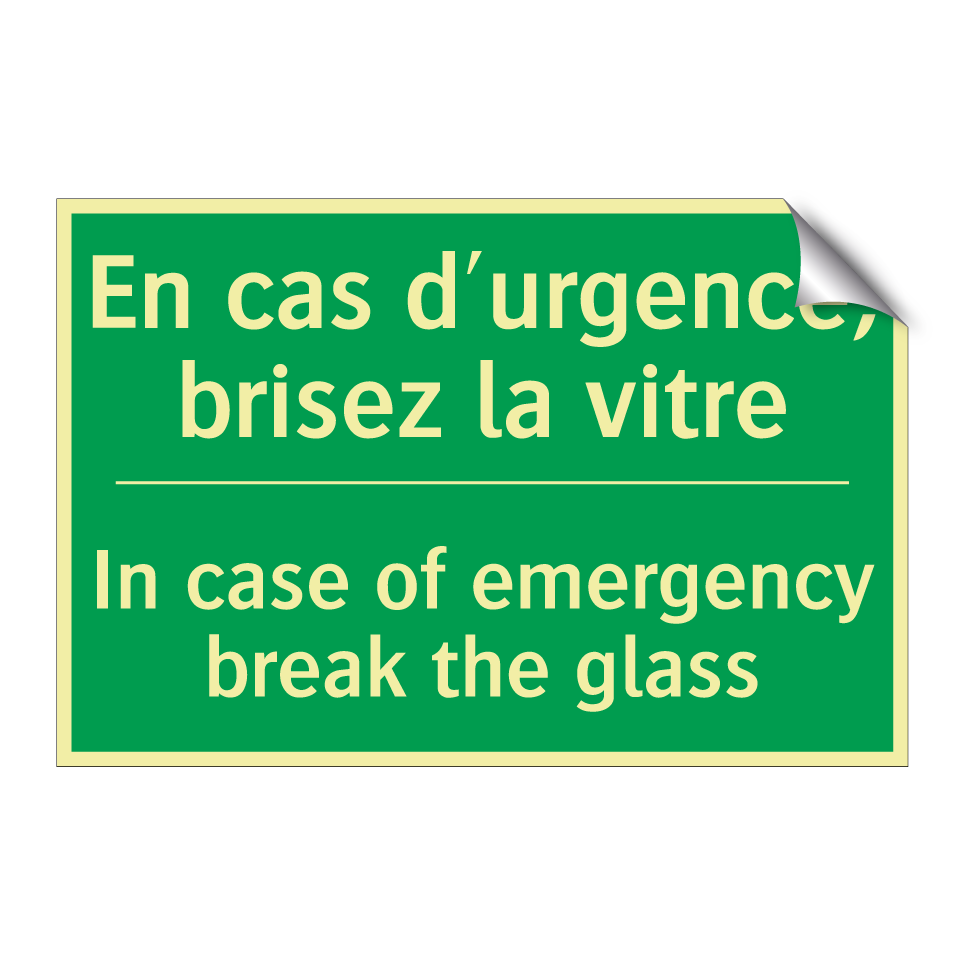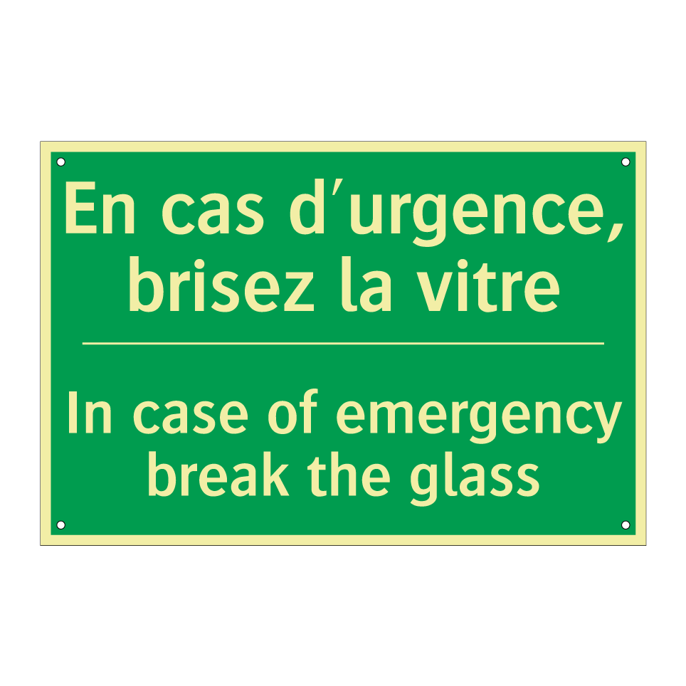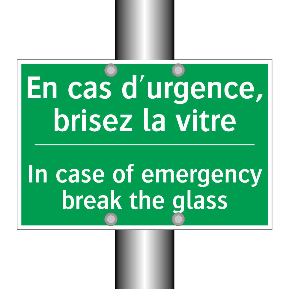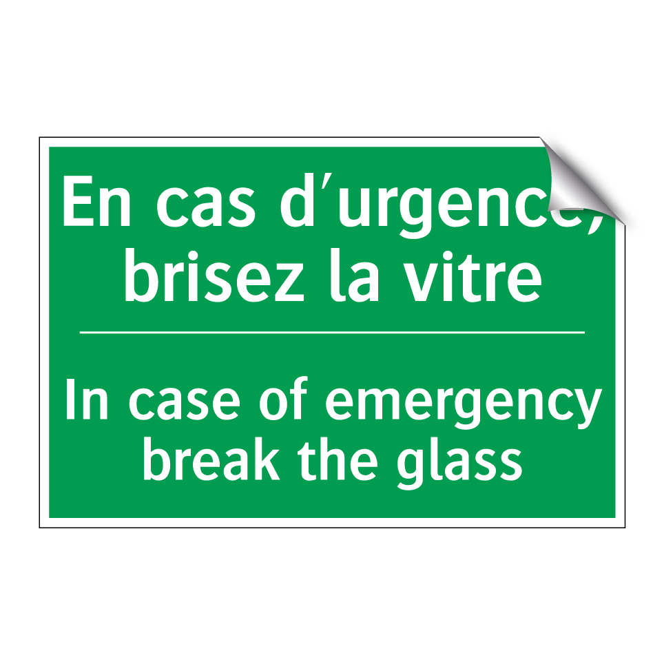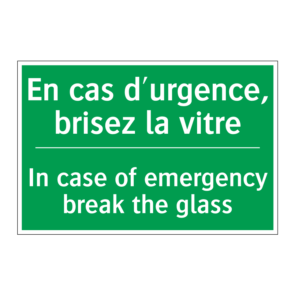 Panneau de secours bilingue avec texte en français : "En cas d'urgence, brisez la vitre", et en anglais : "In case of emergency break the glass"