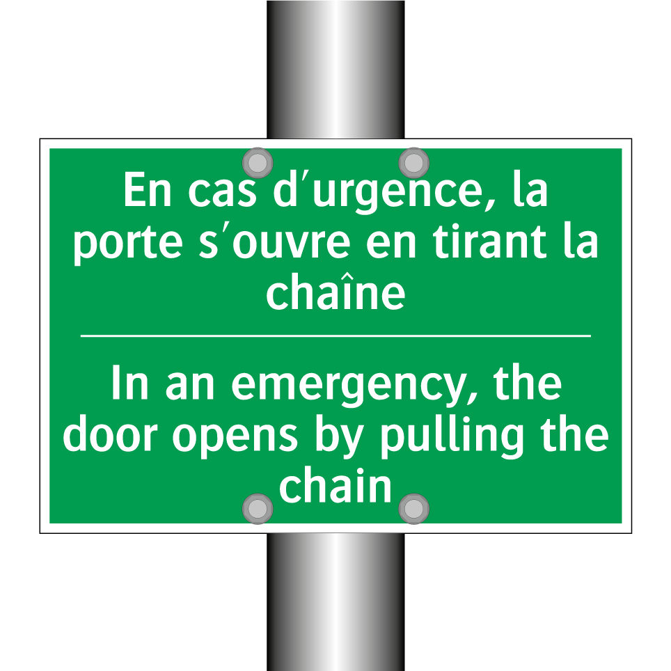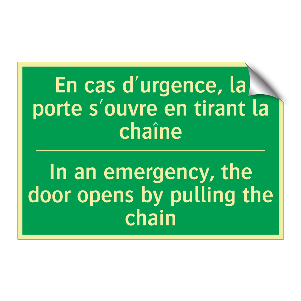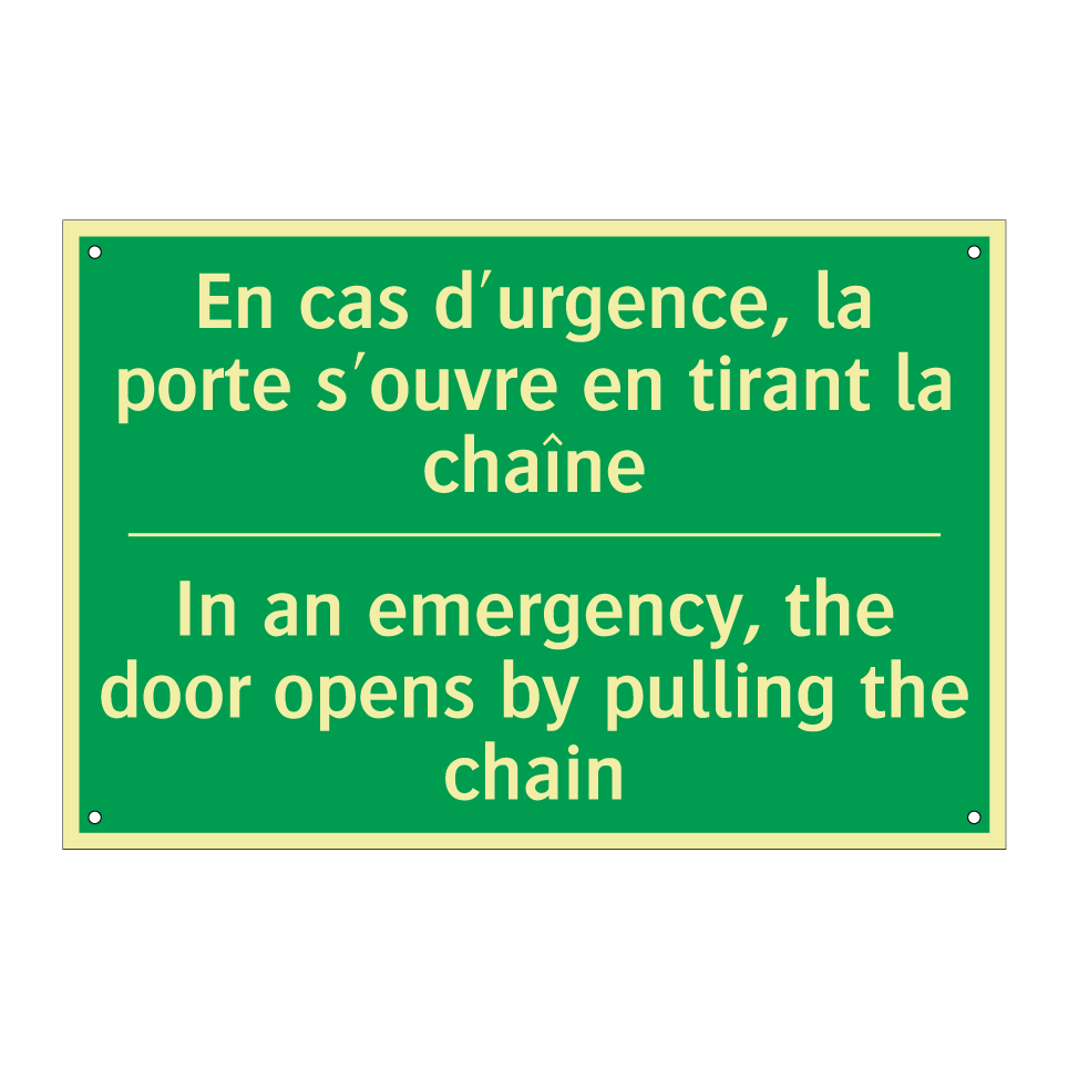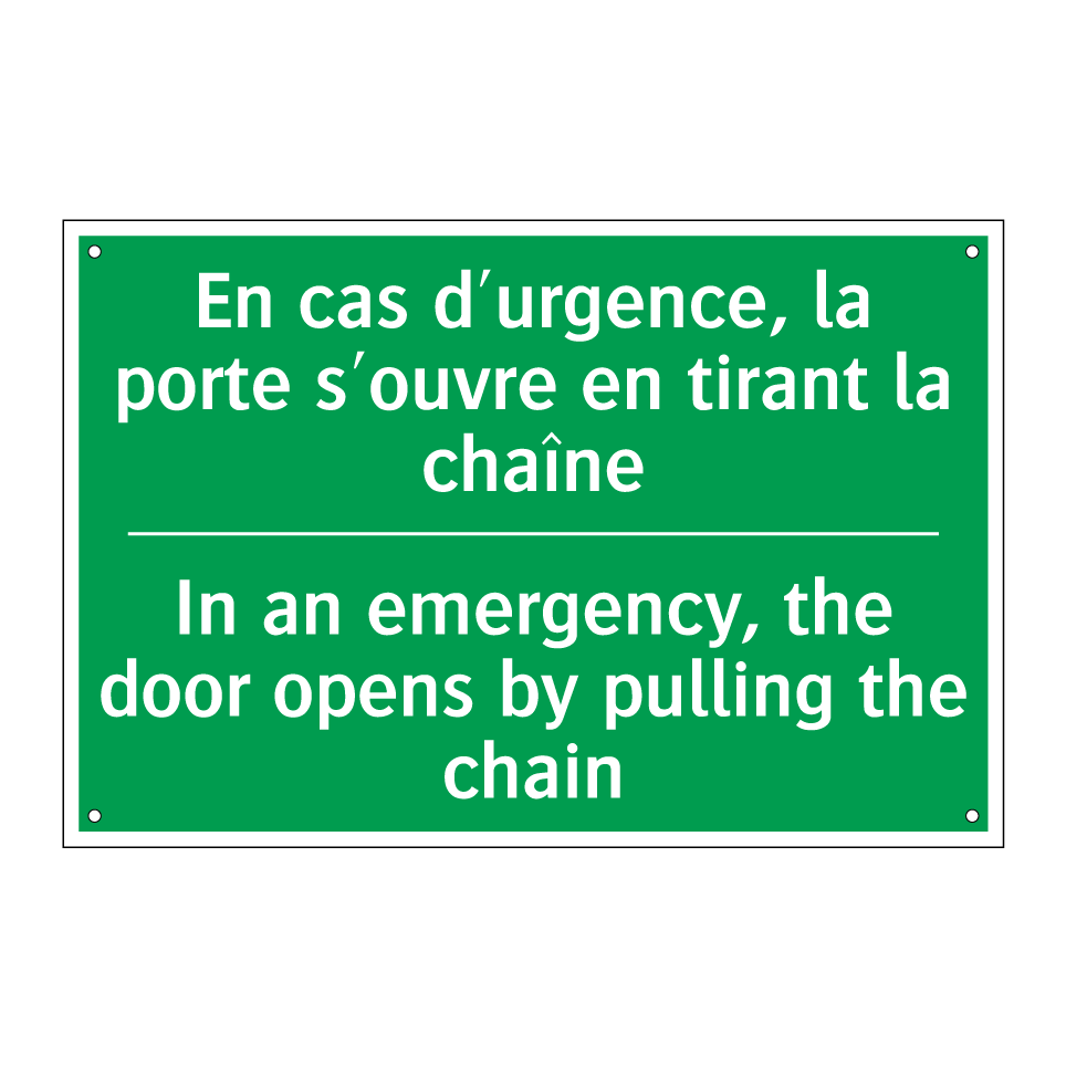 Panneau de secours bilingue avec texte en français : "En cas d'urgence, la porte s'ouvre en tirant la chaîne", et en anglais : "In an emergency, the door opens by pulling the chain"