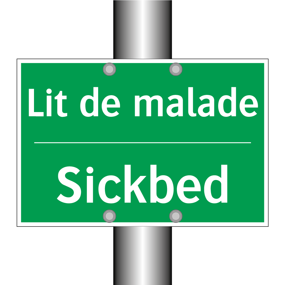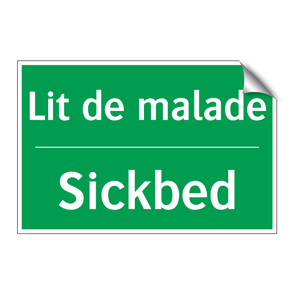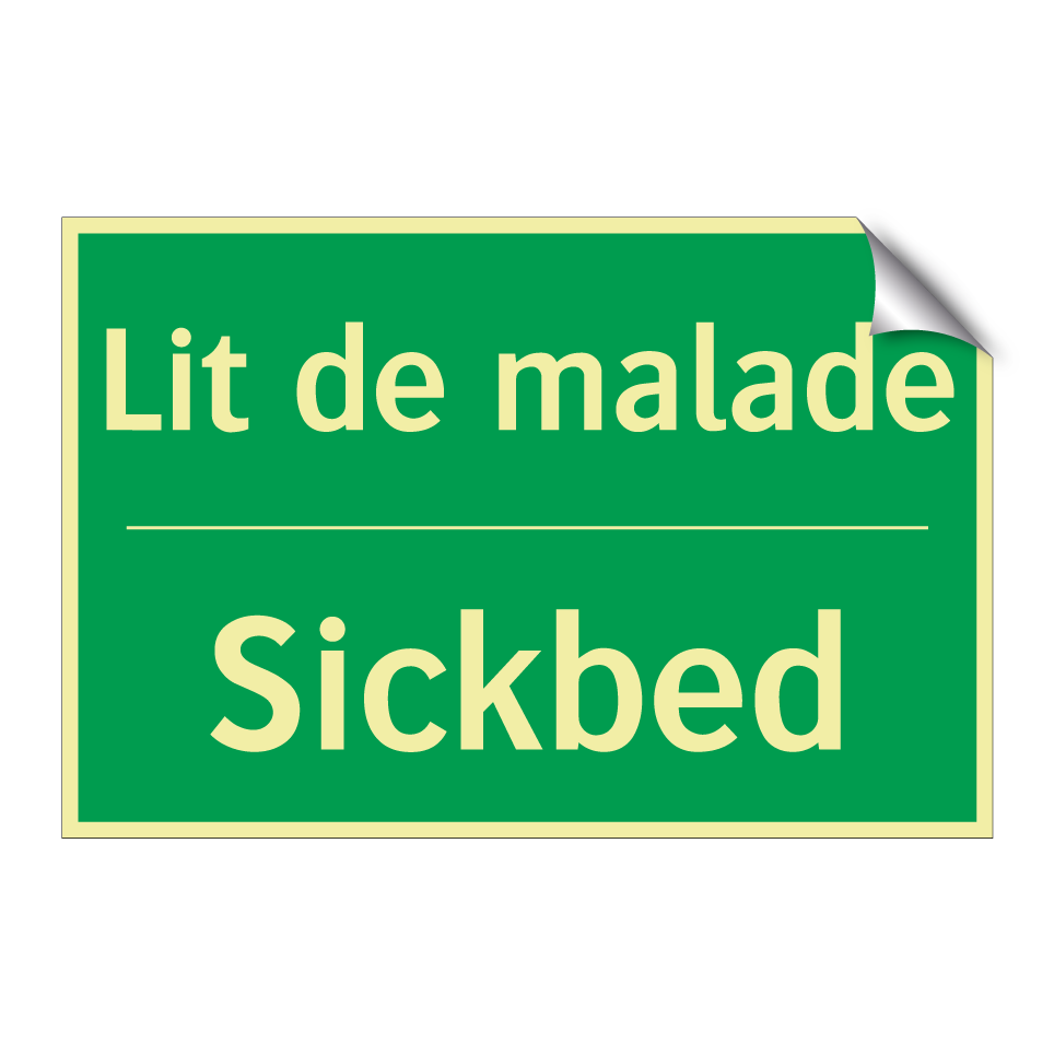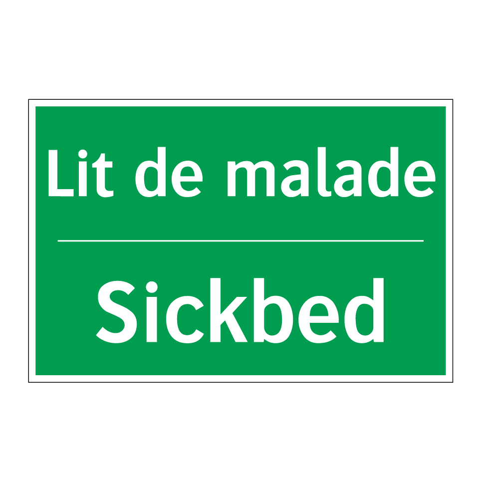 Panneau de secours bilingue avec texte en français : "Lit de malade", et en anglais : "Sickbed"