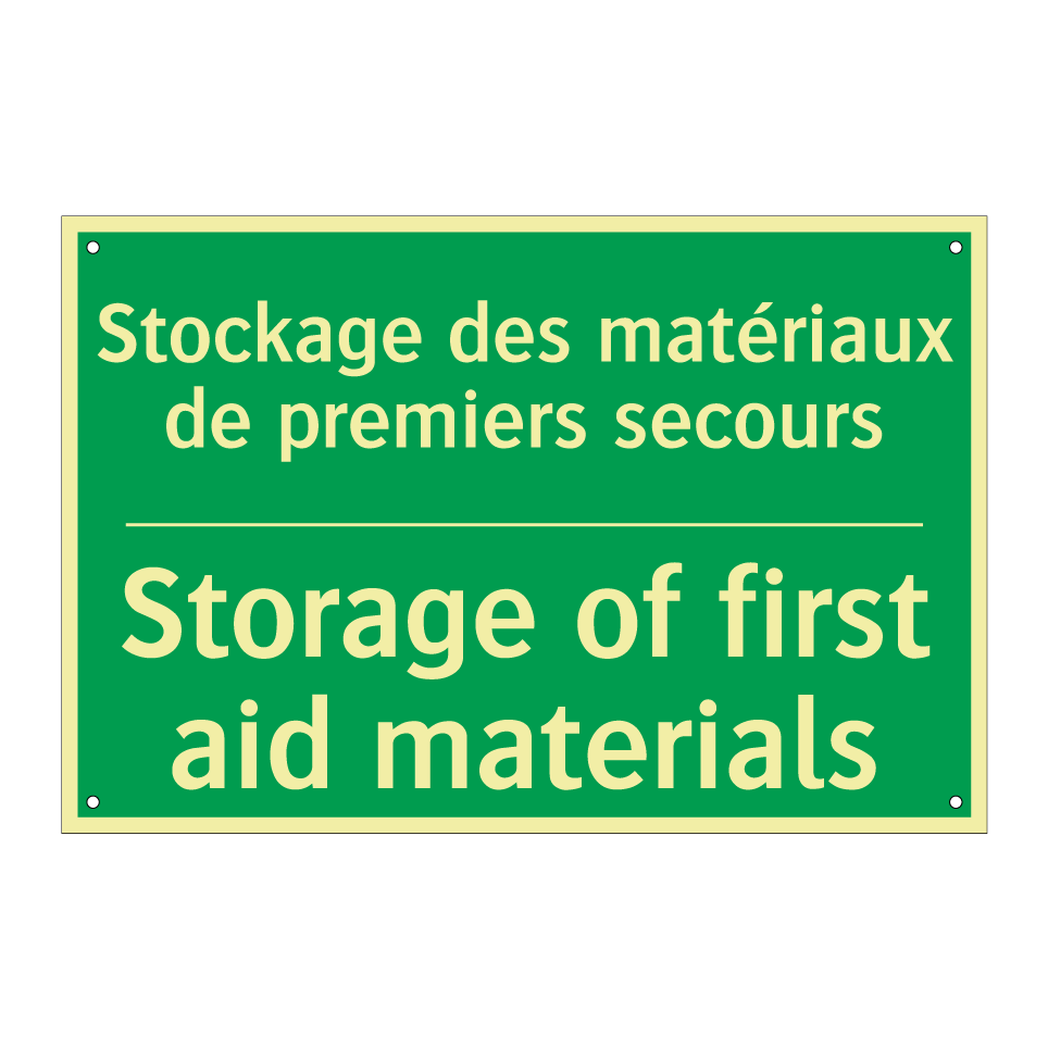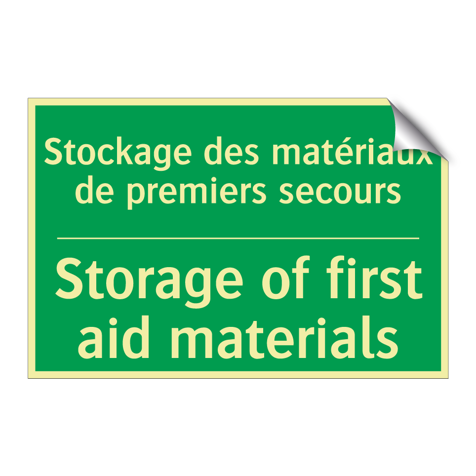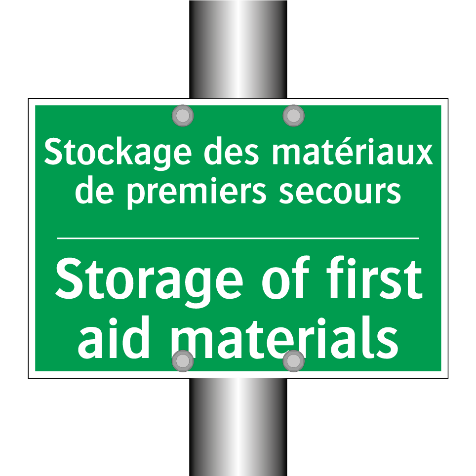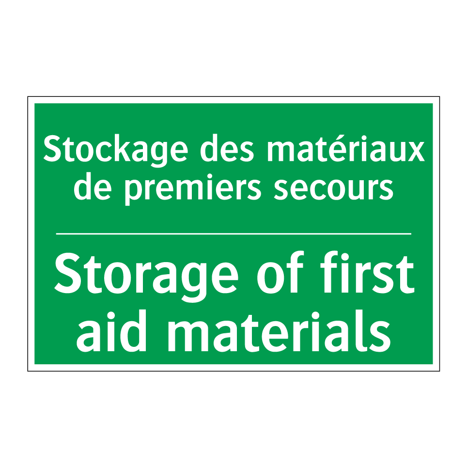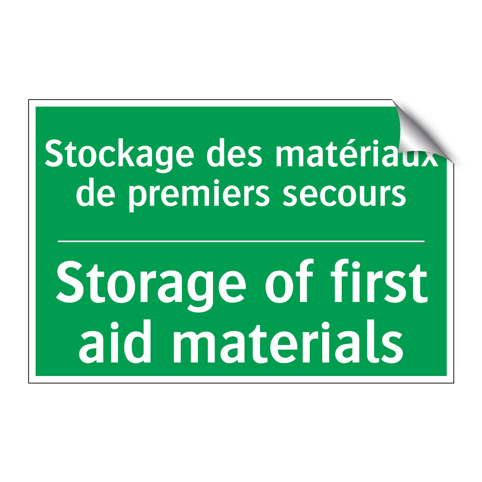 Panneau de secours bilingue avec texte en français : "Stockage des matériaux de premiers secours", et en anglais : "Storage of first aid materials"