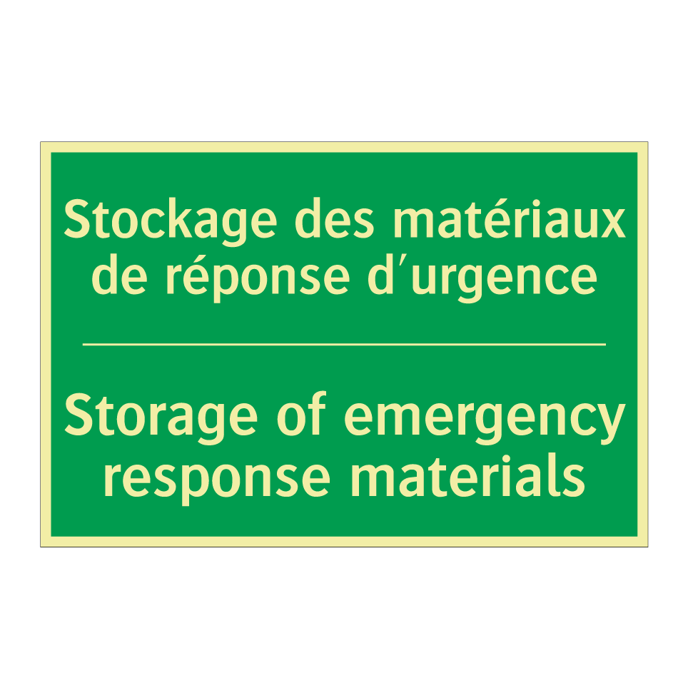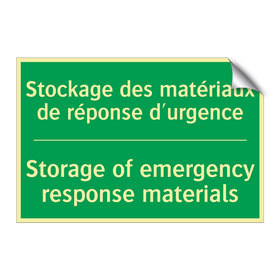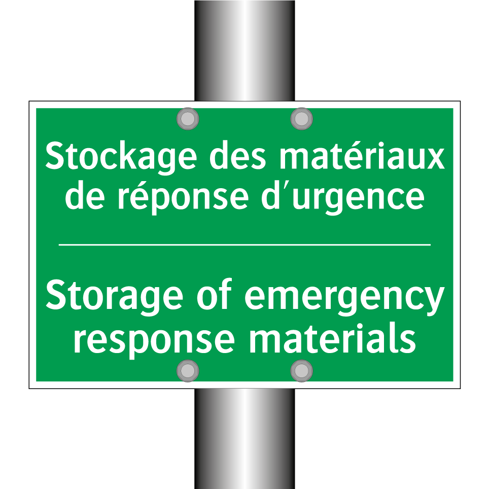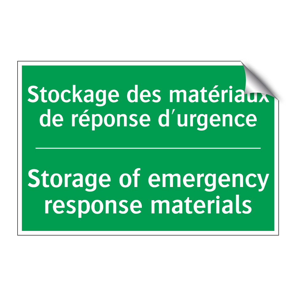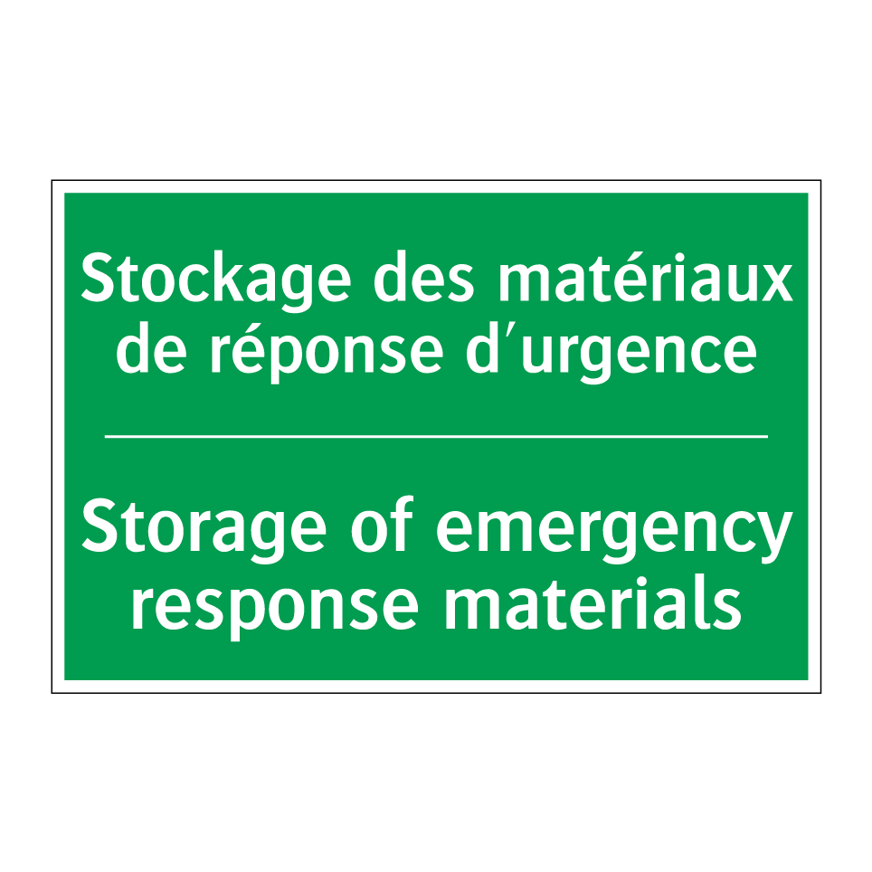Panneau de secours bilingue avec texte en français : "Stockage des matériaux de réponse d'urgence", et en anglais : "Storage of emergency response materials"