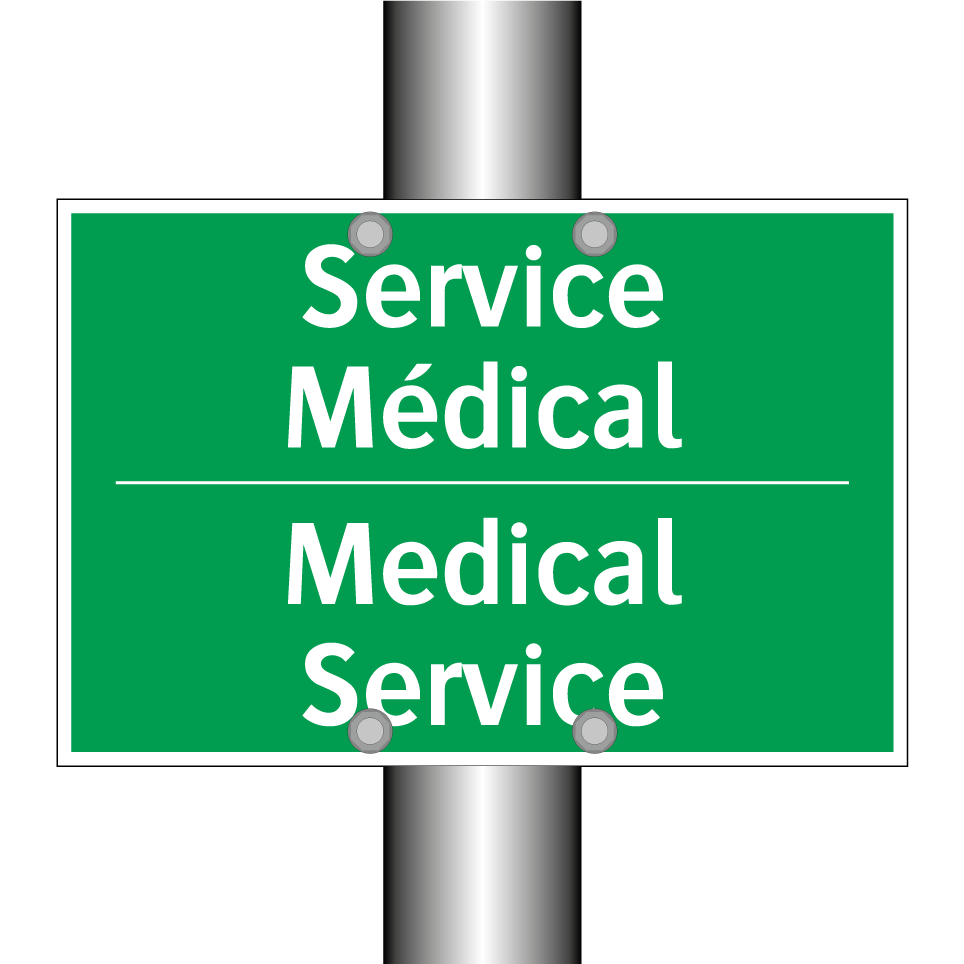 Panneau de secours bilingue avec texte en français : "Service Médical", et en anglais : "Medical Service"