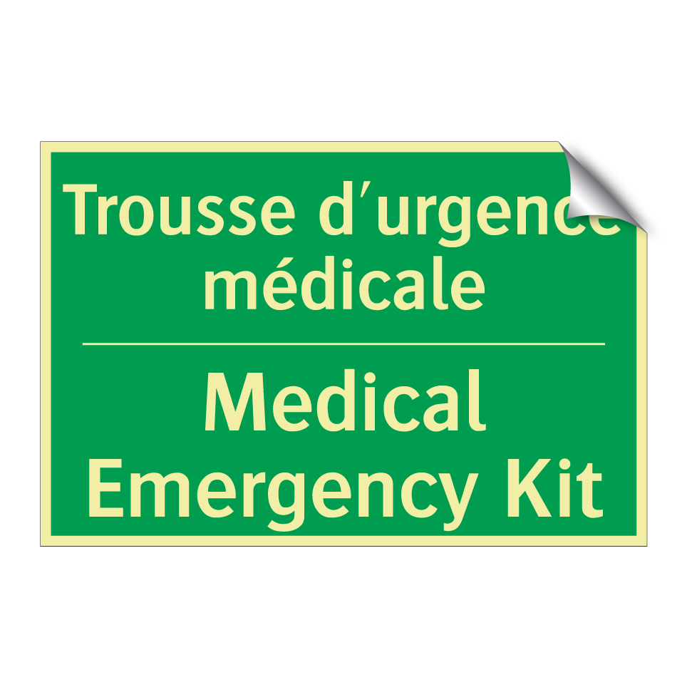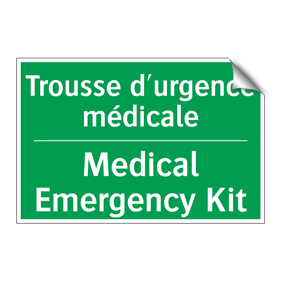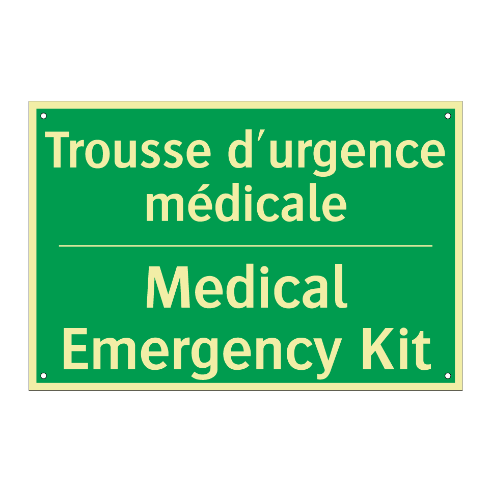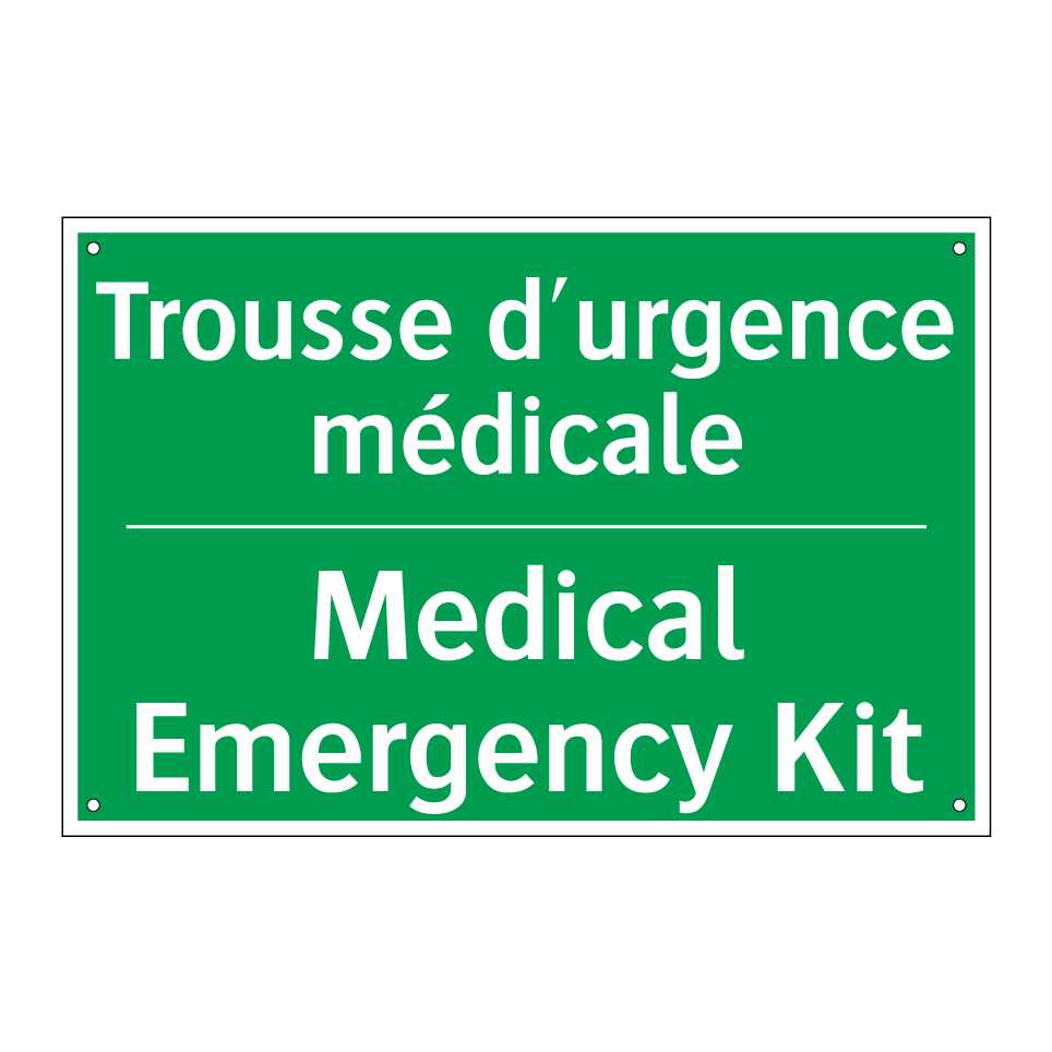 Panneau de secours bilingue avec texte en français : "Trousse d'urgence médicale", et en anglais : "Medical Emergency Kit"
