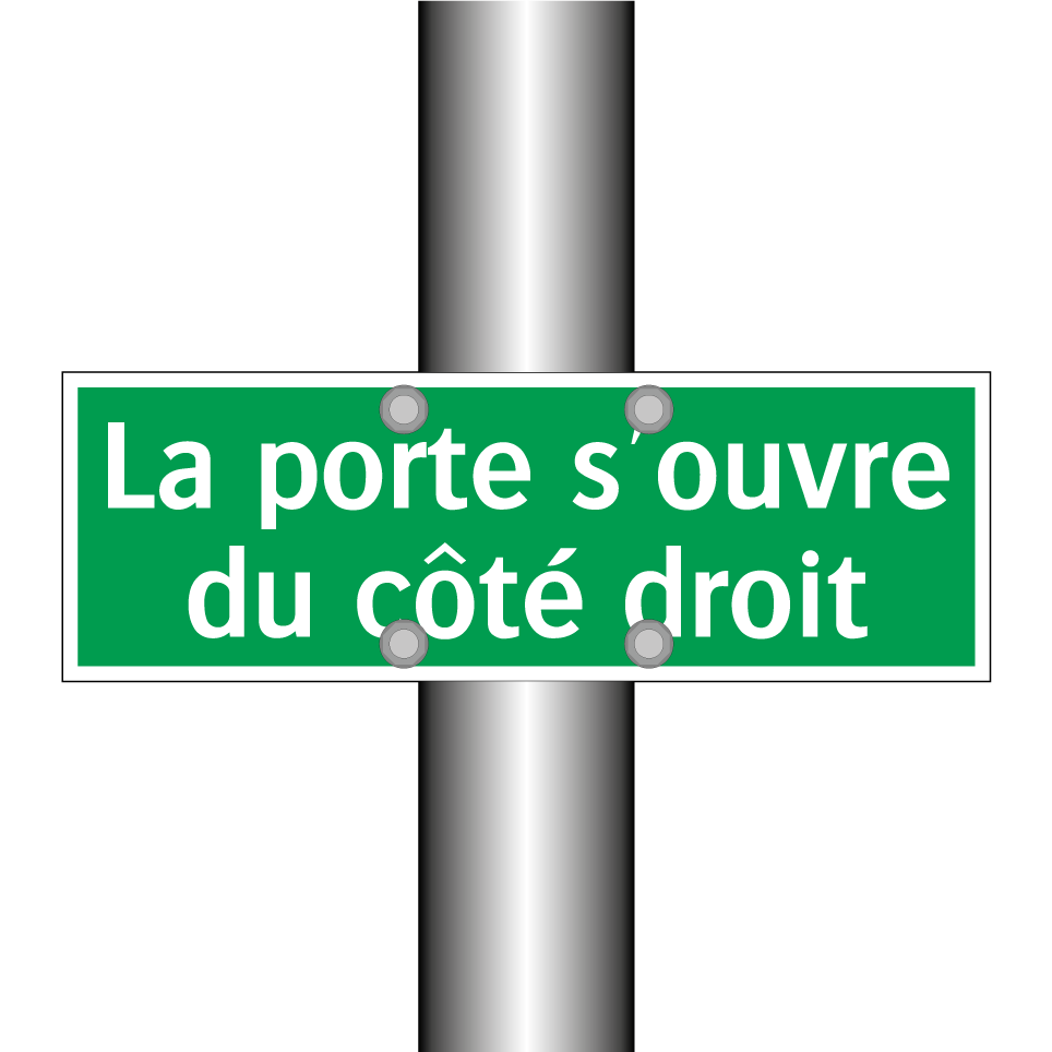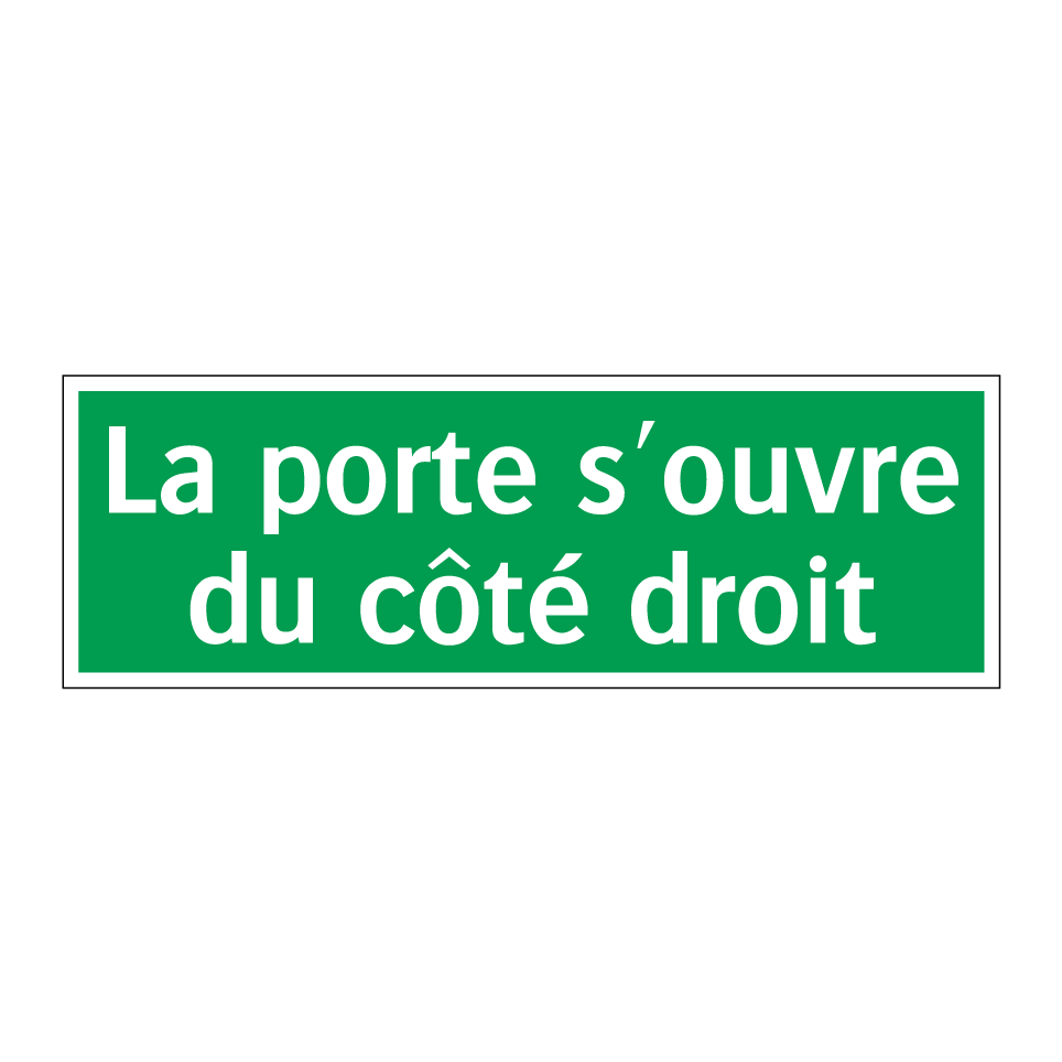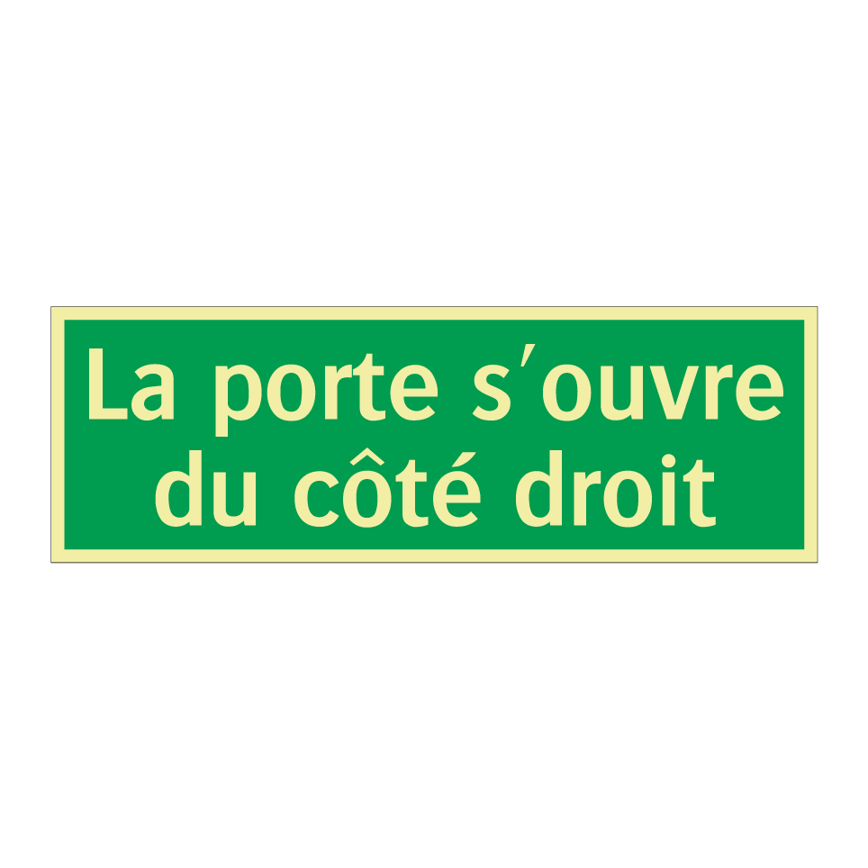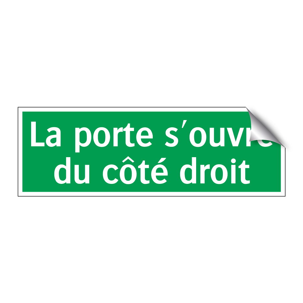 Panneau de secours avec le texte La porte s'ouvre du côté droit