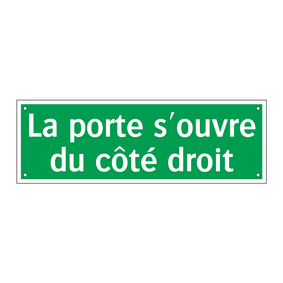 Cette enseigne de sécurité, avec son fond vert et son texte blanc, est idéale pour indiquer la direction d'ouverture d'une porte en cas d'urgence. Elle est conçue pour être placée dans des bâtiments publics, des bureaux ou des espaces industriels où la sécurité est primordiale. Grâce à son message clair en français, elle guide efficacement les personnes vers la sortie en signalant que la porte s'ouvre vers la droite. Installez-la à proximité des issues de secours pour garantir une évacuation rapide et sécurisée.