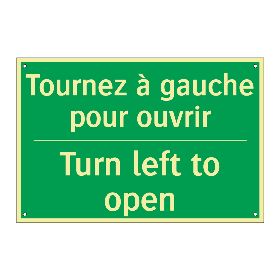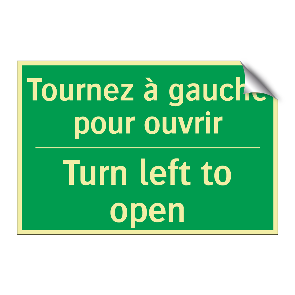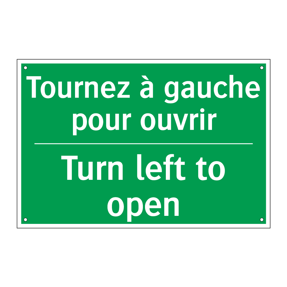 Panneau de secours bilingue avec texte en français : "Tournez à gauche pour ouvrir", et en anglais : "Turn left to open"