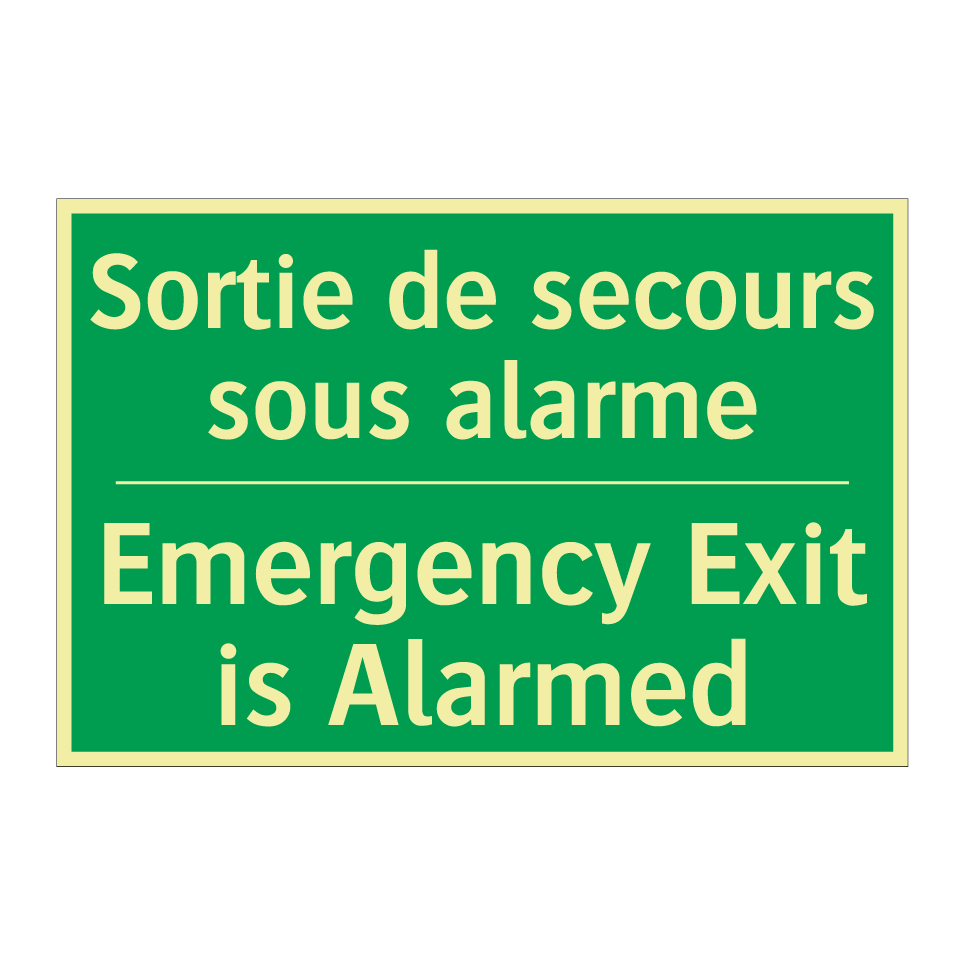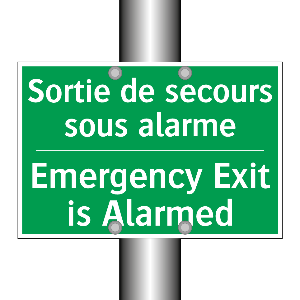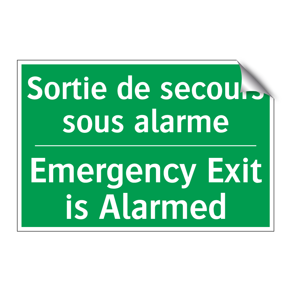 Panneau de secours bilingue avec texte en français : "Sortie de secours sous alarme", et en anglais : "Emergency Exit is Alarmed"