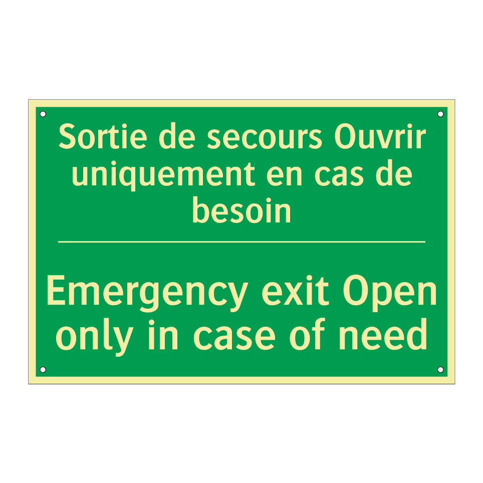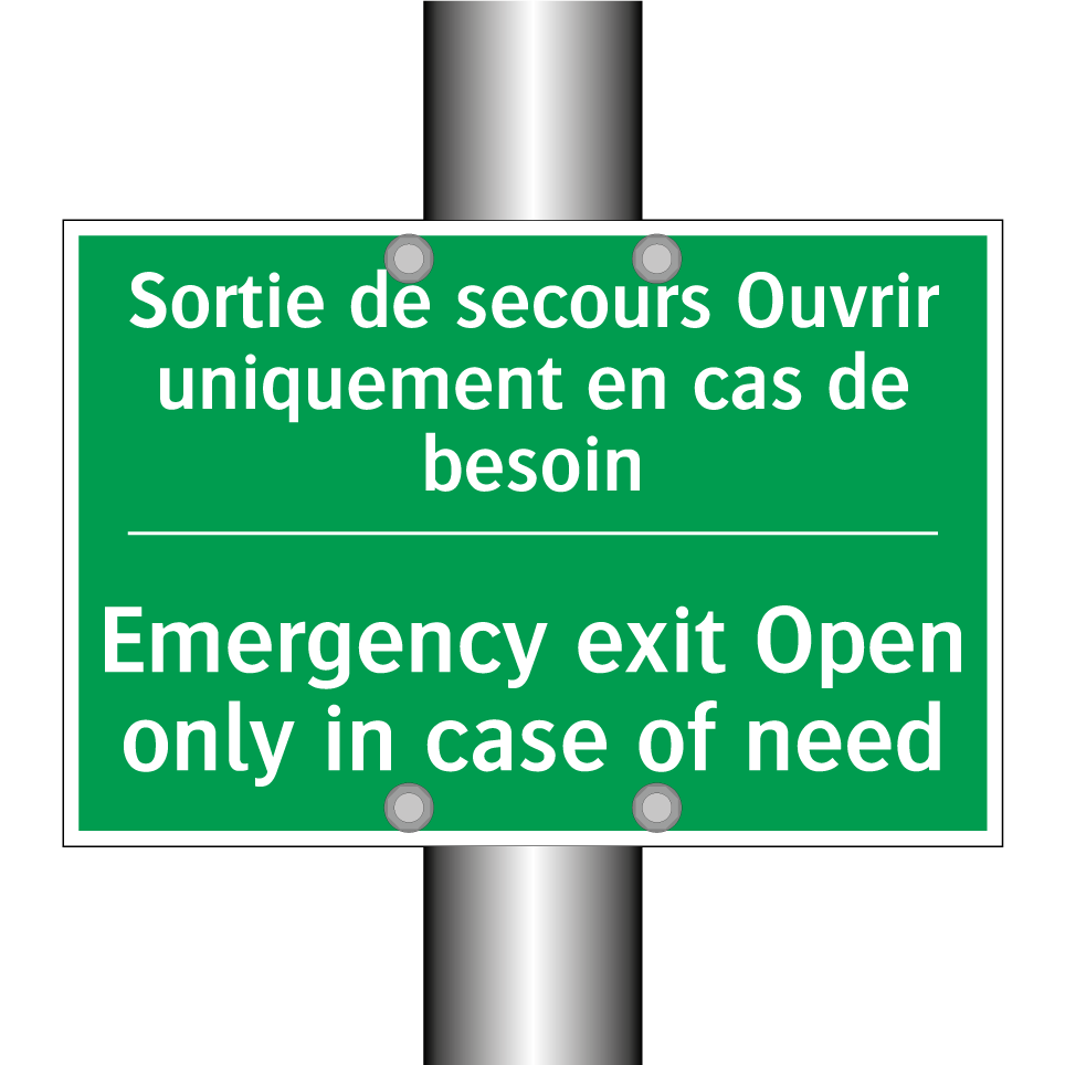 Panneau de secours bilingue avec texte en français : "Sortie de secours Ouvrir uniquement en cas de besoin", et en anglais : "Emergency exit Open only in case of need"