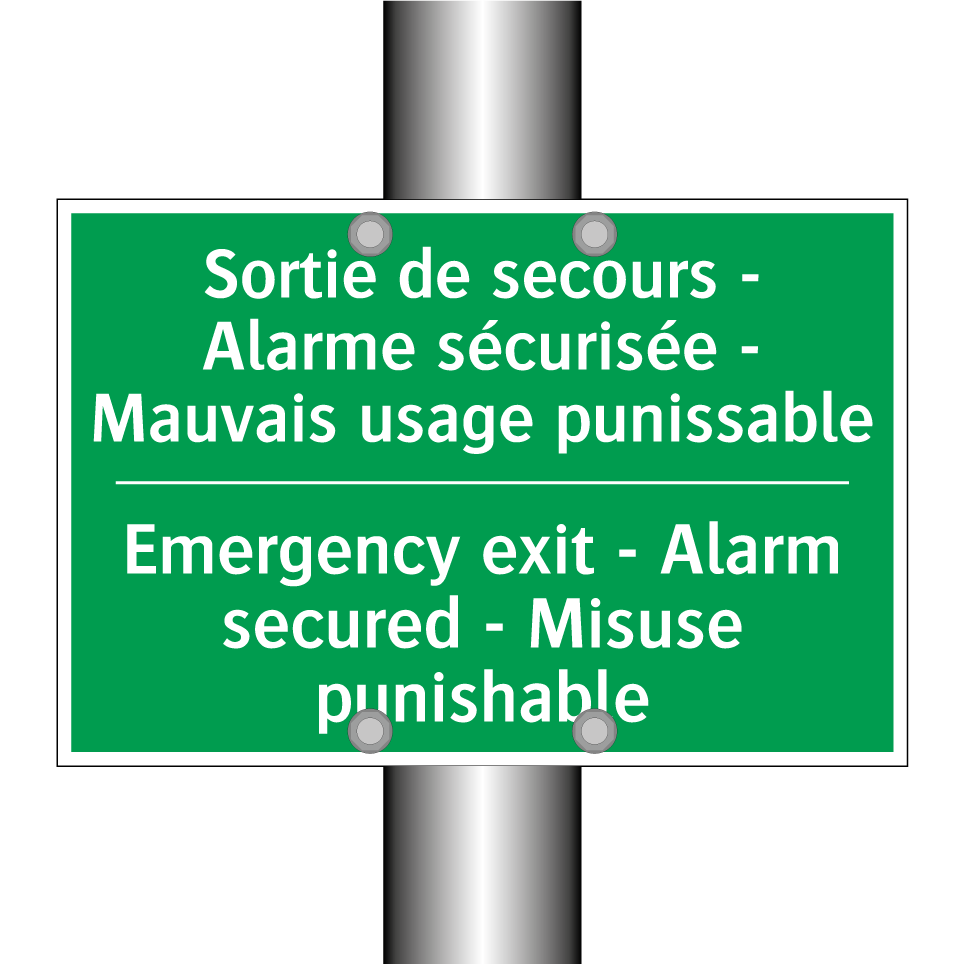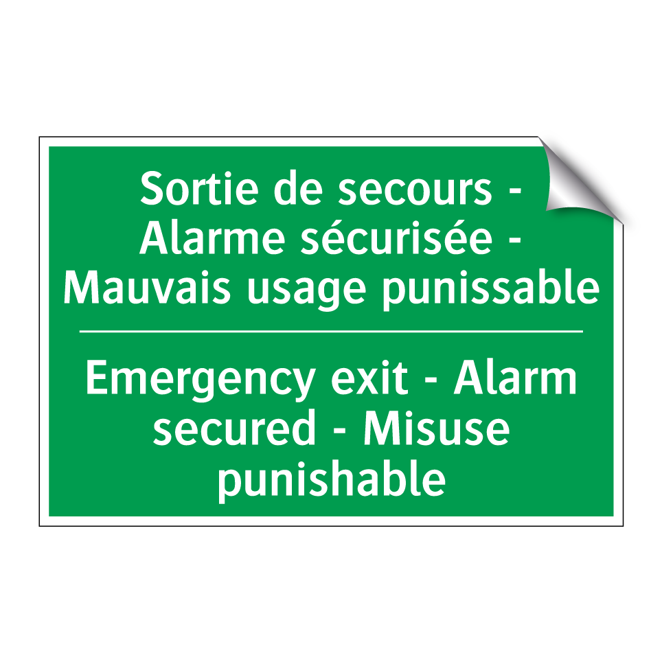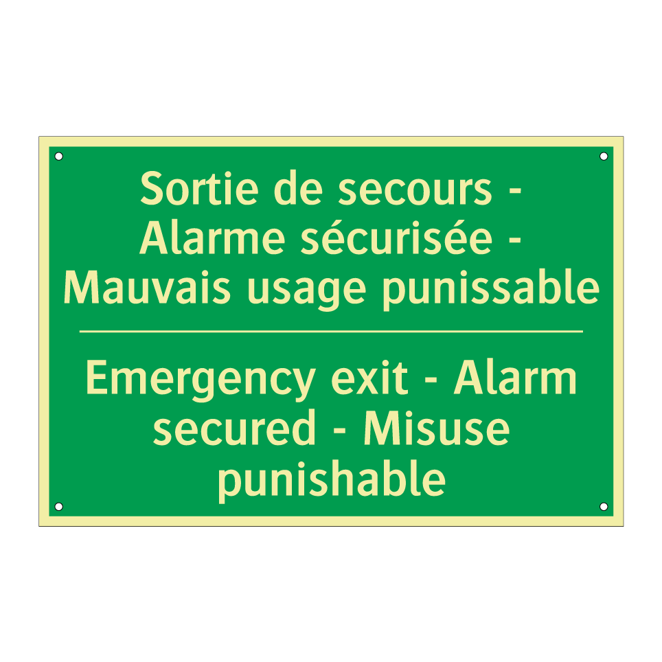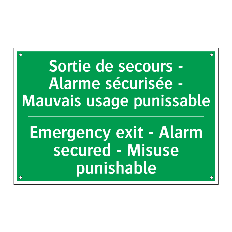 Panneau de secours bilingue avec texte en français : "Sortie de secours - Alarme sécurisée - Mauvais usage punissable", et en anglais : "Emergency exit - Alarm secured - Misuse punishable"
