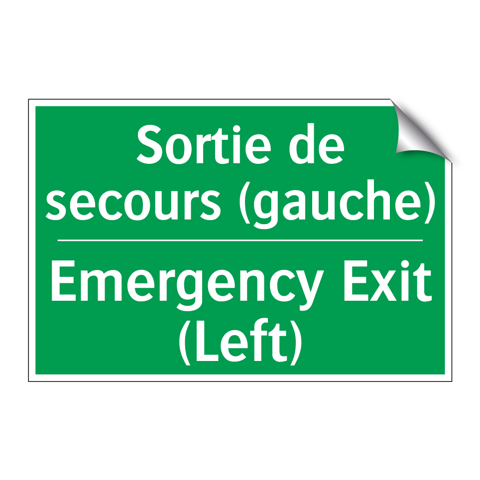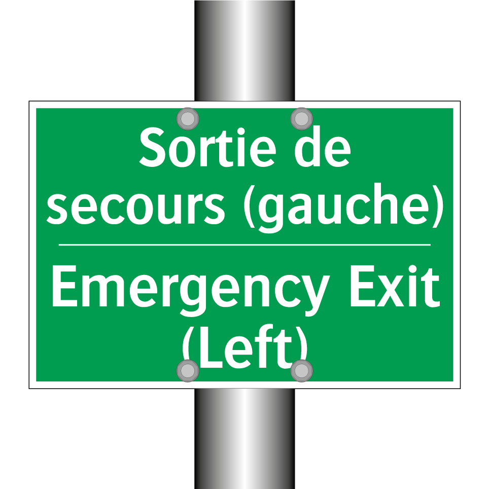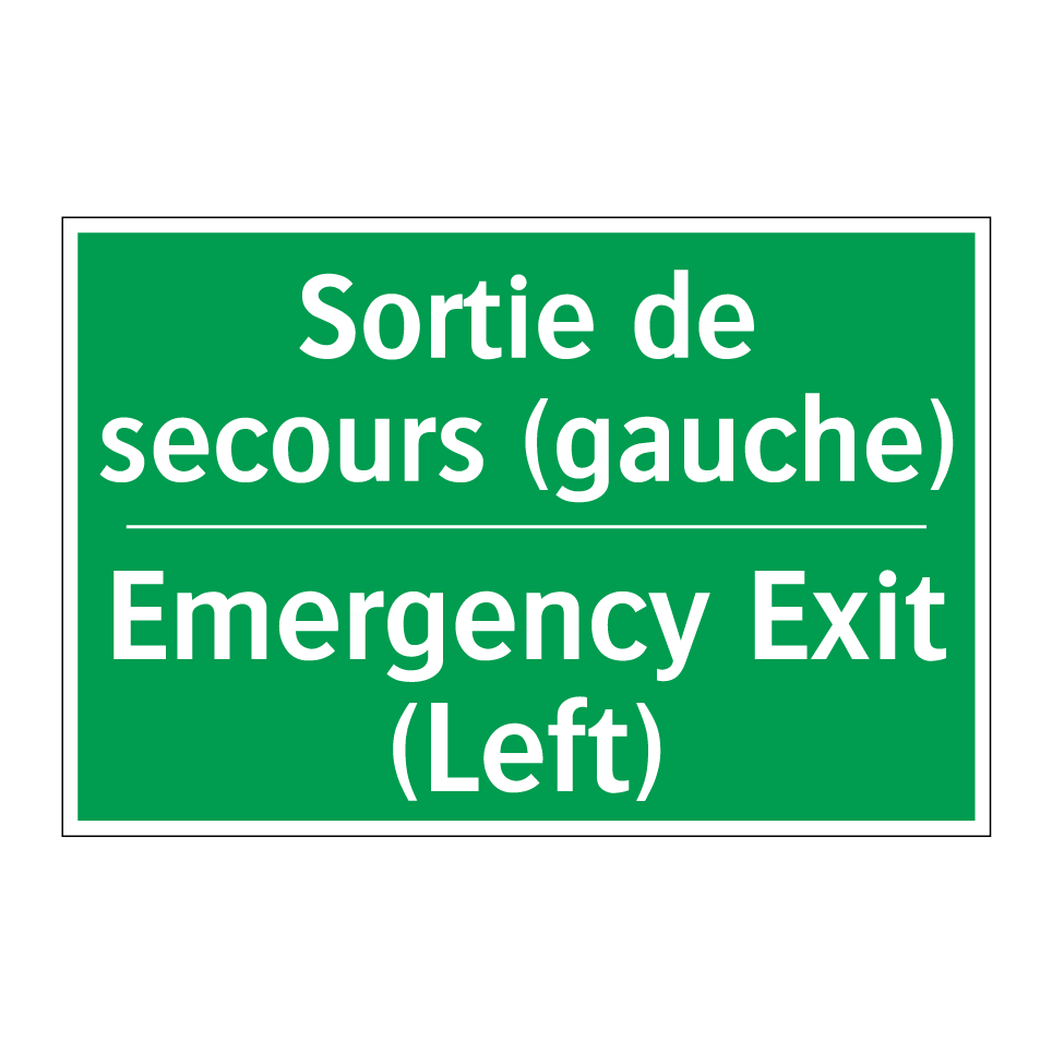 Panneau de secours bilingue avec texte en français : "Sortie de secours (gauche)", et en anglais : "Emergency Exit (Left)"